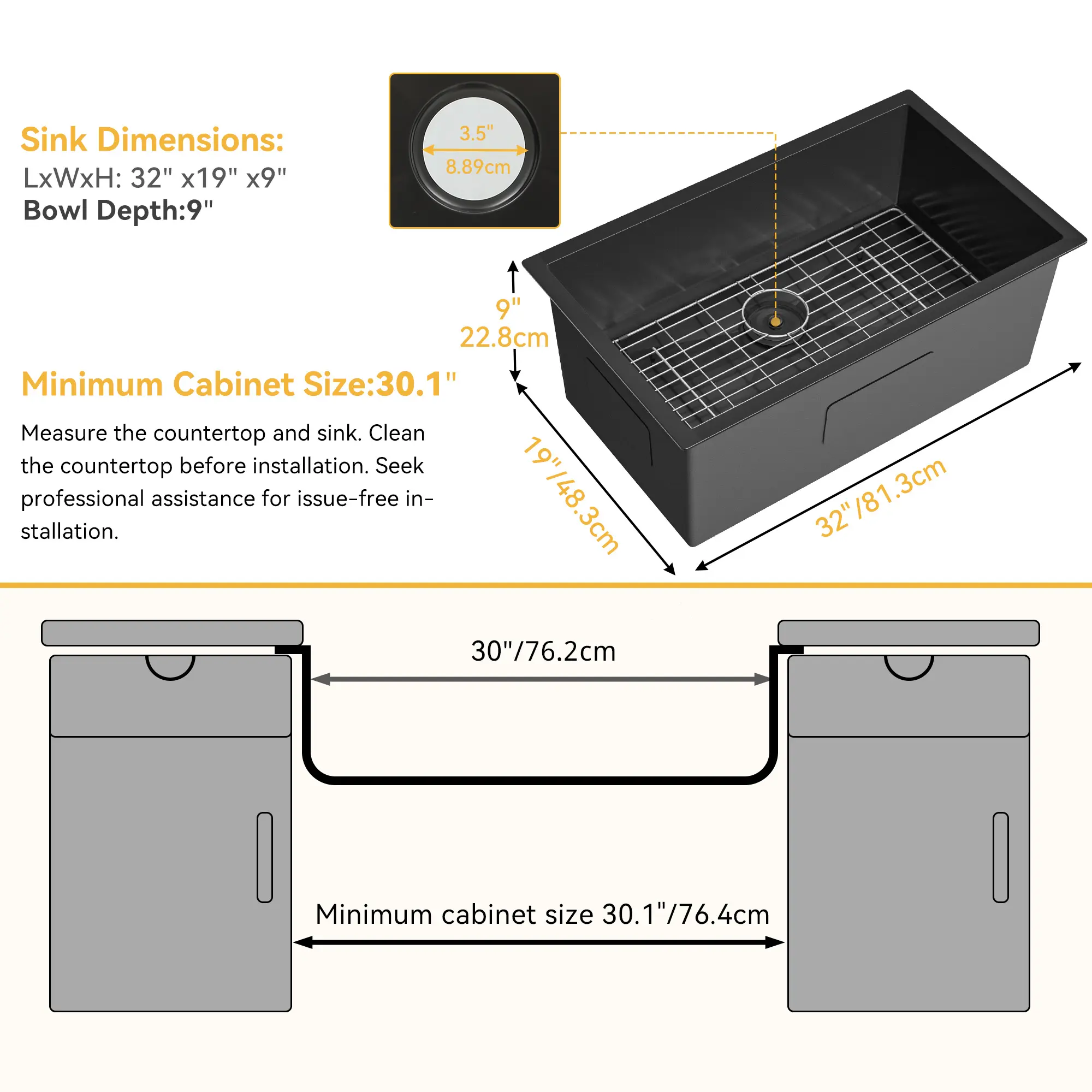 32*19*10in The undermount sink offers ample space with its 32" x 19" x 10" dimensions, featuring small radius corners for a modern look; The standard 3.5-inch drain opening fits any garbage disposal; Comes with a dish grid, basket strainer drain, and S-shaped water hose for added convenience