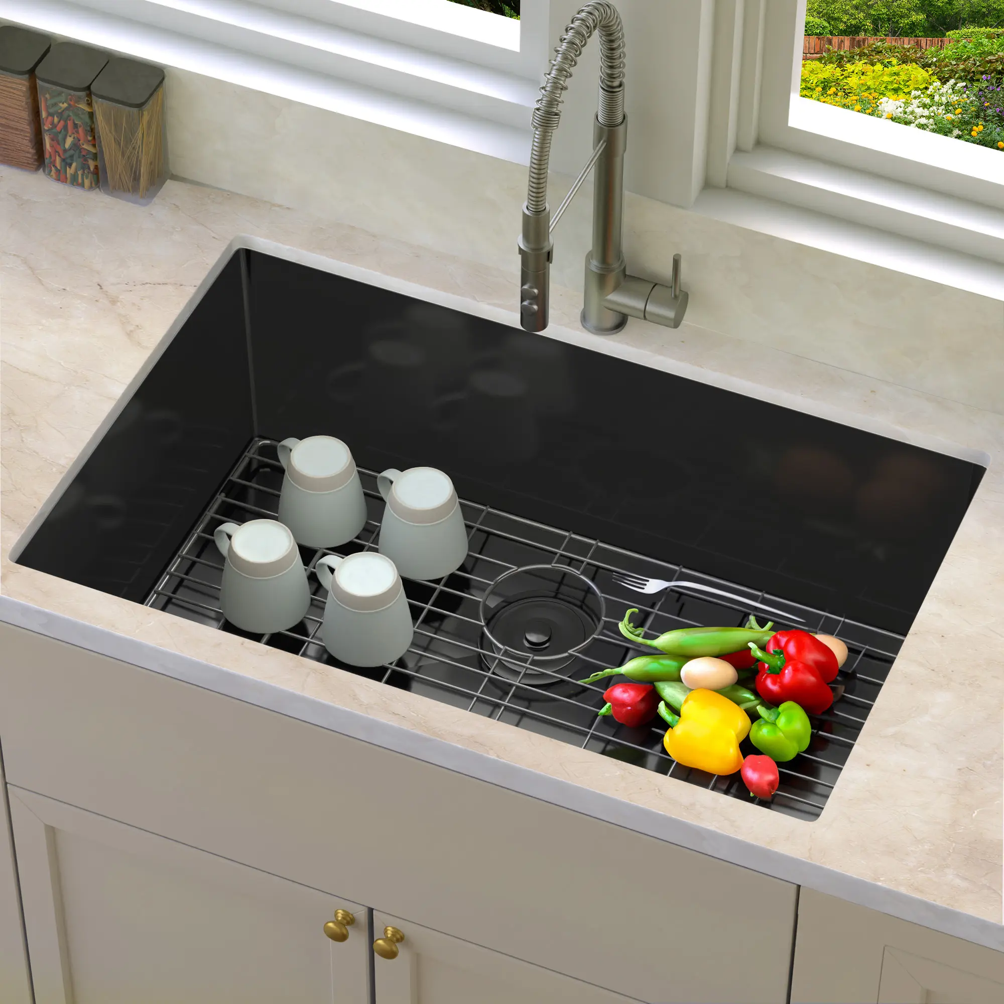 30*18*10in The undermount sink offers ample space with its 30" x 18" x 10" dimensions, featuring small radius corners for a modern look; The standard 3.5-inch drain opening fits any garbage disposal; Comes with a dish grid, basket strainer drain, and S-shaped water hose for added convenience