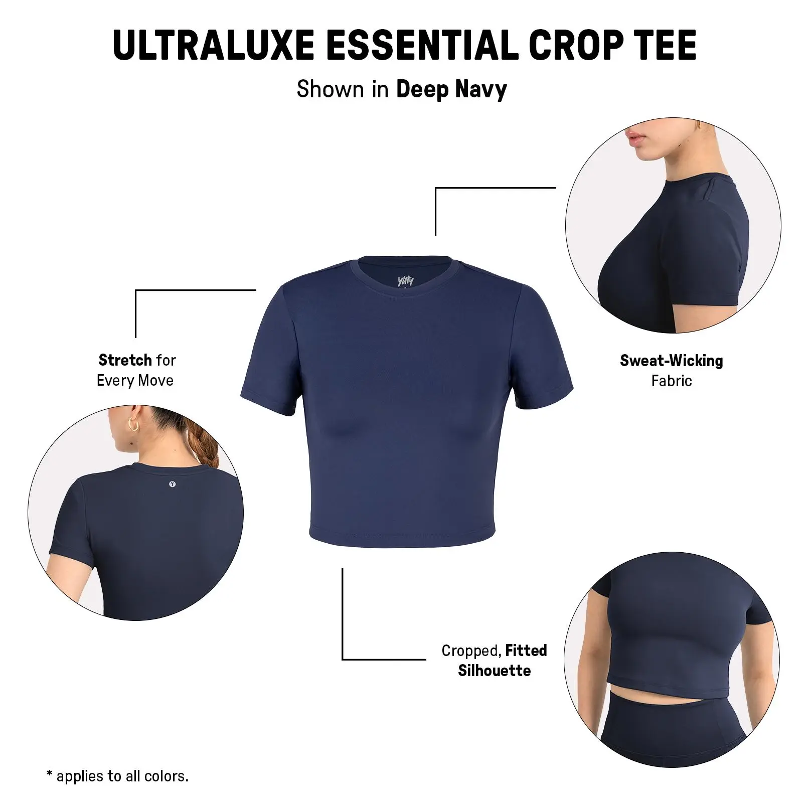 Meet the tee that works as hard as you do. The UltraLuxe Cropped Yoga Tee is crafted from breathable, sweat-wicking fabric with buttery-soft 4-way stretch. Its flattering, fitted silhouette and perfectly cropped length make it ideal for pairing with high-rise leggings or biker shorts.