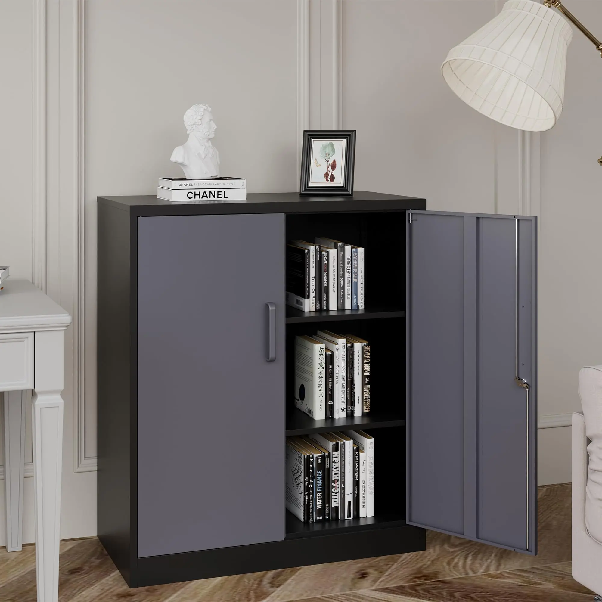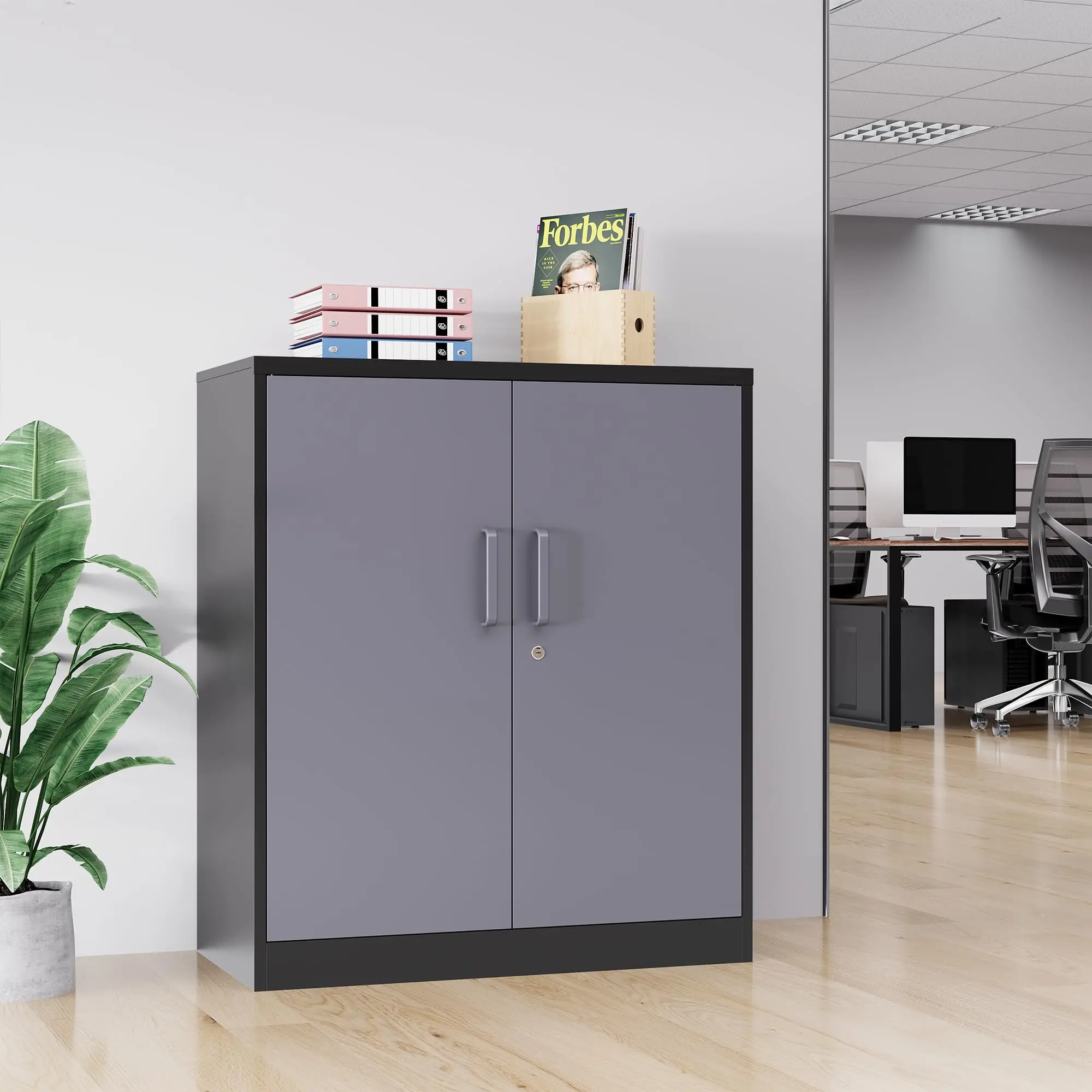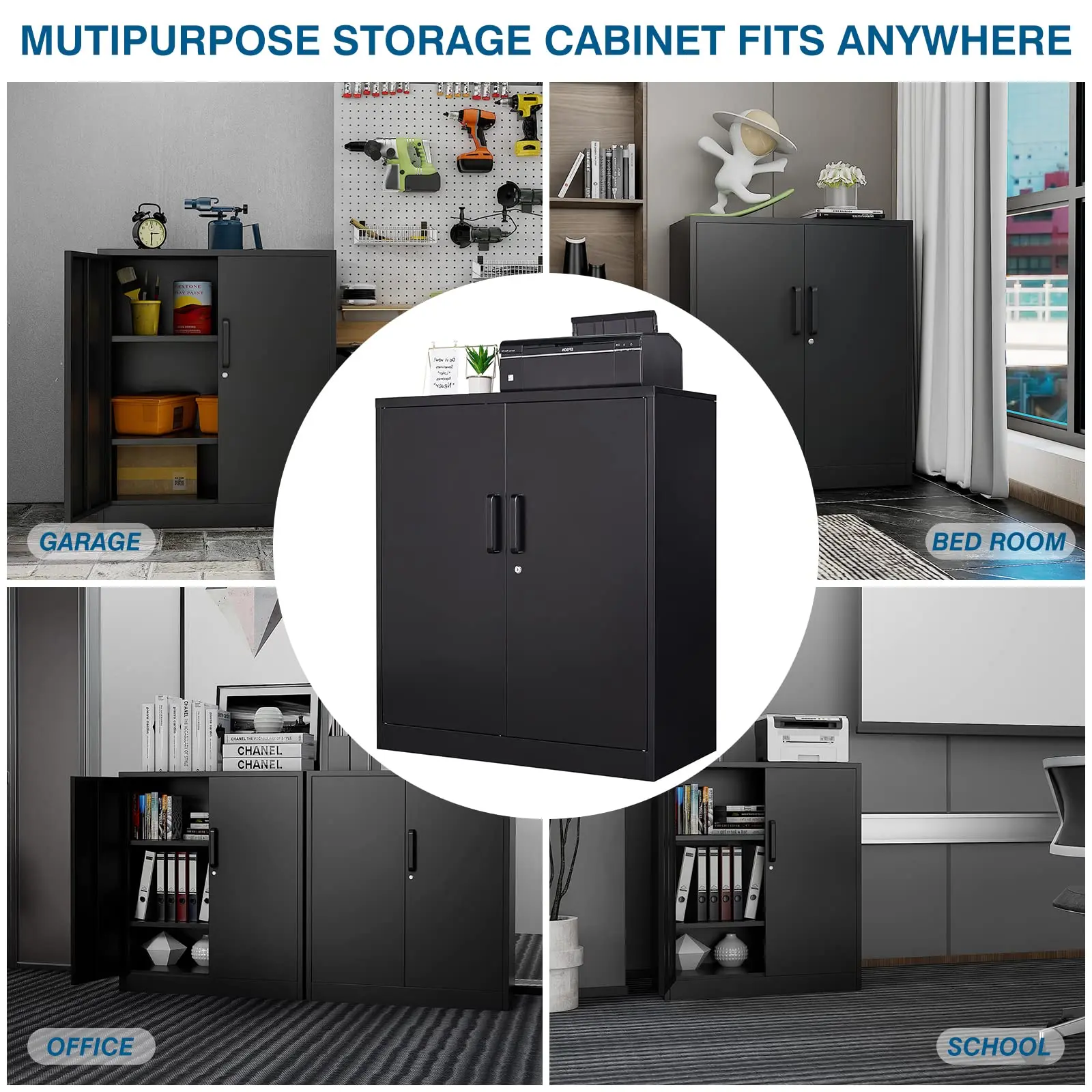 This locking steel storage cabinet is suitable for office, home, school, archives, garages, basements, and any place requiring secure storage.