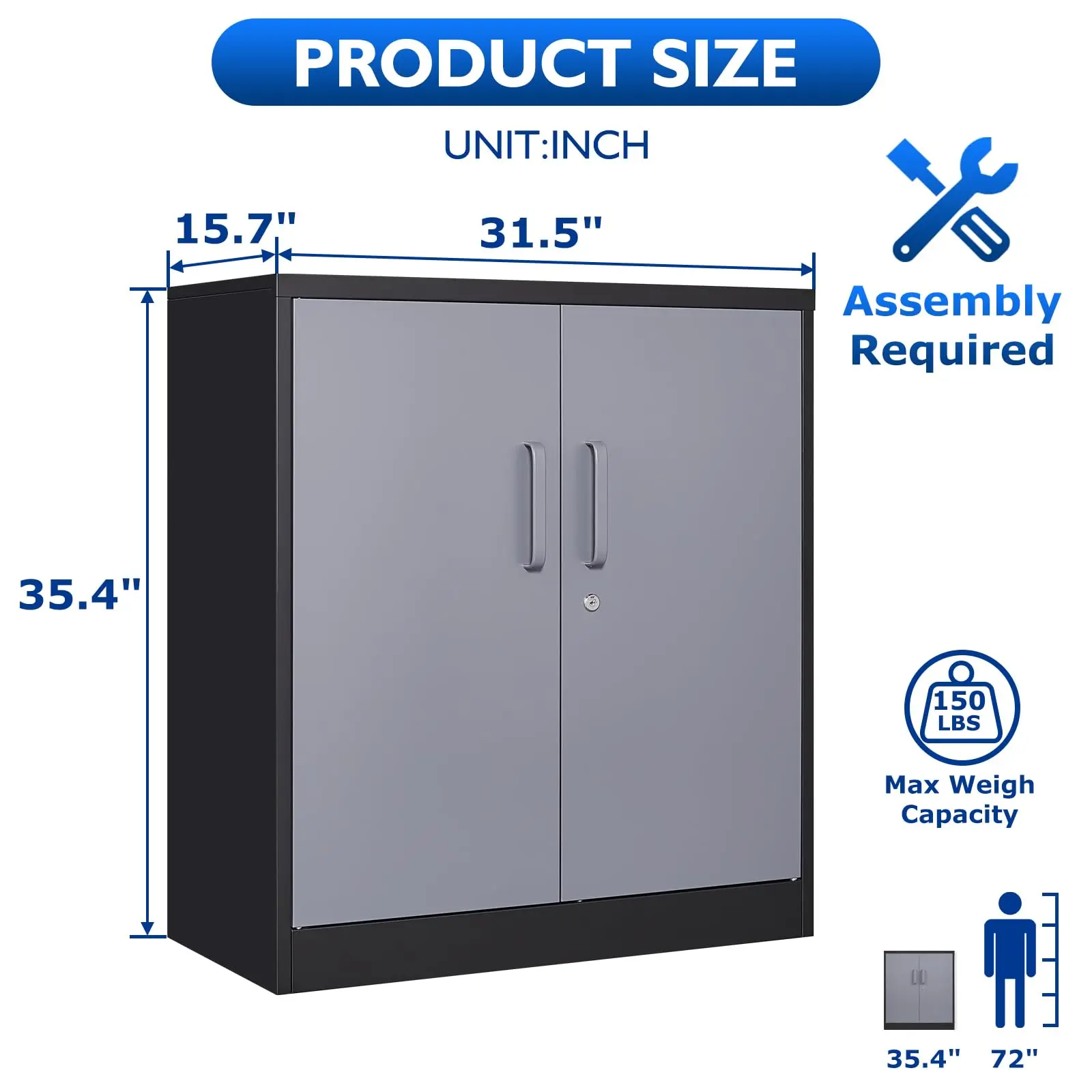 The metal garage cabinet requires assembly and takes about 30 minutes. Each package includes detailed assembly instructions.
