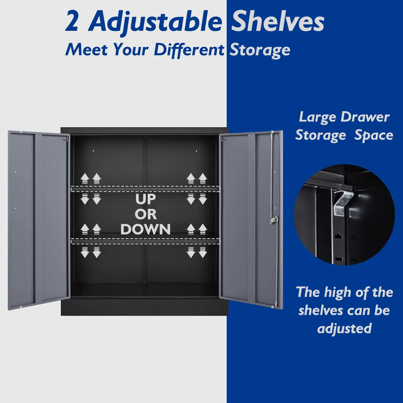 With two adjustable shelves, each shelf can hold up to 120 lbs. This cabinet is perfect for organizing and concealing your belongings.