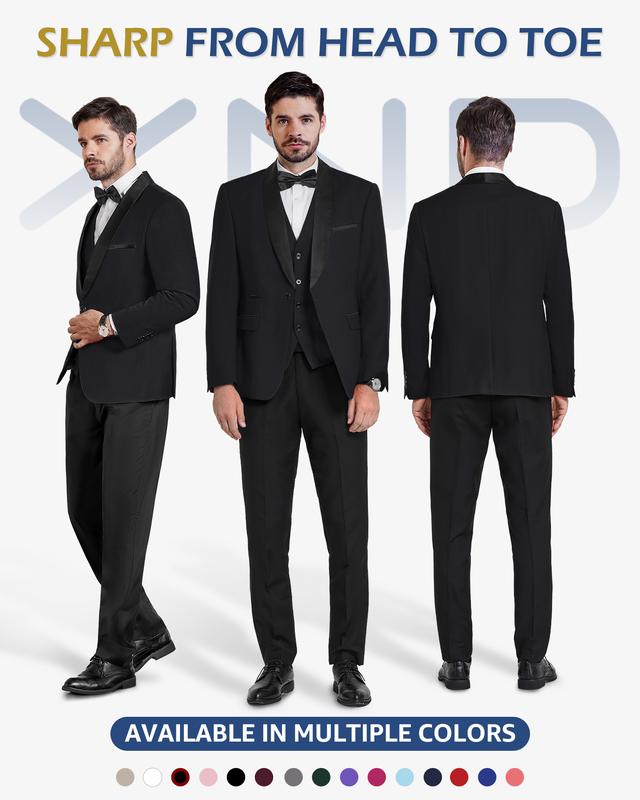 YND – Your New Day! It's a sleek 3-piece slim fit tuxedo featuring a one-button jacket, matching vest, and pants. But wait, there's more! It comes with a bow tie to complete your look. Available in sizes from XS to 3XL, it offers a range of 6 colors. You'll find genuine designs and shiny chrome buttons on both the inside and outside pockets. We're all about blending style, comfort, and affordability seamlessly. Curious why our suits are so popular? You will know when you see it!