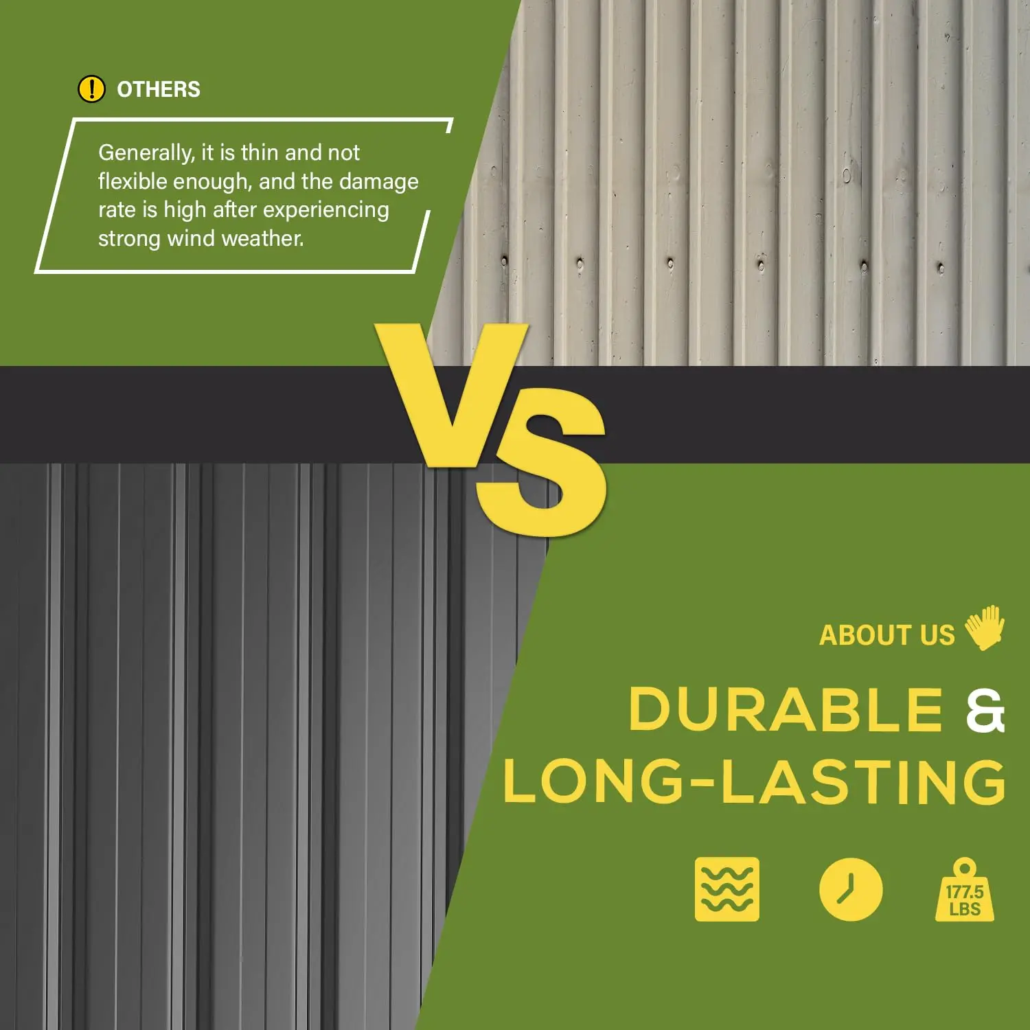 Enhanced metal plates contribute to the shed's weight of 275 lbs, surpassing cheaper alternatives. It withstands severe weather conditions, with exceptional wind resistance up to 70 mph. ⛤️