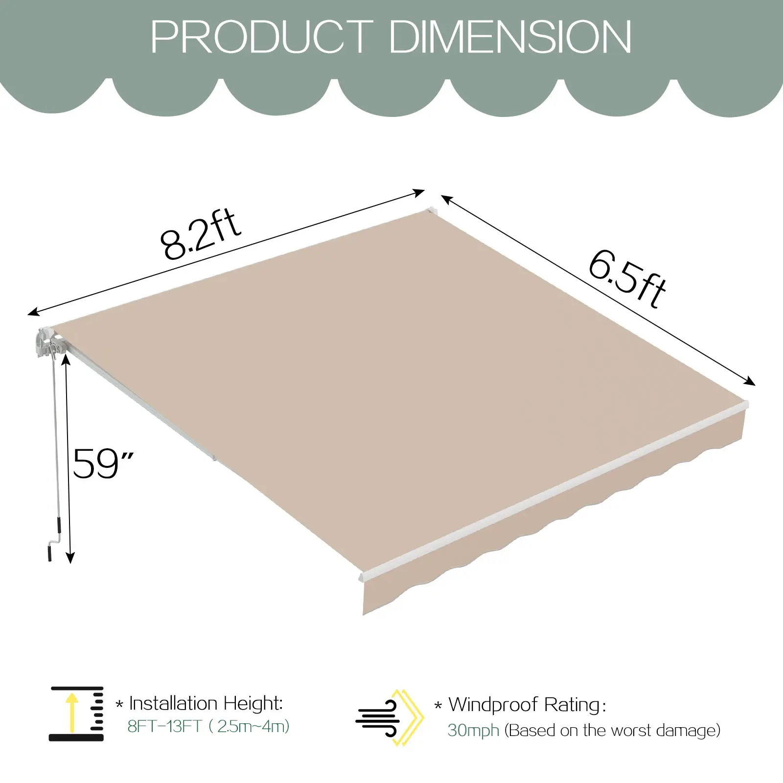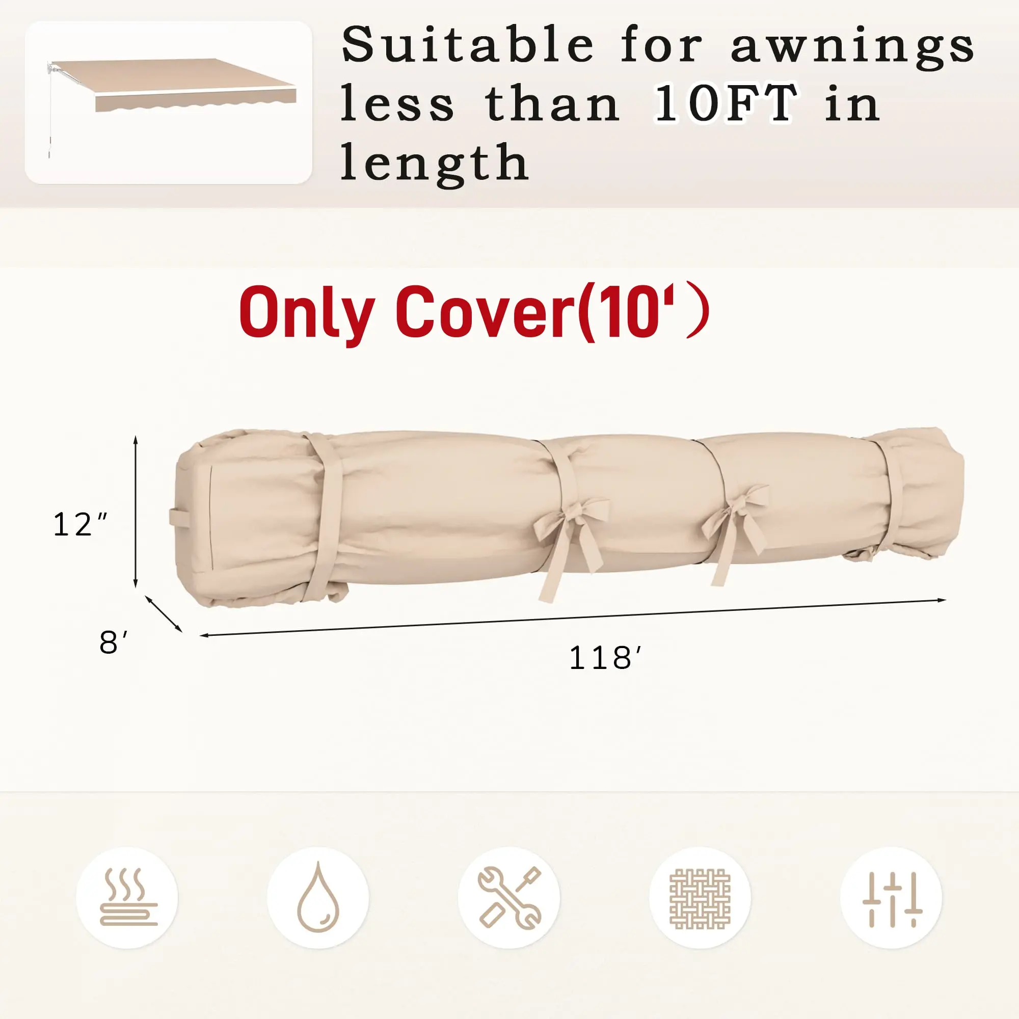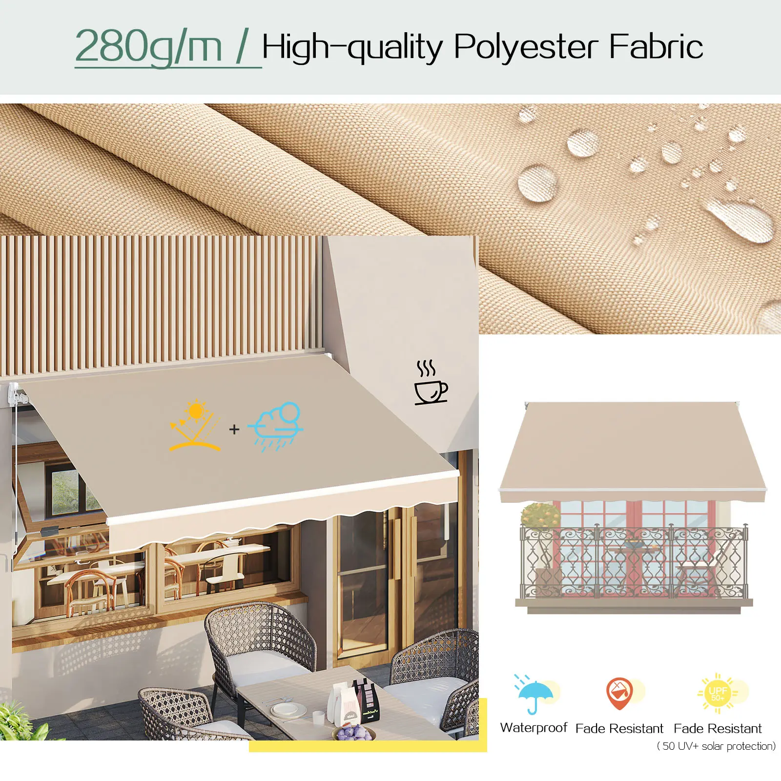 ·【Premium Cover Material】Awnings for patio are made of 280g/m² premium polyester with PU coating fabric, which is splash-proof, anti ultraviolet and fading, resistant to sun fading, also has 80UV+ solar protection. But we still recommended to roll it up to extend its service life in the event of strong winds, thunderstorms and blizzards, and it's better for you to use it with Protective Cover.