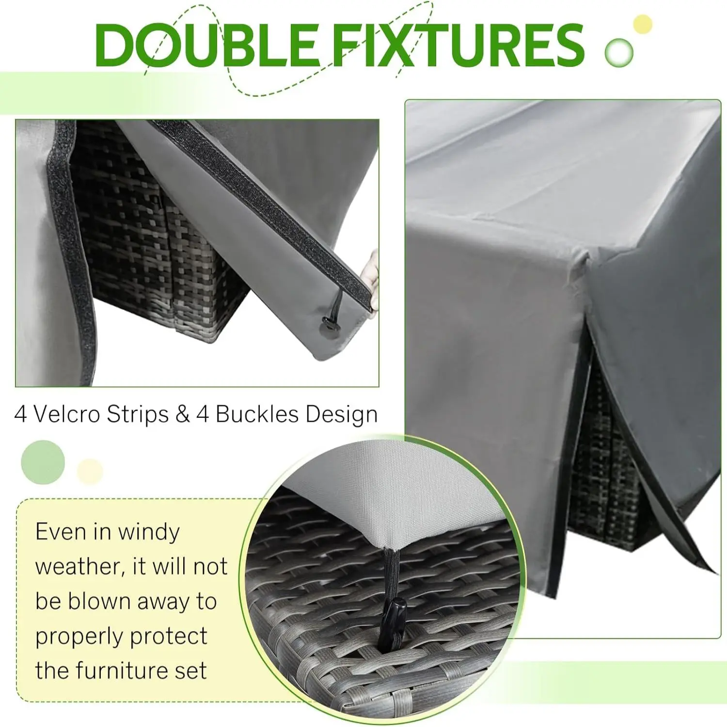 ·SPECIAL DESIGN BUCKLES - Unlike other covers, our patio table and chair covers have 4 angular toggle buckles to secure them to the rattan. You don't have to pull the hard-to-tighten drawstring, just easily tuck it into the rattan to prevent it from being blown away by the wind.