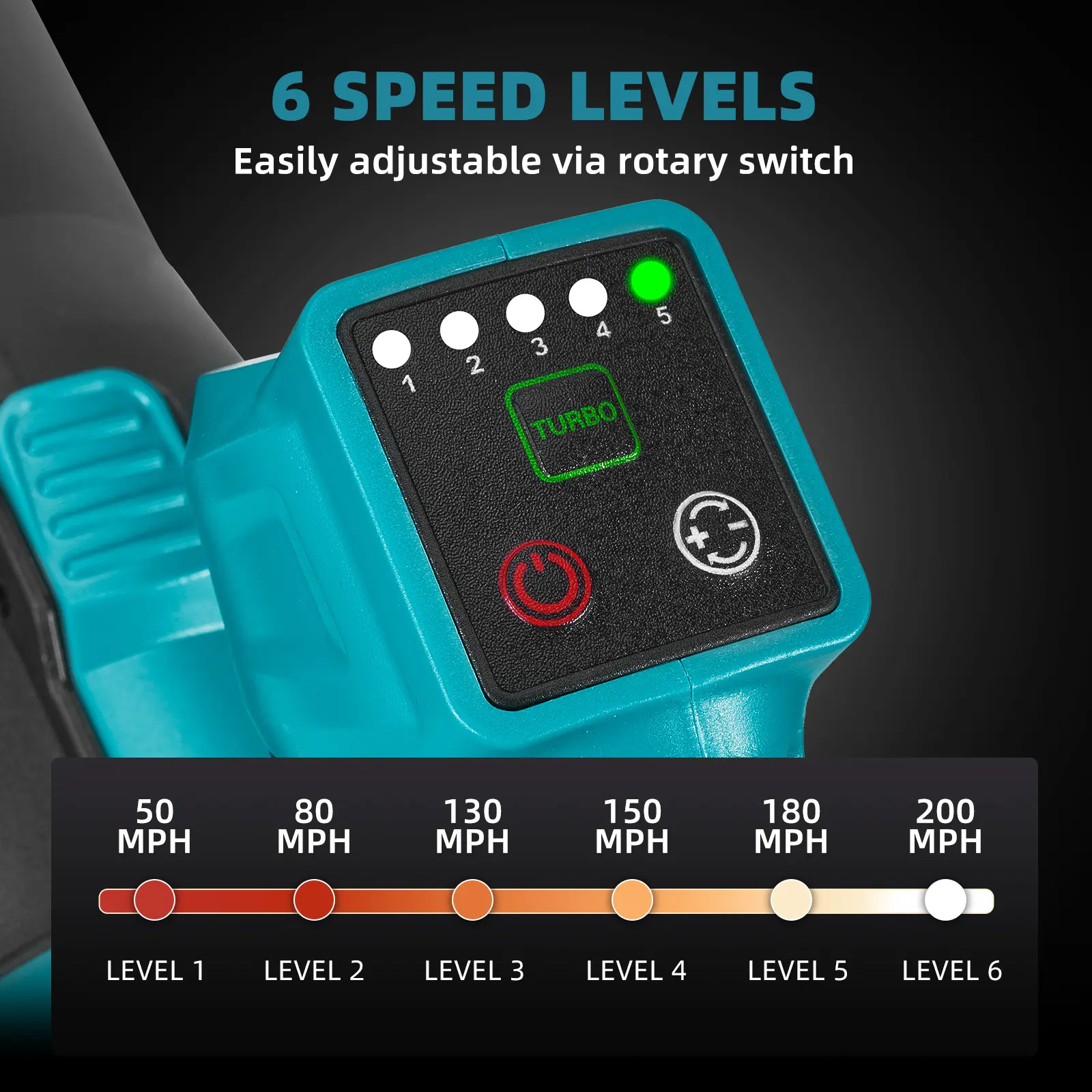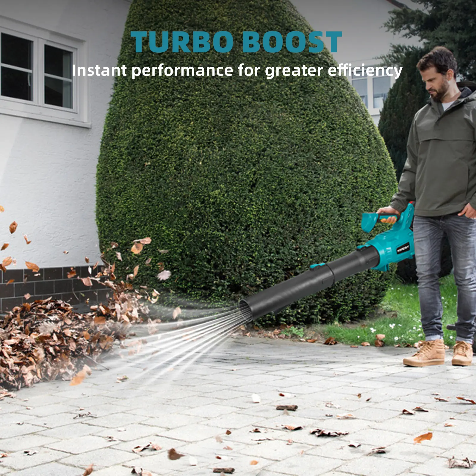 Delivers up to 200 MPH air speed / 400 KMH wind force with a 360 CFM turbo motor. Easily blows away wet leaves, heavy debris, and stubborn dust from your yard, patio, or driveway.