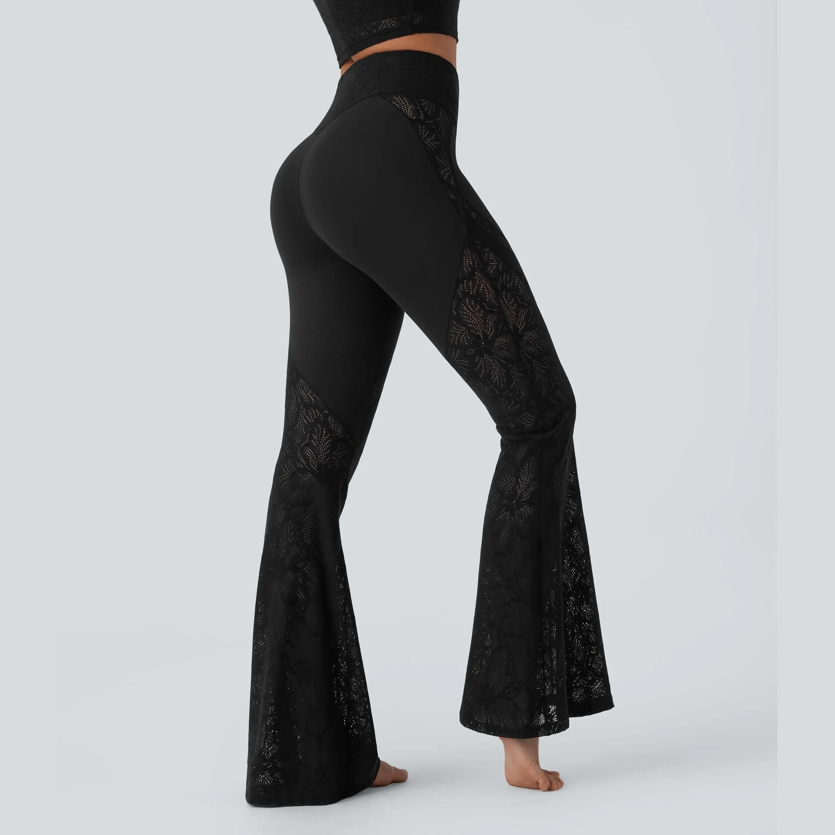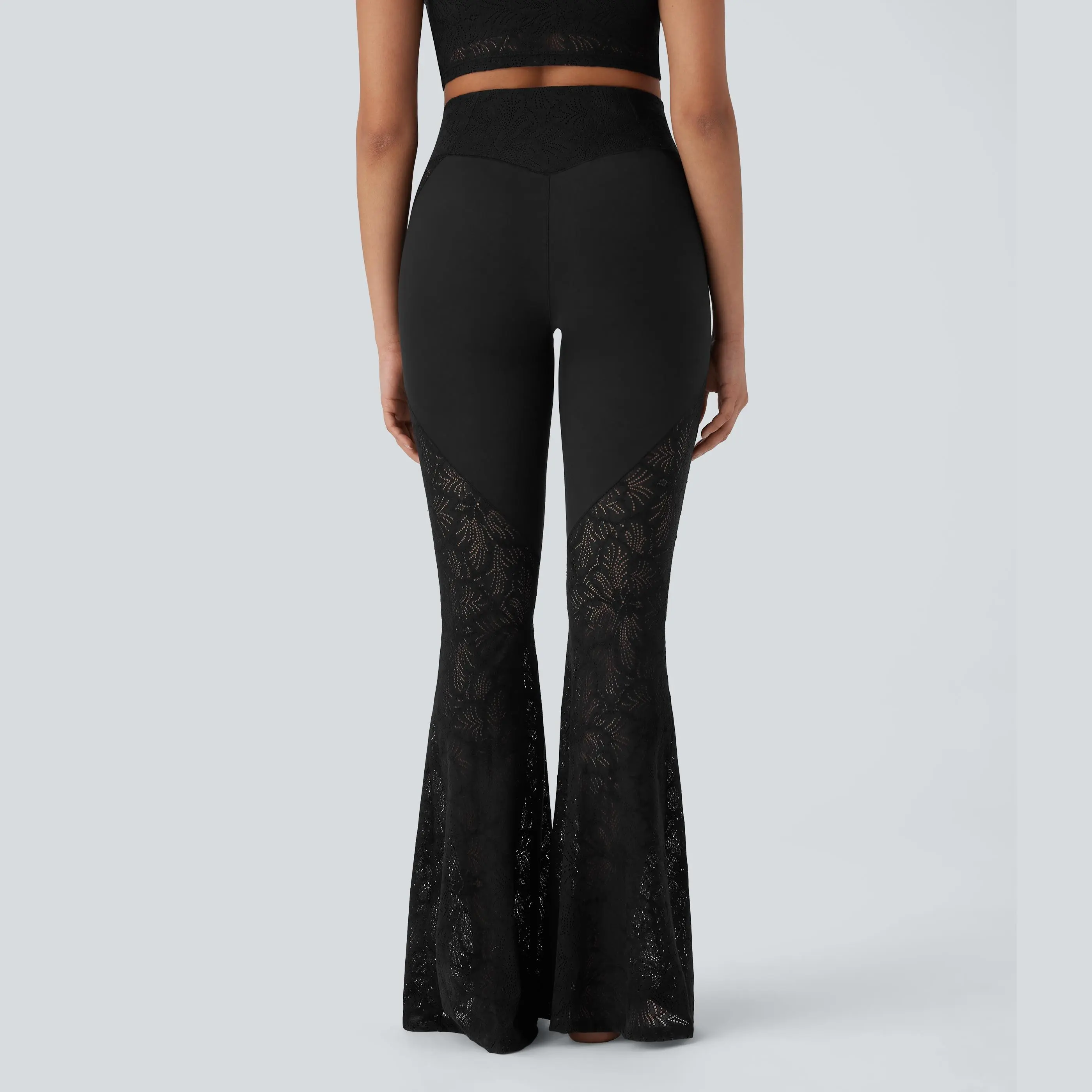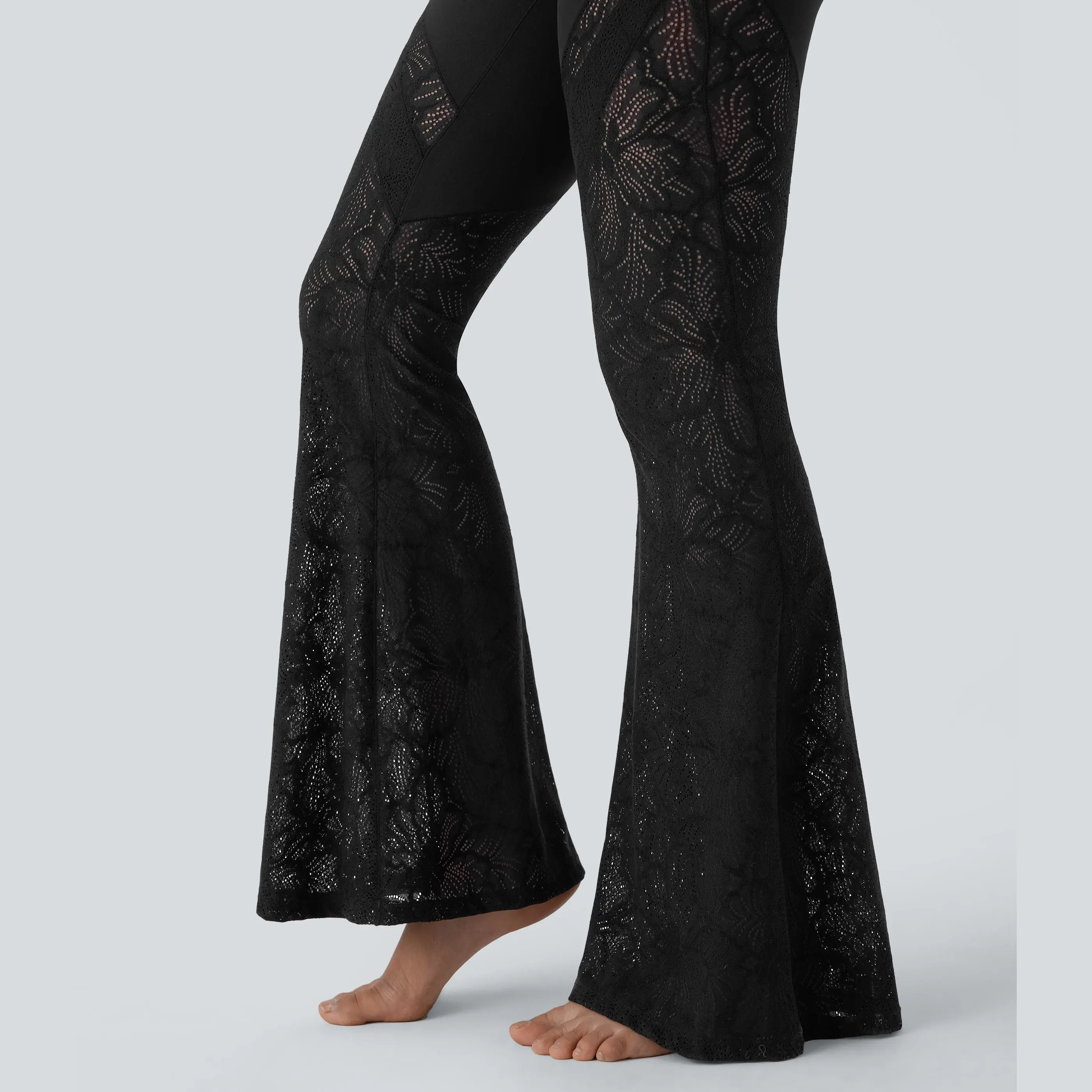 I absolutely love these leggings. They are exactly what I thought they were going to be. The lace feels sturdy and stretchy. The waist snugs in really nice. It fits nicely around my upper thighs with the very cute flare at the bottom. The lace does go all the way up the side and they look amazing.