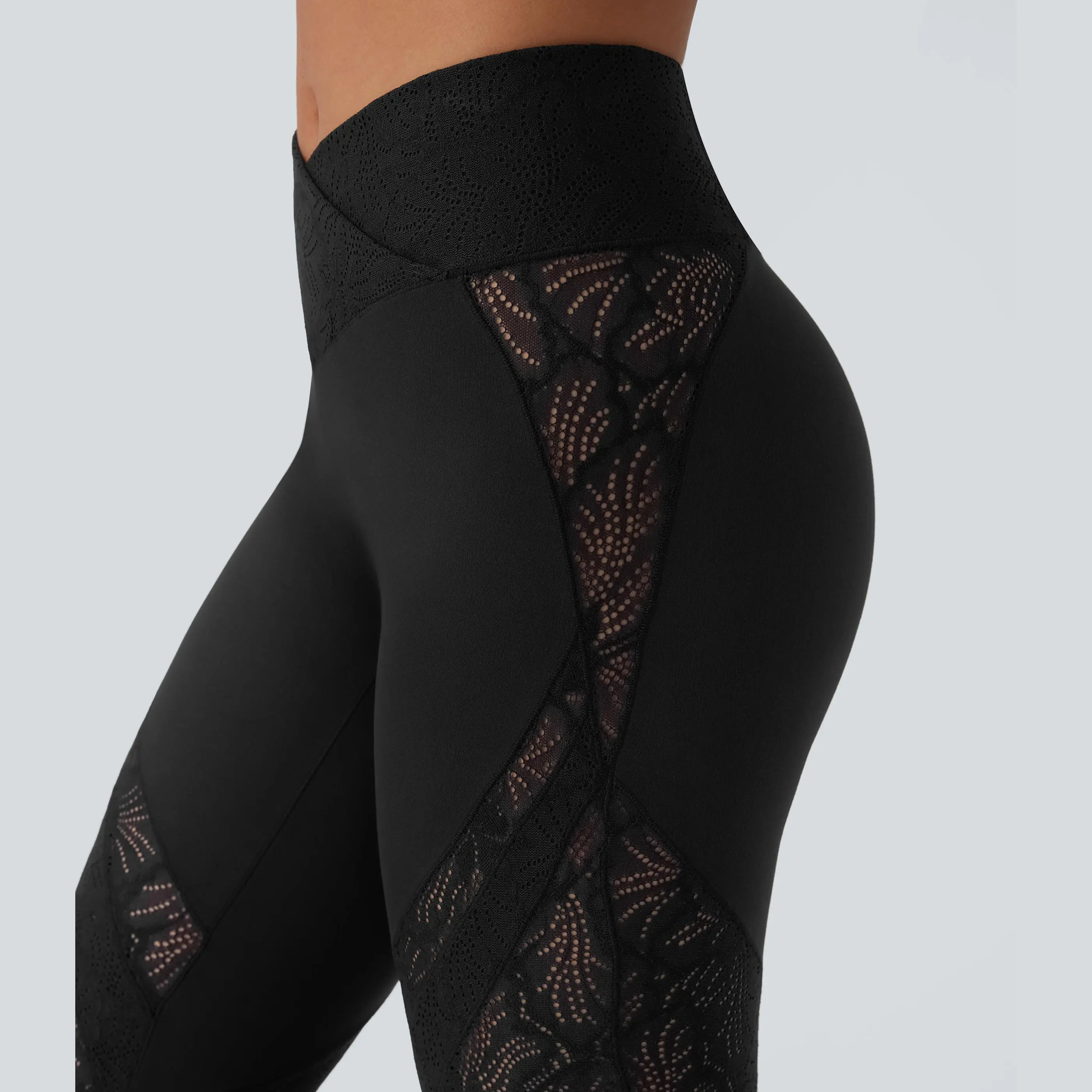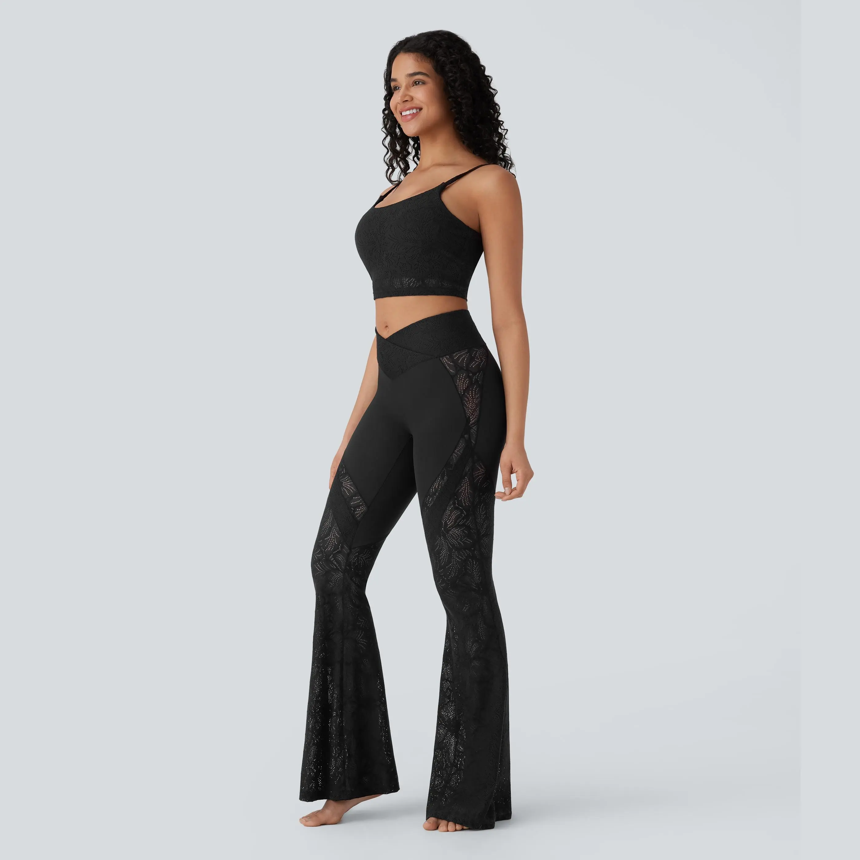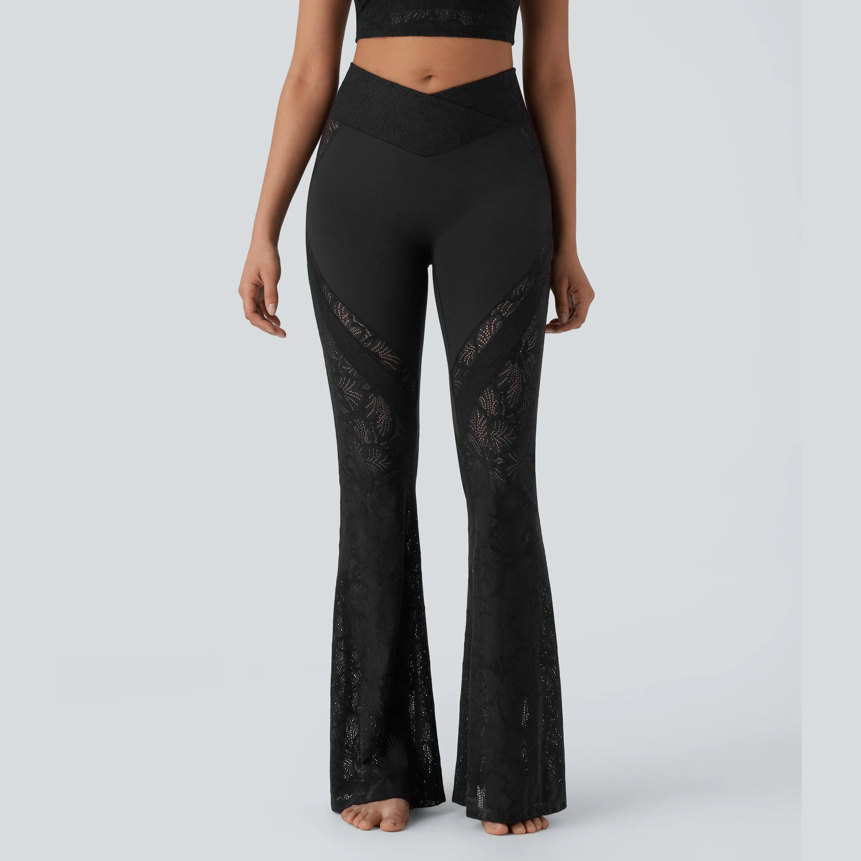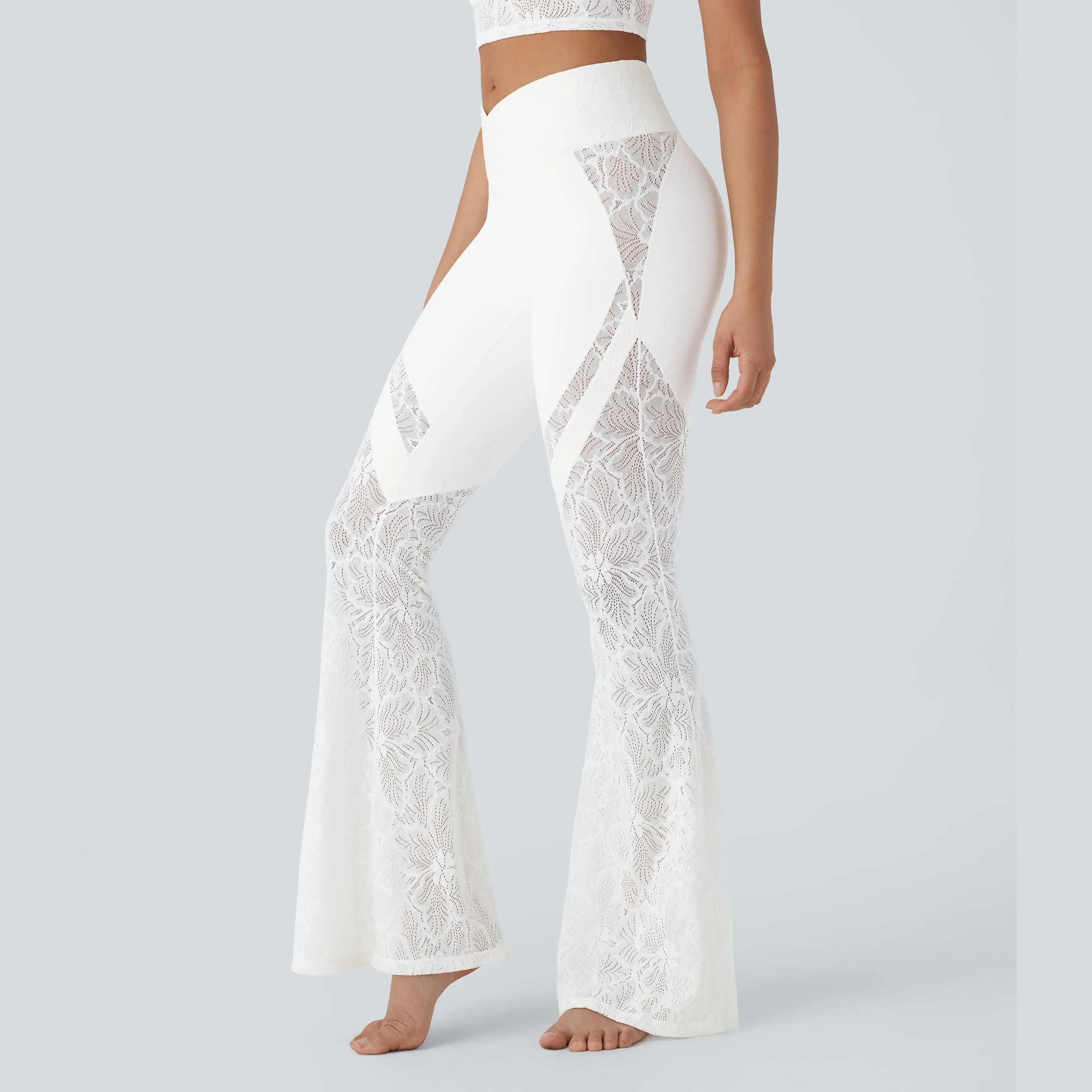 I absolutely love these leggings. They are exactly what I thought they were going to be. The lace feels sturdy and stretchy. The waist snugs in really nice. It fits nicely around my upper thighs with the very cute flare at the bottom. The lace does go all the way up the side and they look amazing.