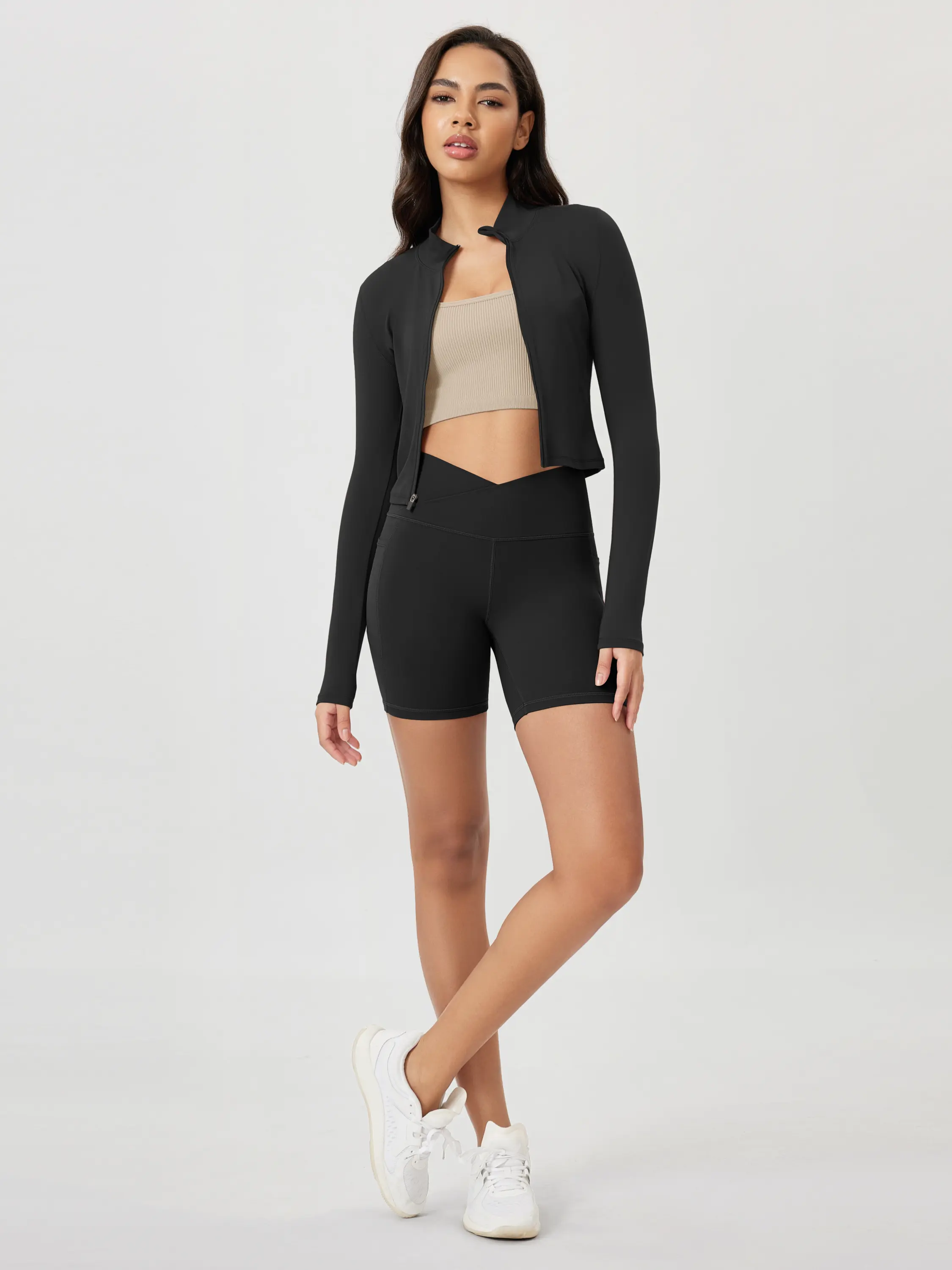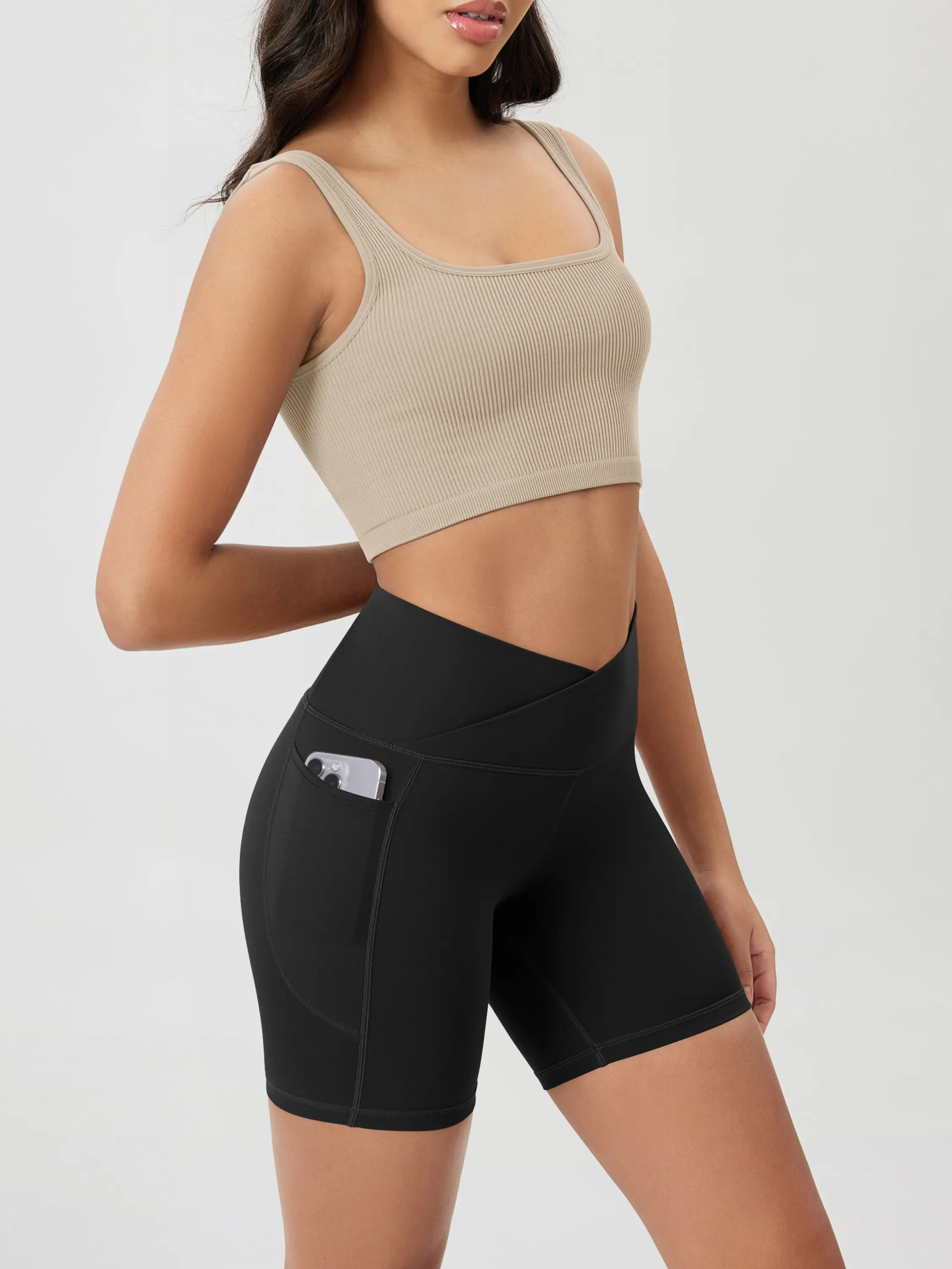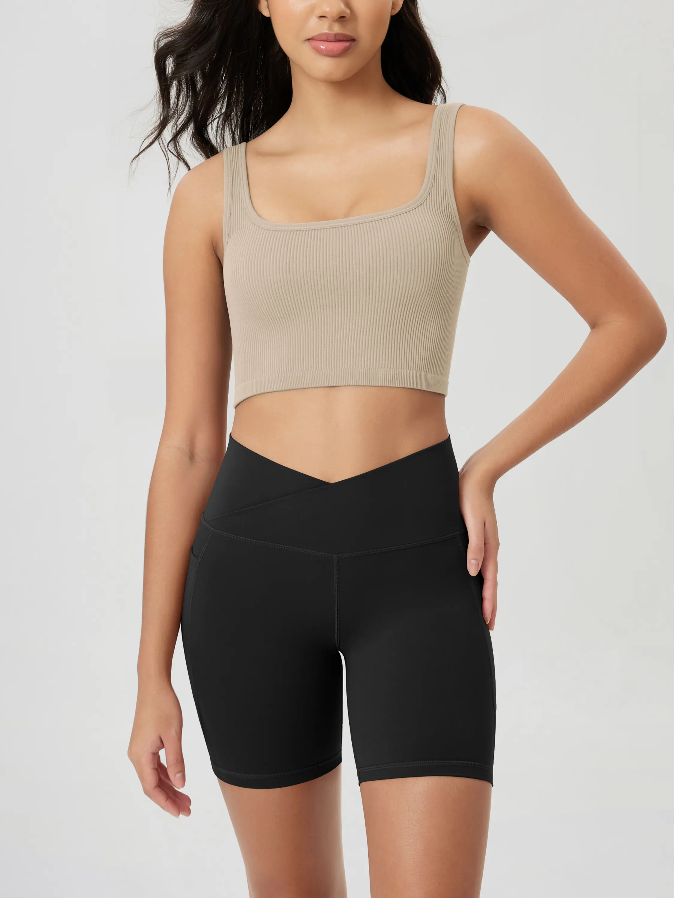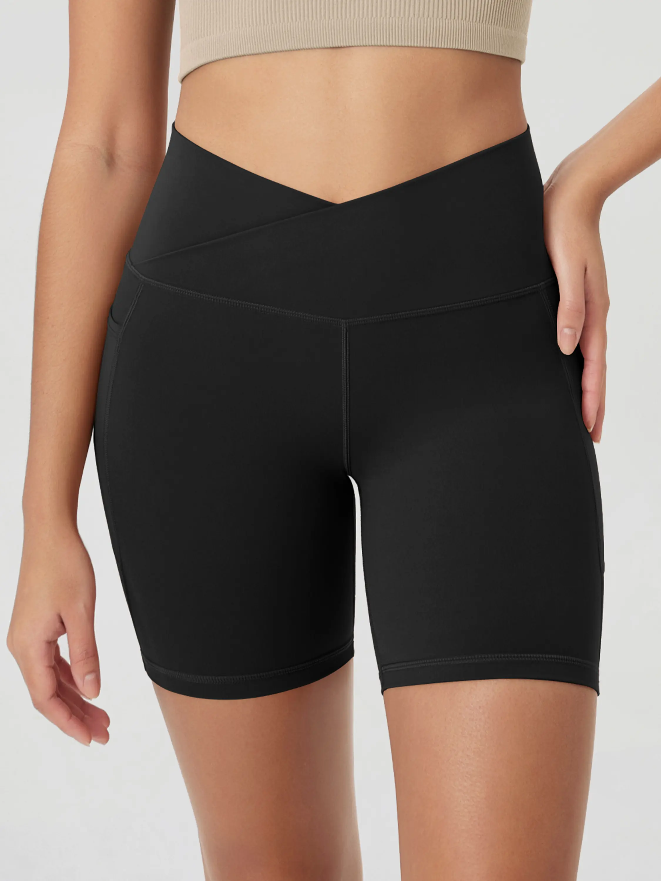 ·Crossover design shows off your shape in style, combine with high-rise wide waistband, prevent to roll down