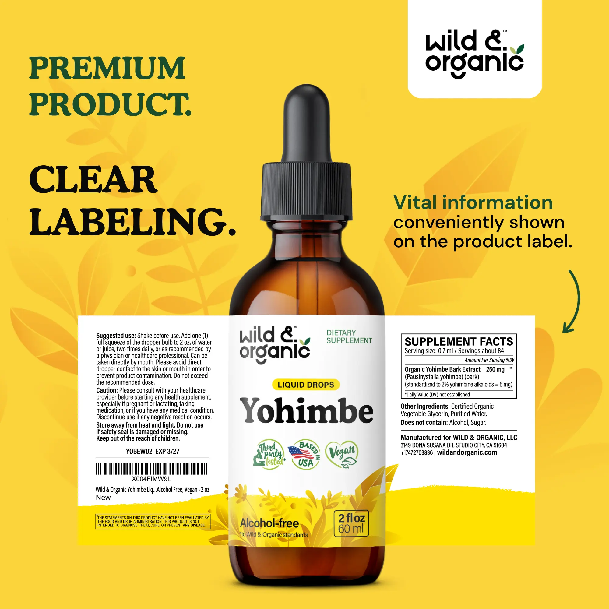 Each serving of Wild & Organic's yohimbe drops contains 250 mg of yohimbe bark extract (or 5 mg of yohimbine). This supports men's and women's overall well-being. Vegan, free from GMOs, and no artificial additives. Perfect for both genders.