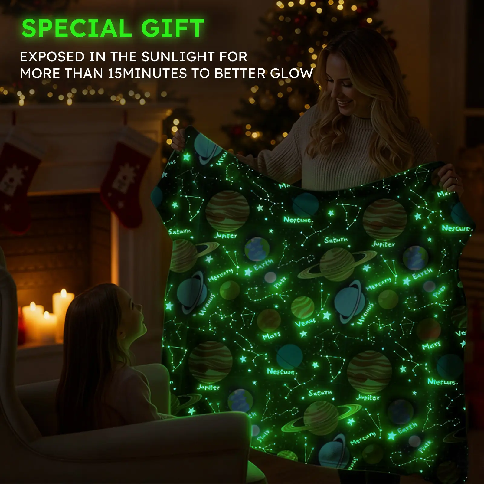 The dark fleece throw blanket is a glow in the dark