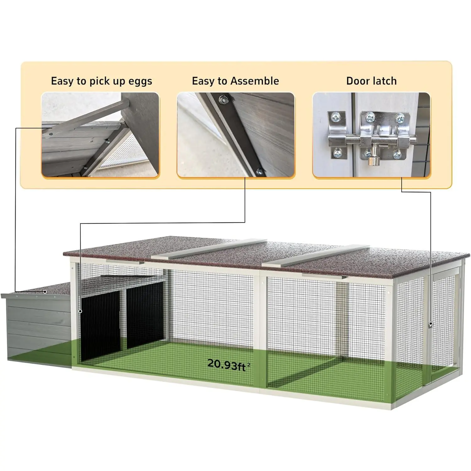 ·Spacious Chicken Coop with Run: Features a 20.93 ft² large activity area—ideal for multiple chickens to roam, peck, and stay active while staying safe and contained.