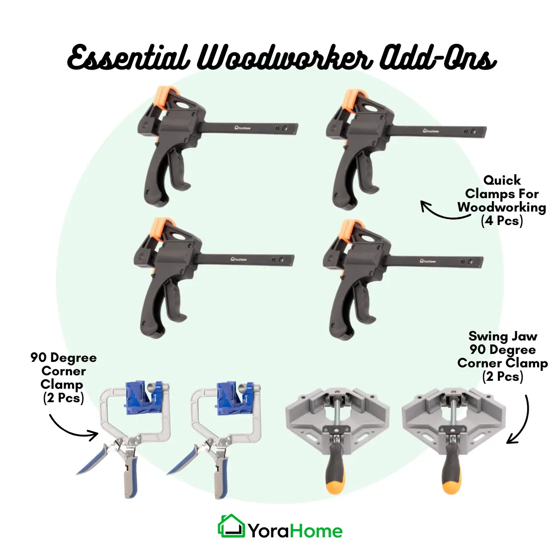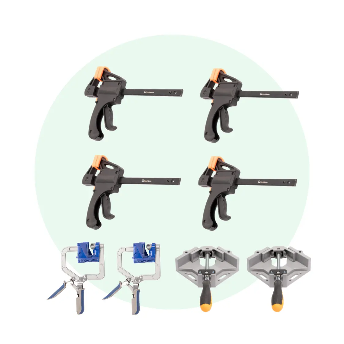 This kit includes useful tools to boost any workshop. It features quick clamps for woodworking, 90-degree corner clamps, and swing jaw 90-degree corner clamps. Perfect for woodworkers looking to enhance their toolkit.