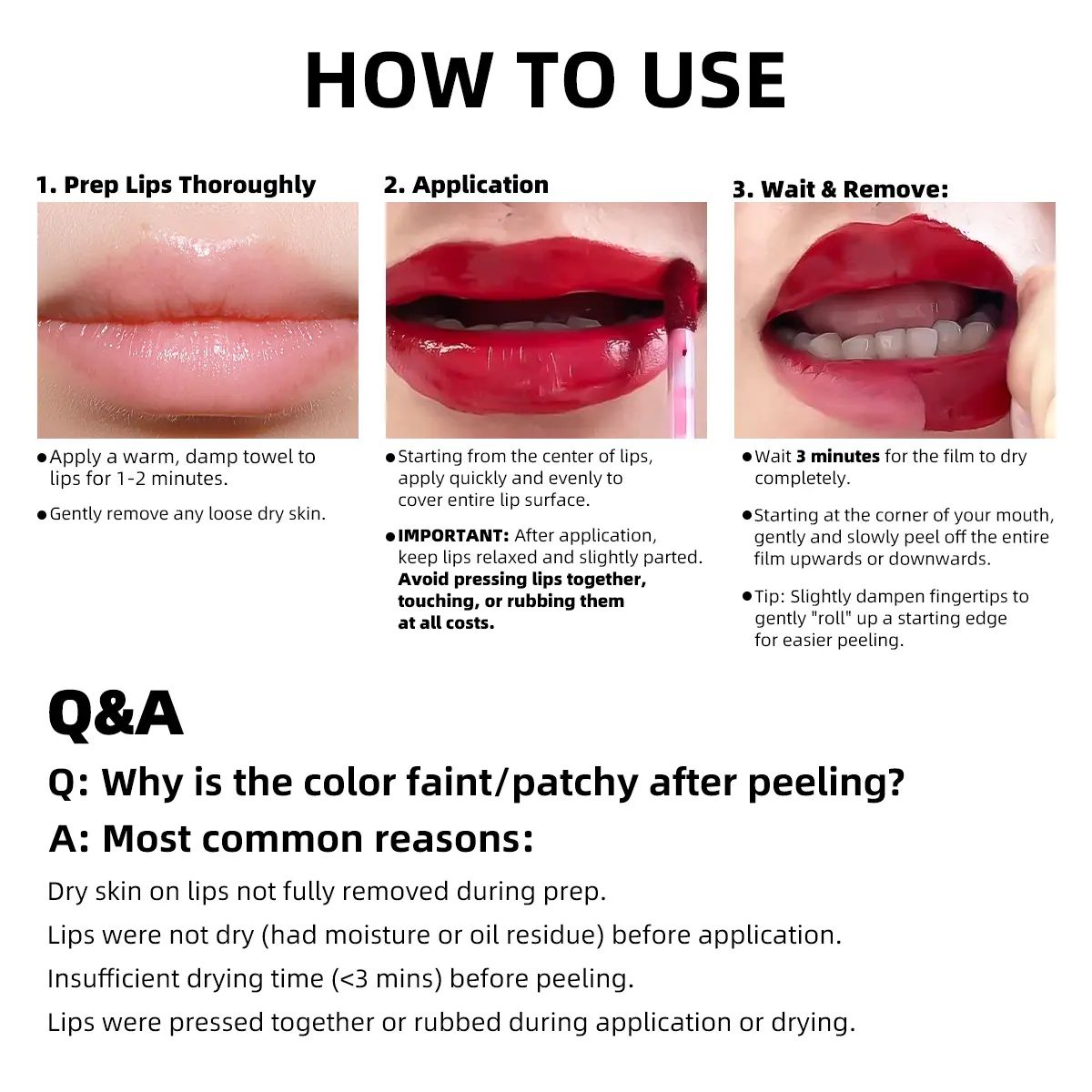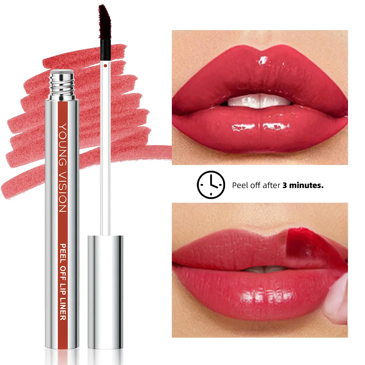 Works pretty well and color lasts several hours. It’s kind of difficult to peel it off if there’s any dryness of the lips.