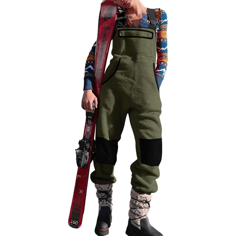 Yousify Women's Army Green Fleece Warm Overalls Winter Casual Jumpsuits with Pockets Ski Bibs Snow Pants S-2XL Basic Fitted Minimalist Sleeveless Strap Strappy Womenswear
