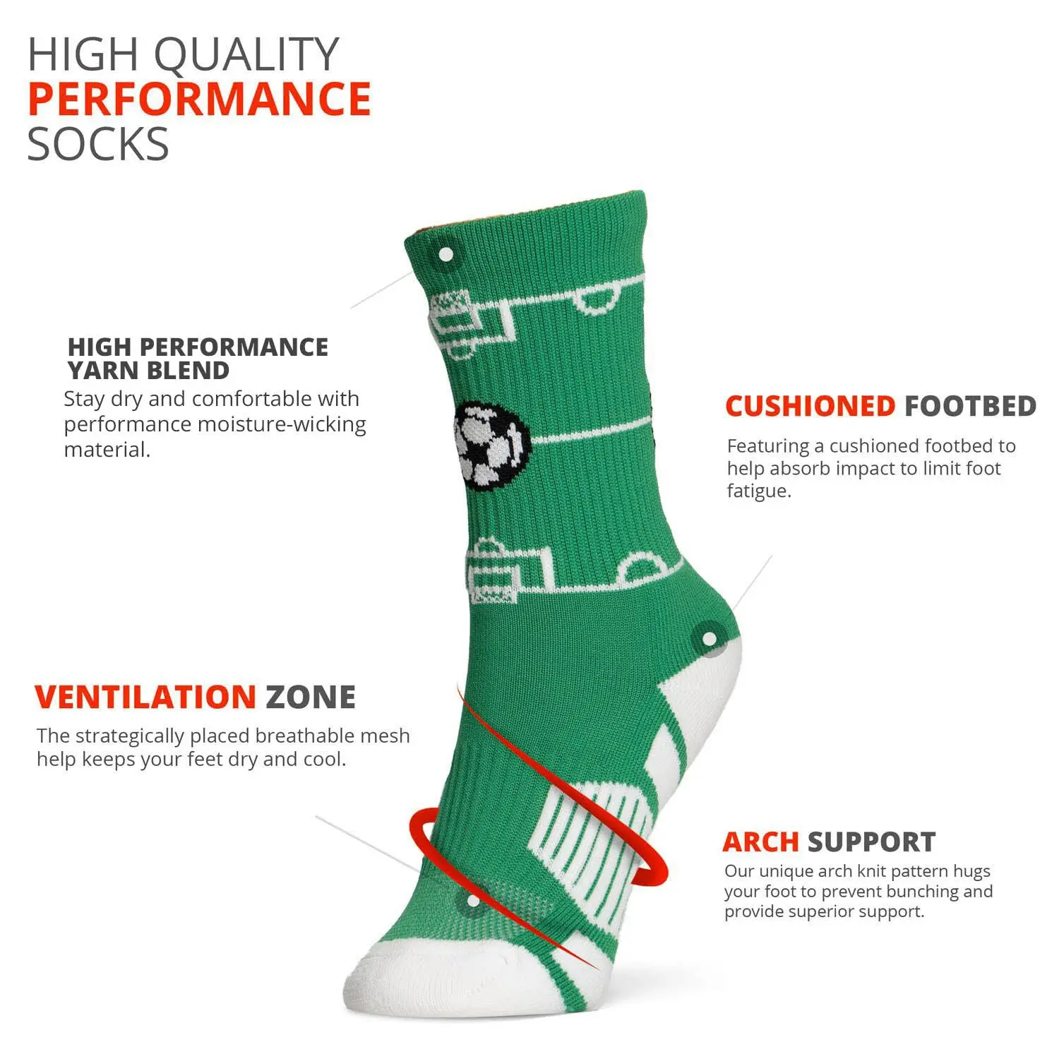 Is it hard to quit when the whistle blows? Then don't! Take the soccer field with you wherever you go in these Soccer Field mid-calf performance socks. These moisture-wicking crew soccer socks are made from a performance material blend and equipped with ventilation zones which are sure to keep soccer player's feet dry and comfortable all-day long. You won't have to fuss about keeping the socks in place with their stay up technology, while they give a player’s foot the support it needs with a cushioned footbed and supportive arch band. These mid-calf soccer socks also make for a great gift for any occasion.