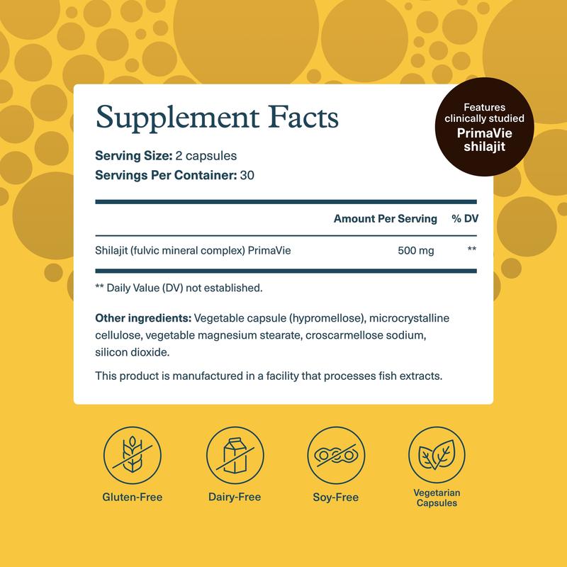 Product IngredientsShilajit (fulvic mineral complex) PrimaVie 500 mg,Other ingredients: Vegetable capsule (hypromellose),microcrystalline cellulose,vegetable magnesium stearate,croscarmellose sodium,silicon dioxide. This product is manufactured in a facility that processes fish extracts.Shilajit country of origin: India,PrimaVie is a registered trademark of Natreon,Inc.