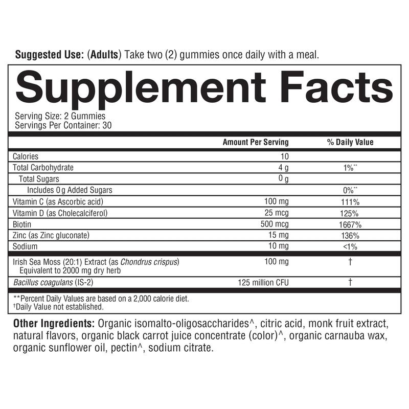 Product IngredientsCalories Total Carbohydrate Total Sugars 10 4 g 0g 1% Includes 0g Added Sugars Vitamin C Vitamin D Biotin Zinc Sodium Irish Sea Moss (20:1) Extract Equivalent to 2000 mg dry herb Bacillus coagulans (IS-2) 125 million CFU Percent Daily Values are based on a 2,000 calorie diet. Other Ingredients: Organic isomalto-oligosaccharides,citric acid,monk fruit extract,natural flavors,organic black carrot juice concentrate (color)^,organic carnauba wax,organic sunflower oil,pectin^,sodium citrate.