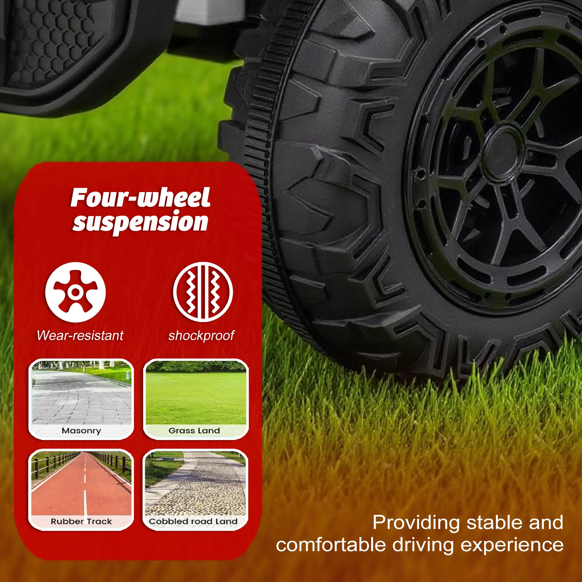 ·Four-wheel suspension for smooth rides.