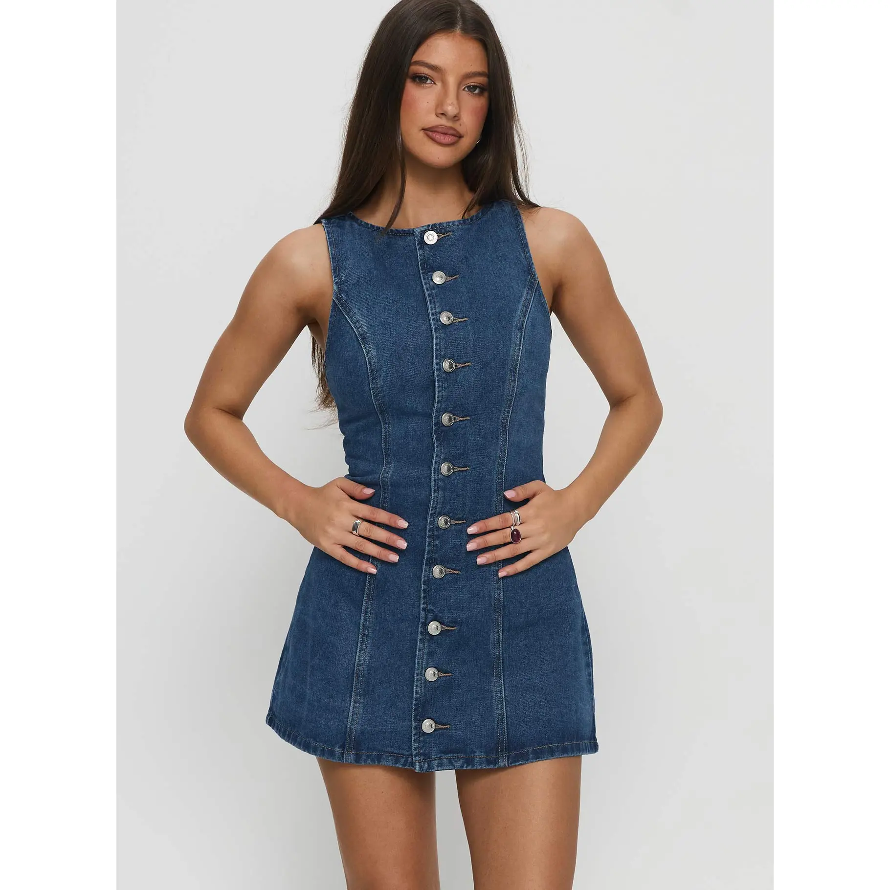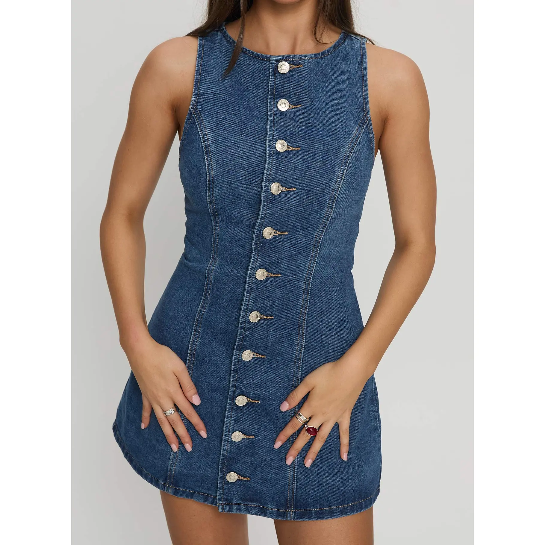 ·Crew neckline, button-up closure, sleeveless, built-in shorts