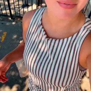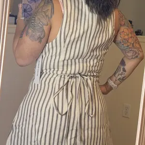 I’m 5’9 and 190lbs, I bought a size L and it’s a little snug but so cute. Id buy this in another color too! Love the vertical pinstripes, it is short yes, but I dont mind it at all. I have a little belly and the bow narrows my waistline which I love too. You won’t be disappointed in this purchase.
