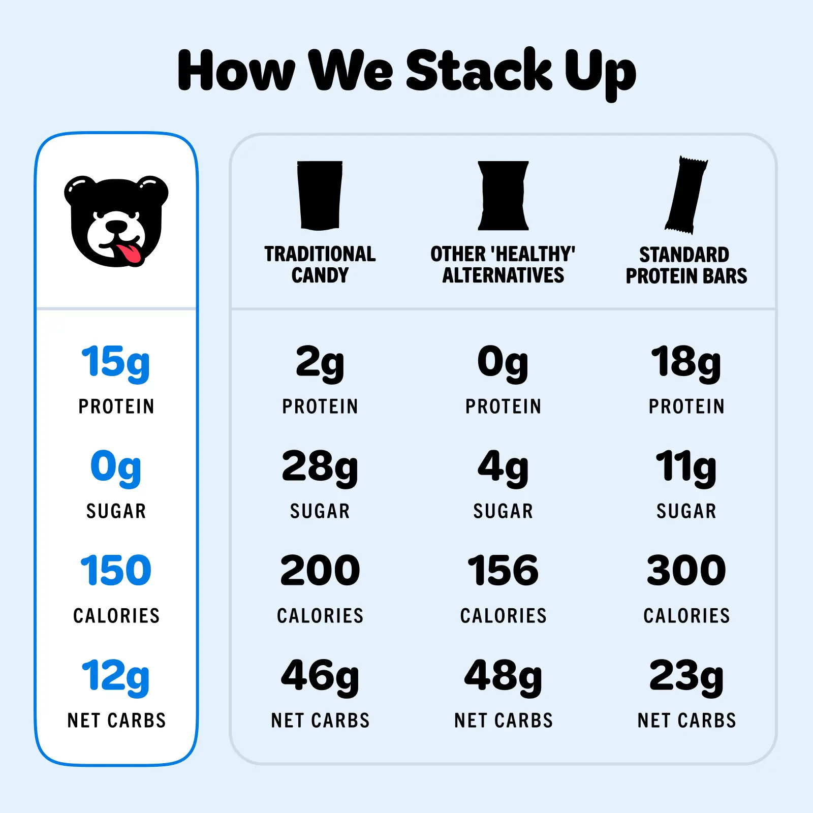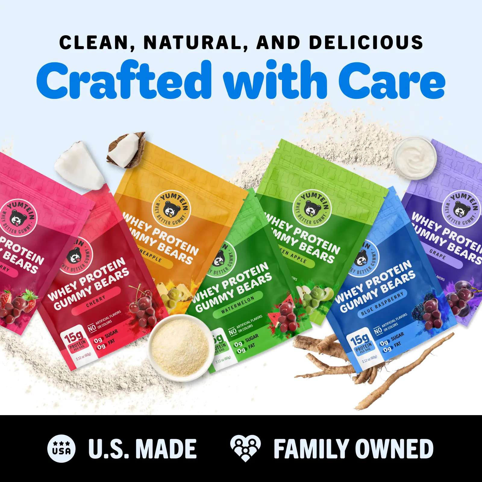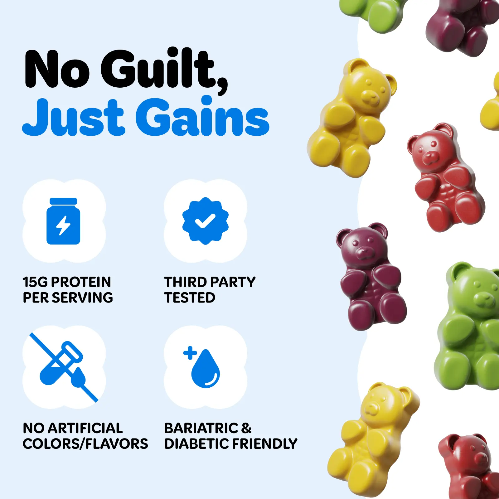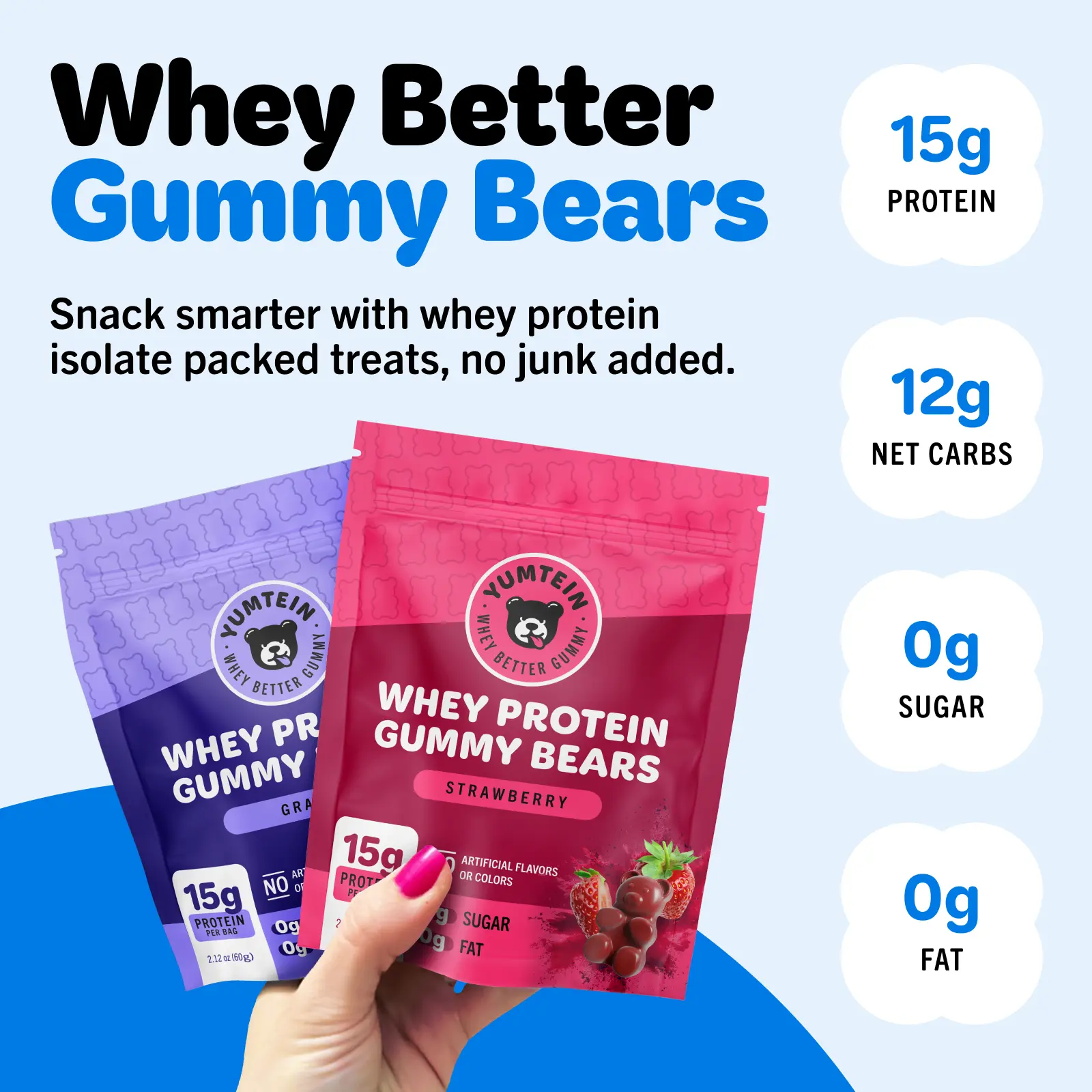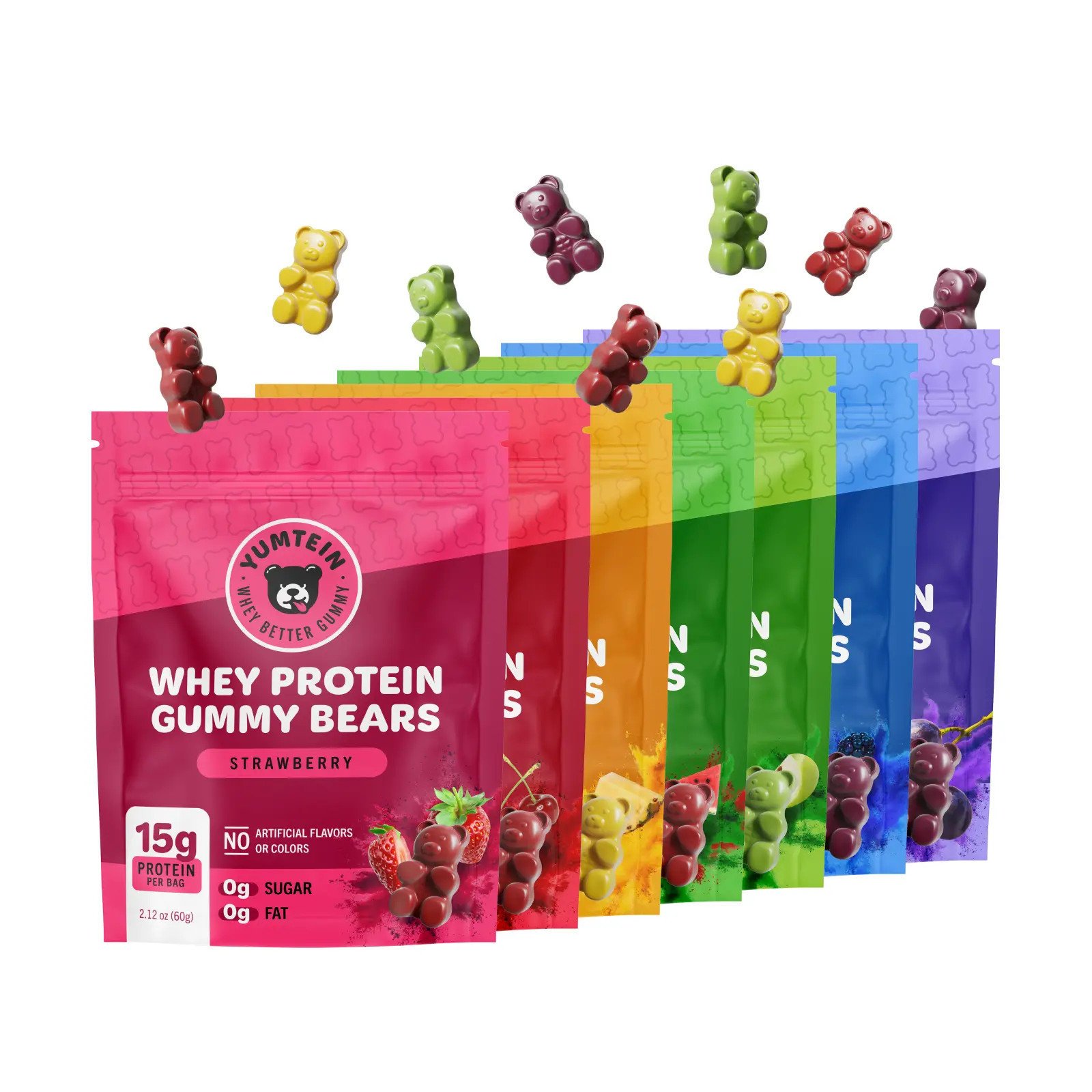 Ditch the chalky bricks and enjoy the soft, chewy texture of real gummy bears. Yumtein packs 15g of Complete Protein into every bag, with ZERO sugar and ZERO fat.