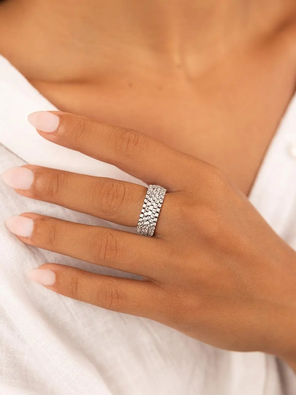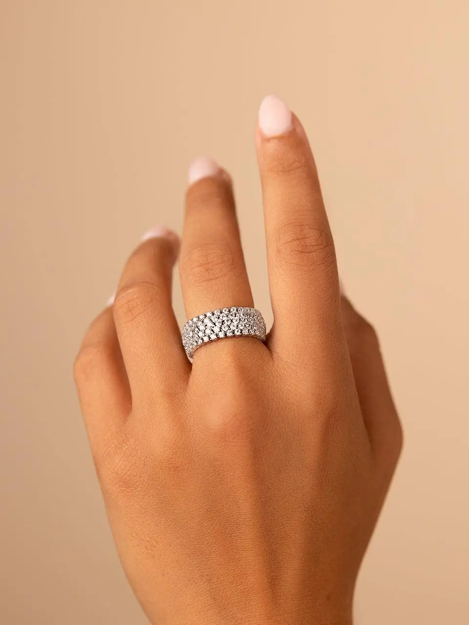 Indulge in elegance with our Yvonne CZ Stacking Ring. This beautiful ring features rows of sparkling CZ stones, evoking the eternal beauty of an eternity band ring. Elevate your style and add a touch of sophistication to any outfit.