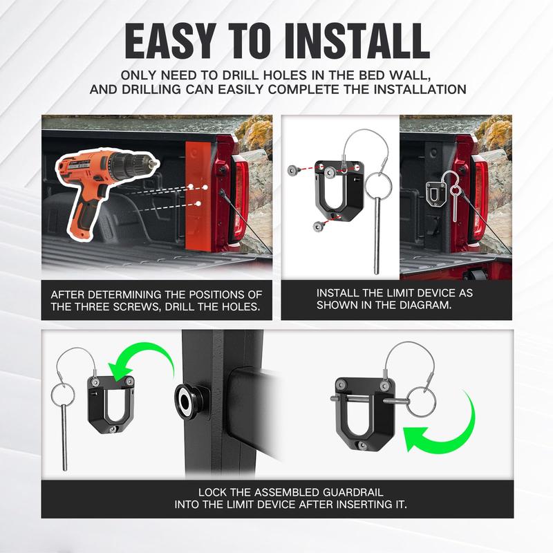 ·【Drill Installation】: The truck bed extender can be easily installed and removed using the quick bracket pin system. You need to drill holes in the walls or tailgate. The 3-inch mounting brackets have a raised profile to prevent obstruction by car rails, making flipping effortless and use worry-free.