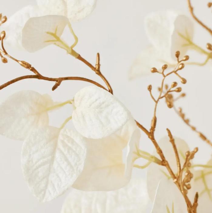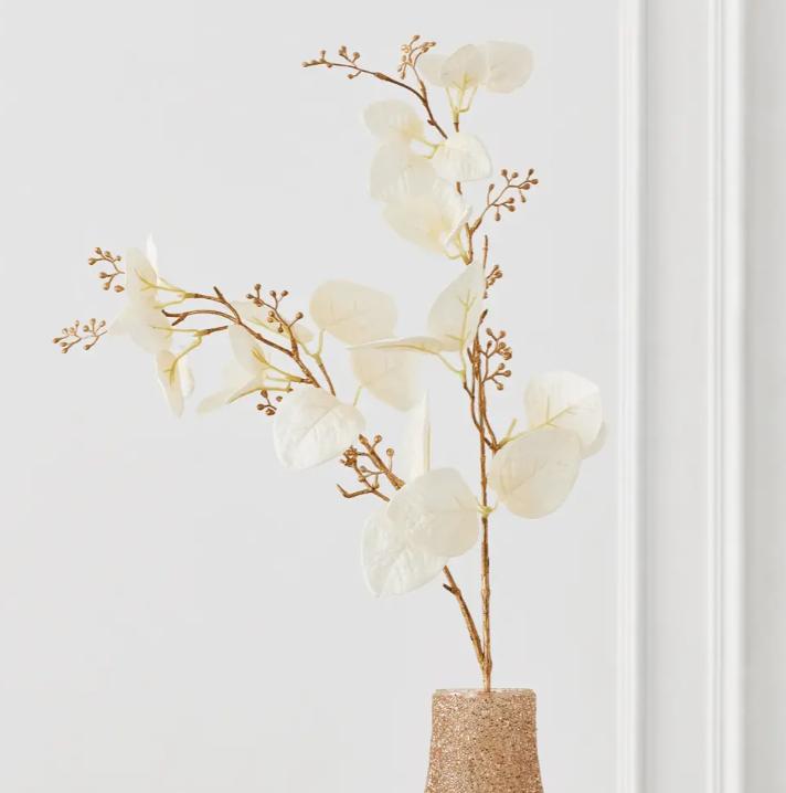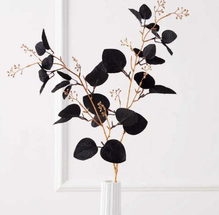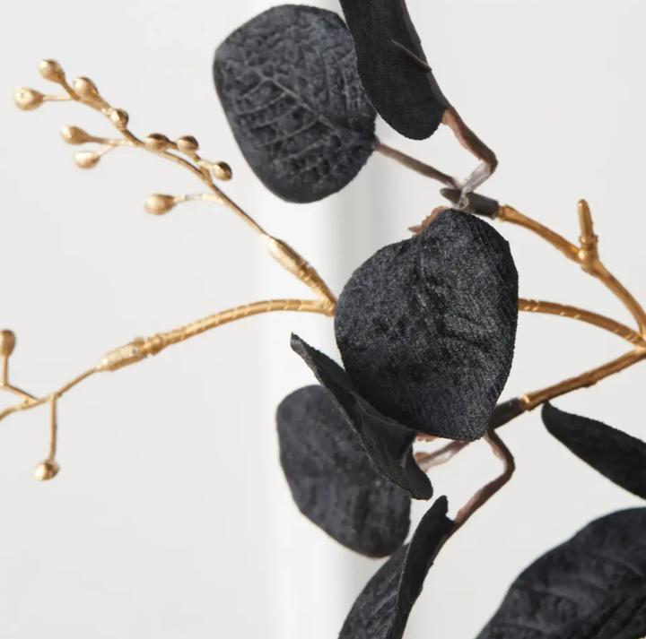 Finished in black and gold, these stunning faux-eucalyptus stems make a festive addition to your holiday decor.
