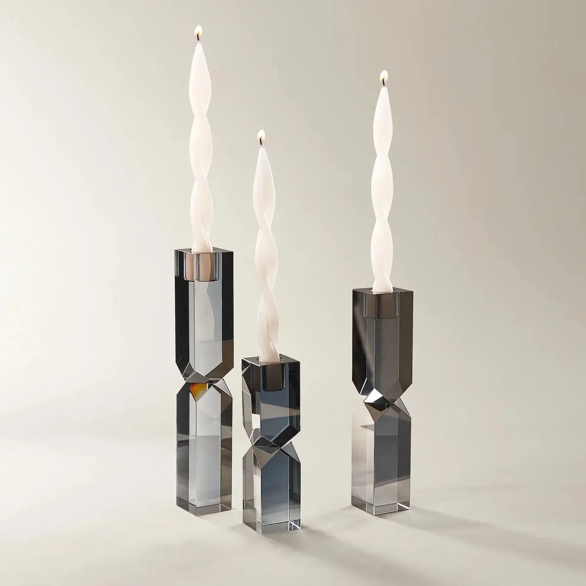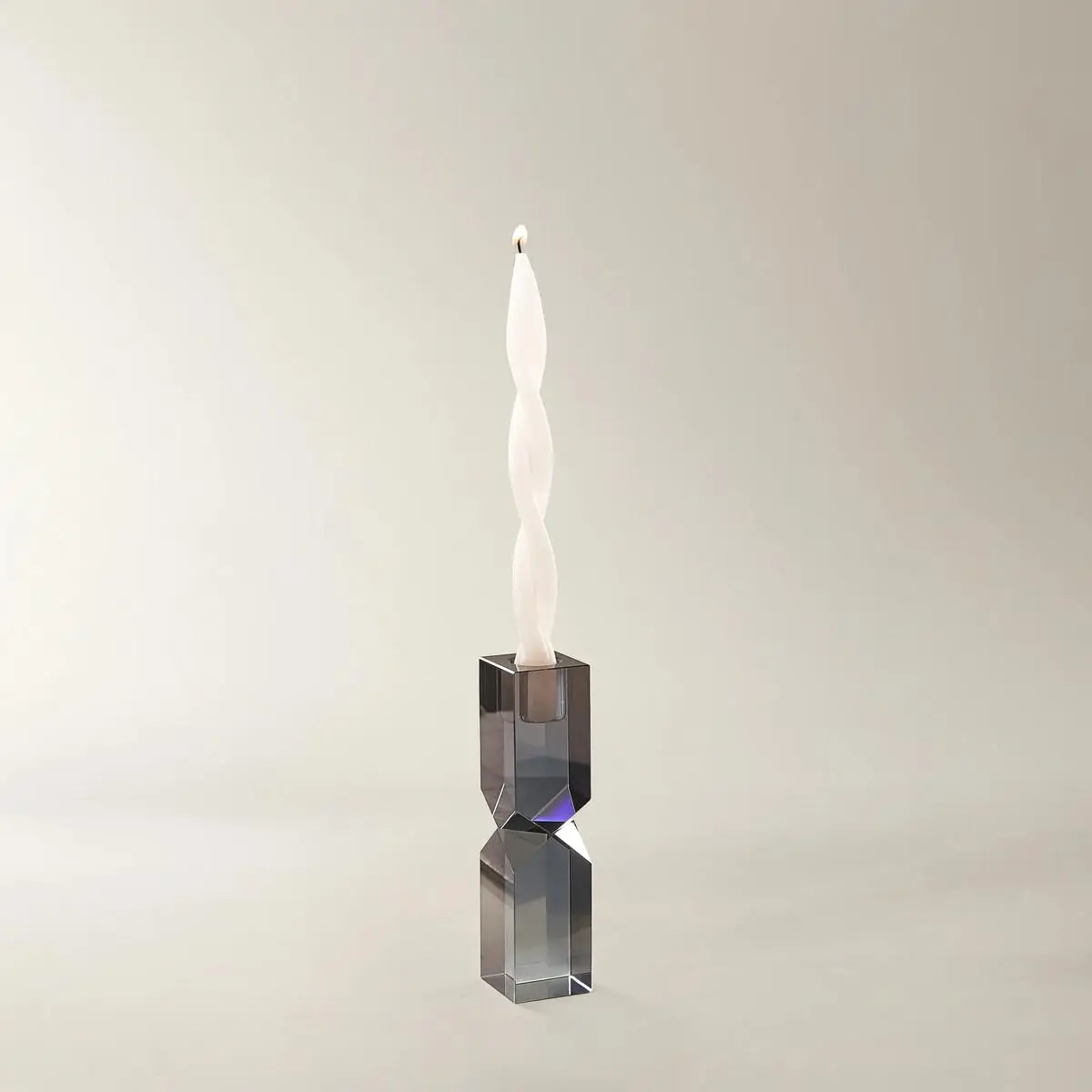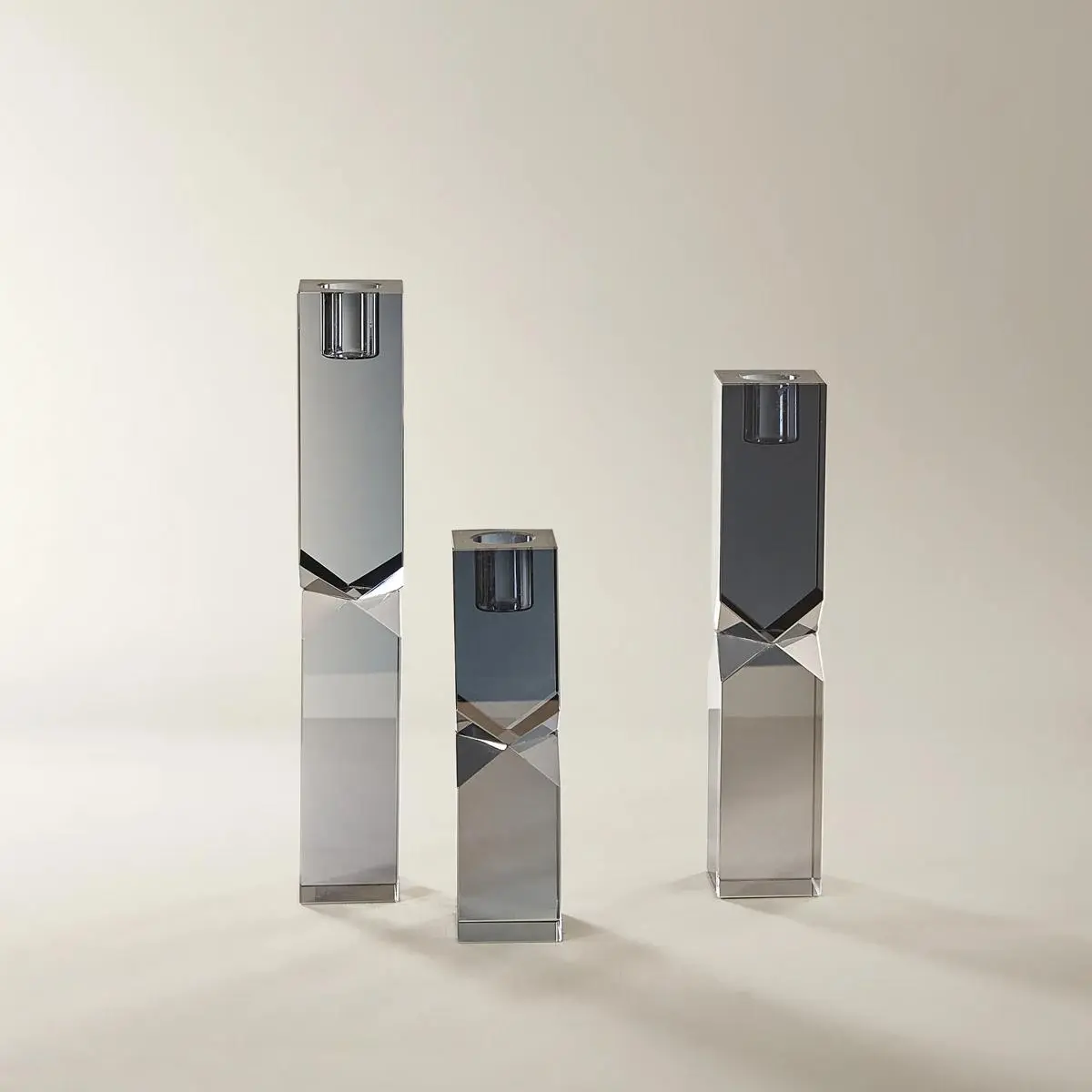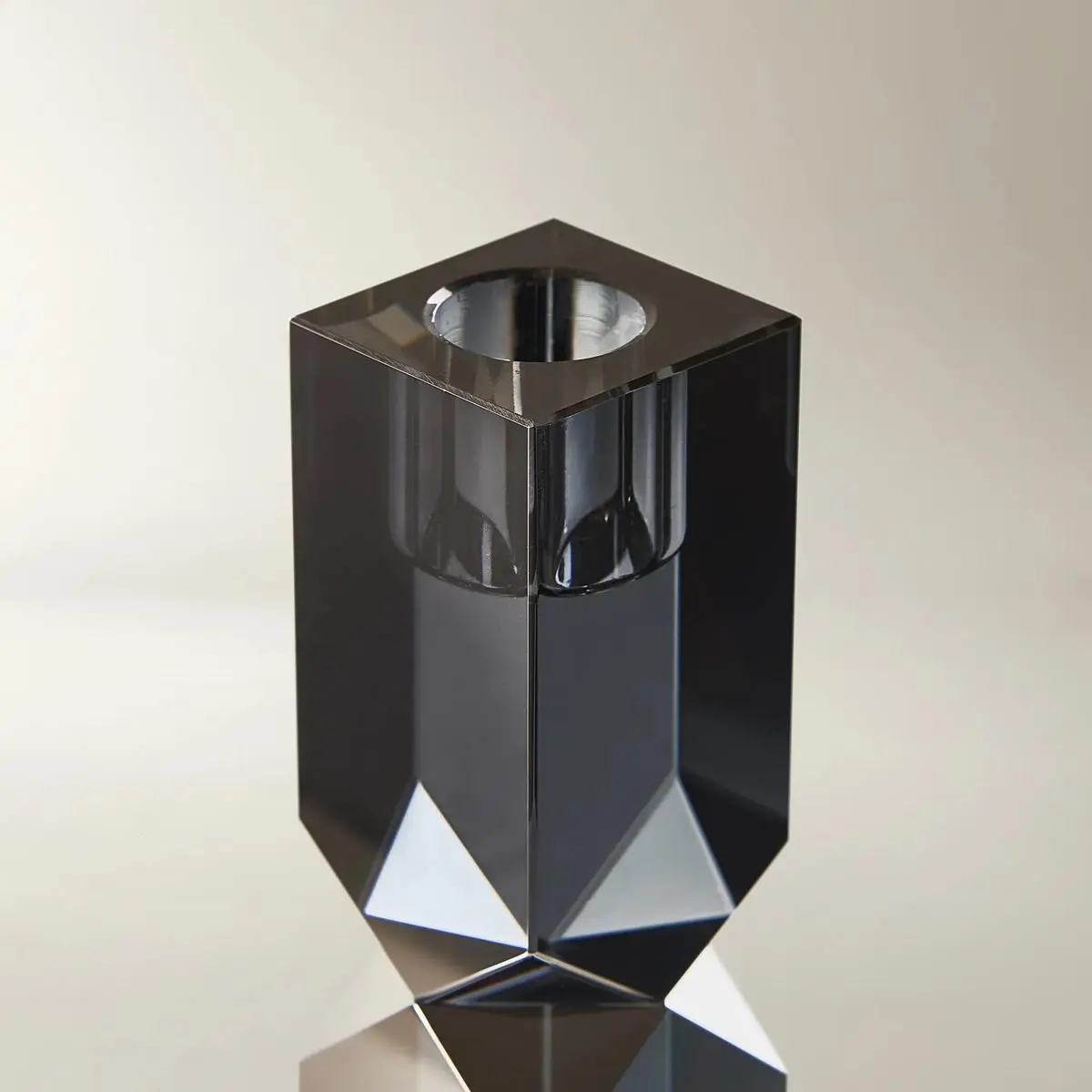Sculptural and sleek, the Mythos Taper Holder brings bold dimension to your candlelight display. Crafted from mirrored graphite crystal glass, each geometric form plays with symmetry and light for a modern, architectural effect. Whether styled solo or as a collected trio, these taper holders add an elevated edge to mantels, consoles, or dining tables. Available in three sizes to layer or stand alone.