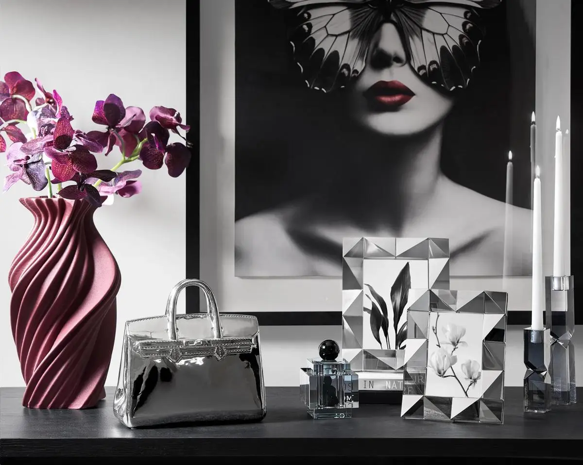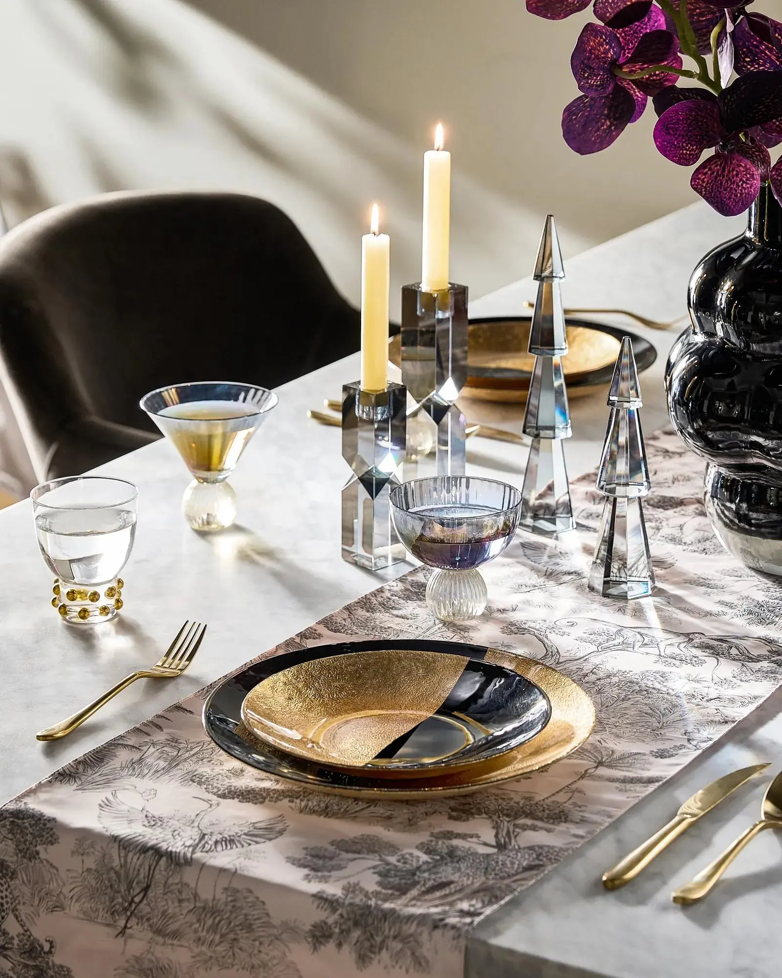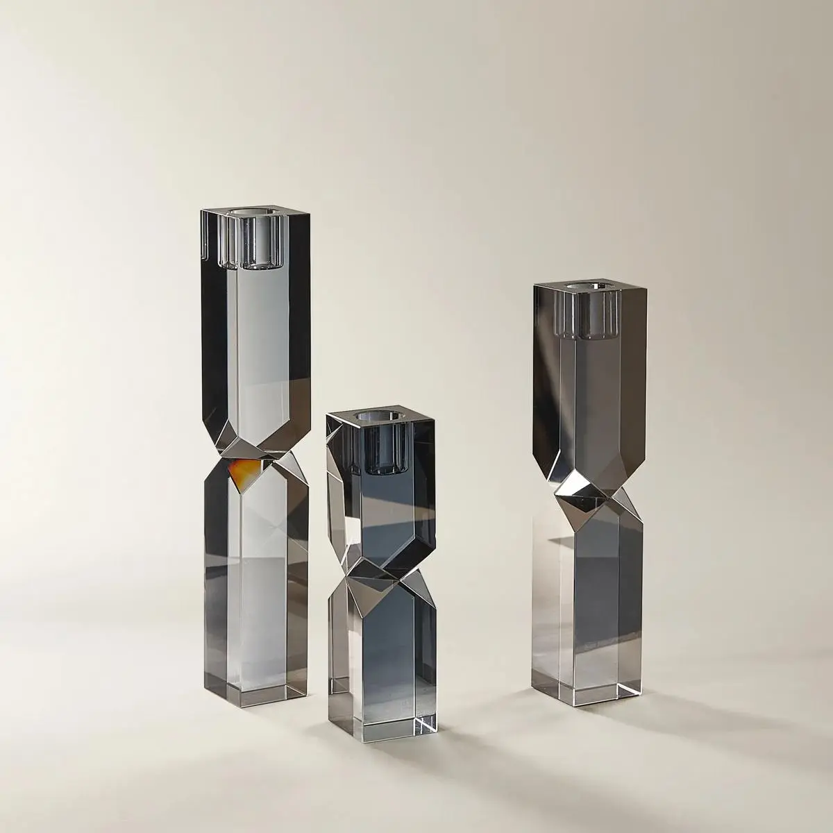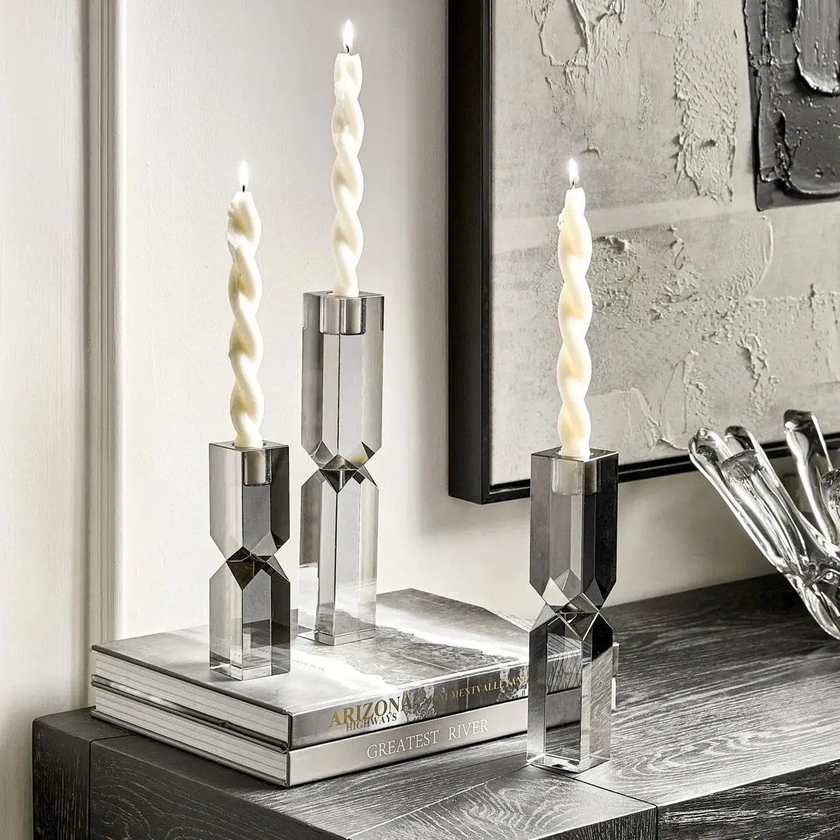 Sculptural and sleek, the Mythos Taper Holder brings bold dimension to your candlelight display. Crafted from mirrored graphite crystal glass, each geometric form plays with symmetry and light for a modern, architectural effect. Whether styled solo or as a collected trio, these taper holders add an elevated edge to mantels, consoles, or dining tables. Available in three sizes to layer or stand alone.