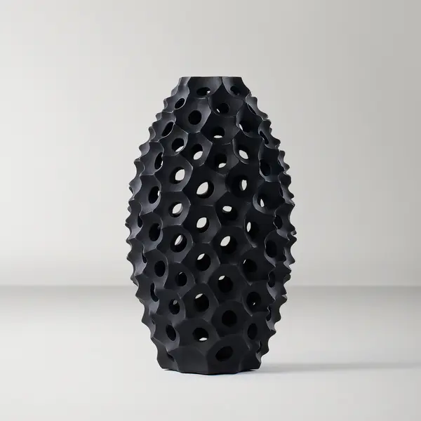 The Neo Vase is a versatile and stylish addition to any modern home. Its sleek black finish and intriguing aperture design make it a captivating conversation starter. Displayed alone or paired with its larger counterpart, the Neo Vase adds a touch of unexpected drama to any space. Whether filled with fresh flowers or simply admired for its artistic form, the Neo Vase is a unique and captivating piece.