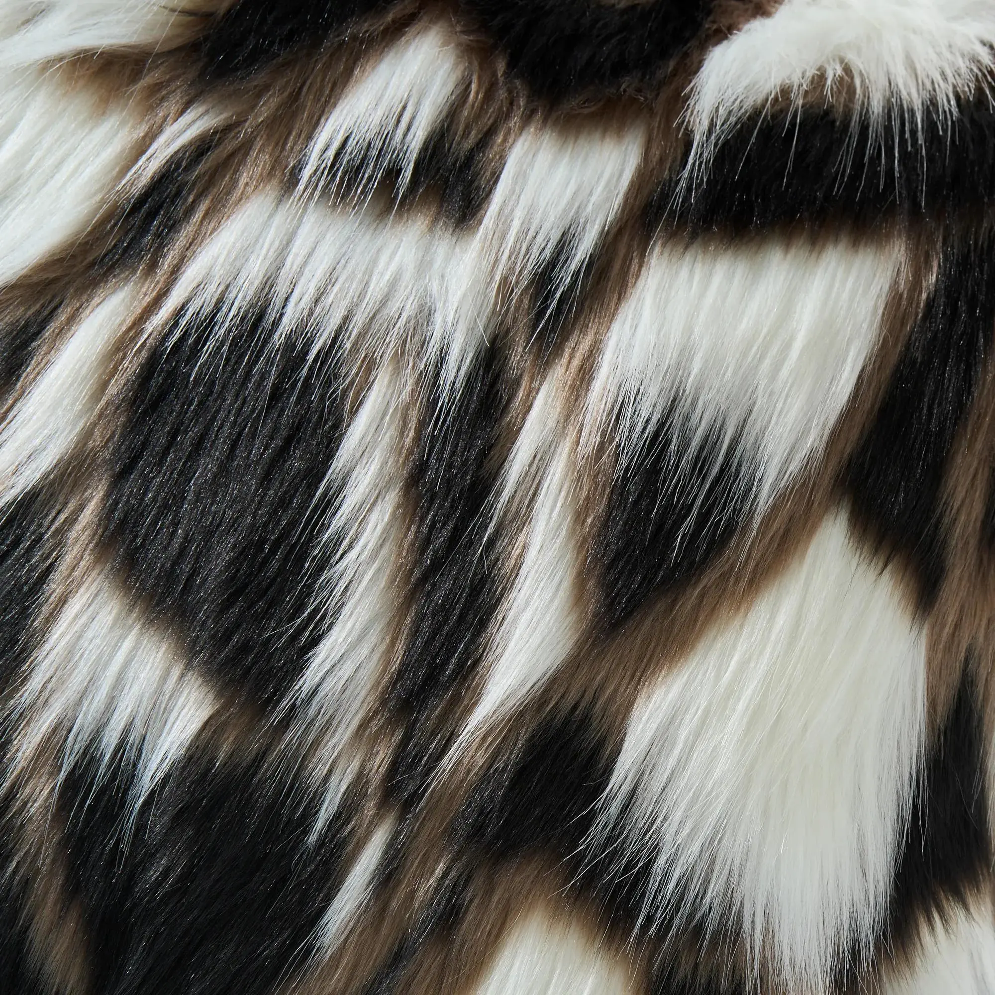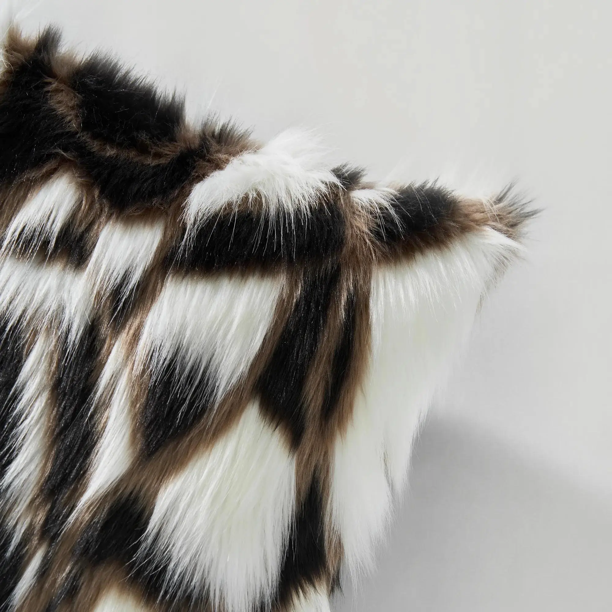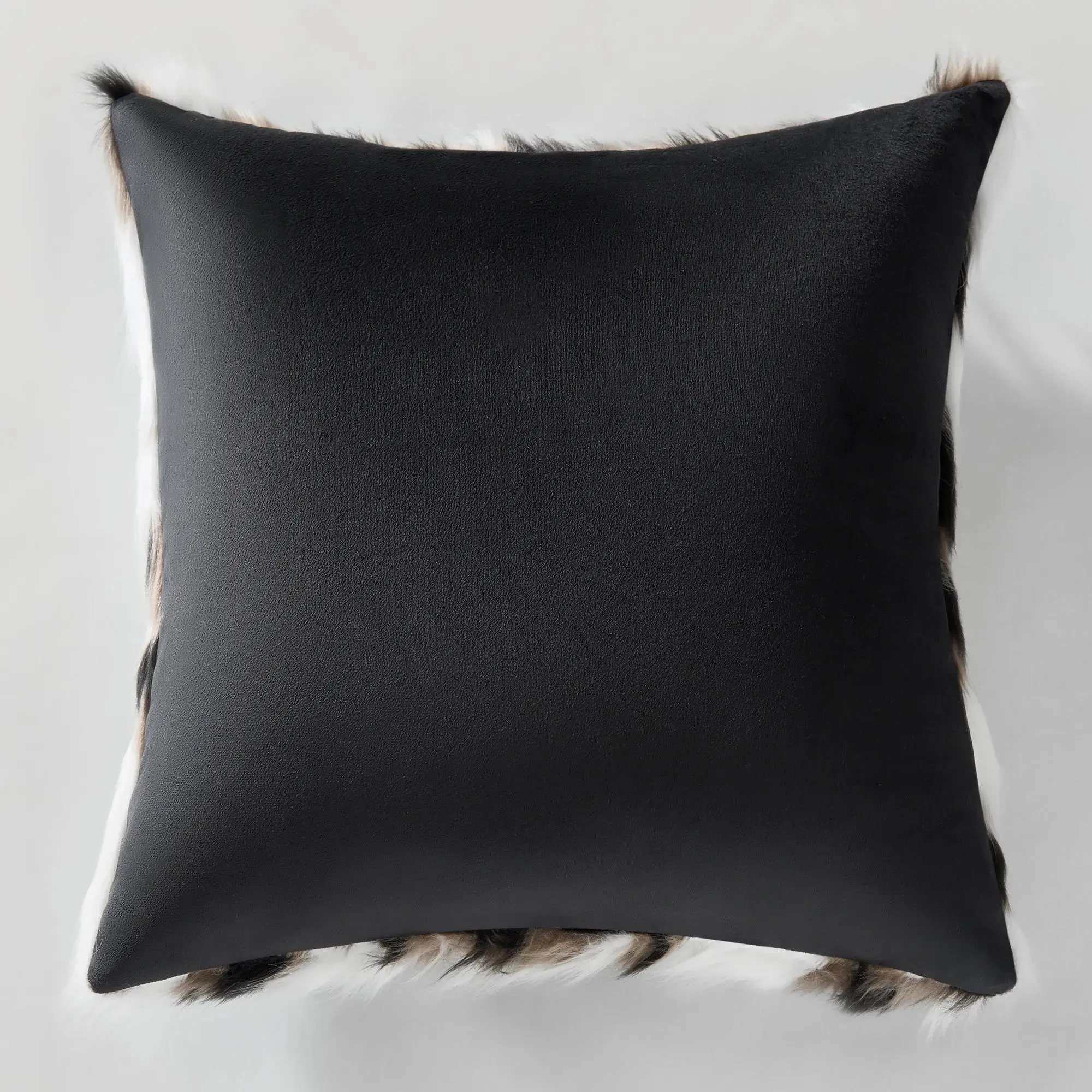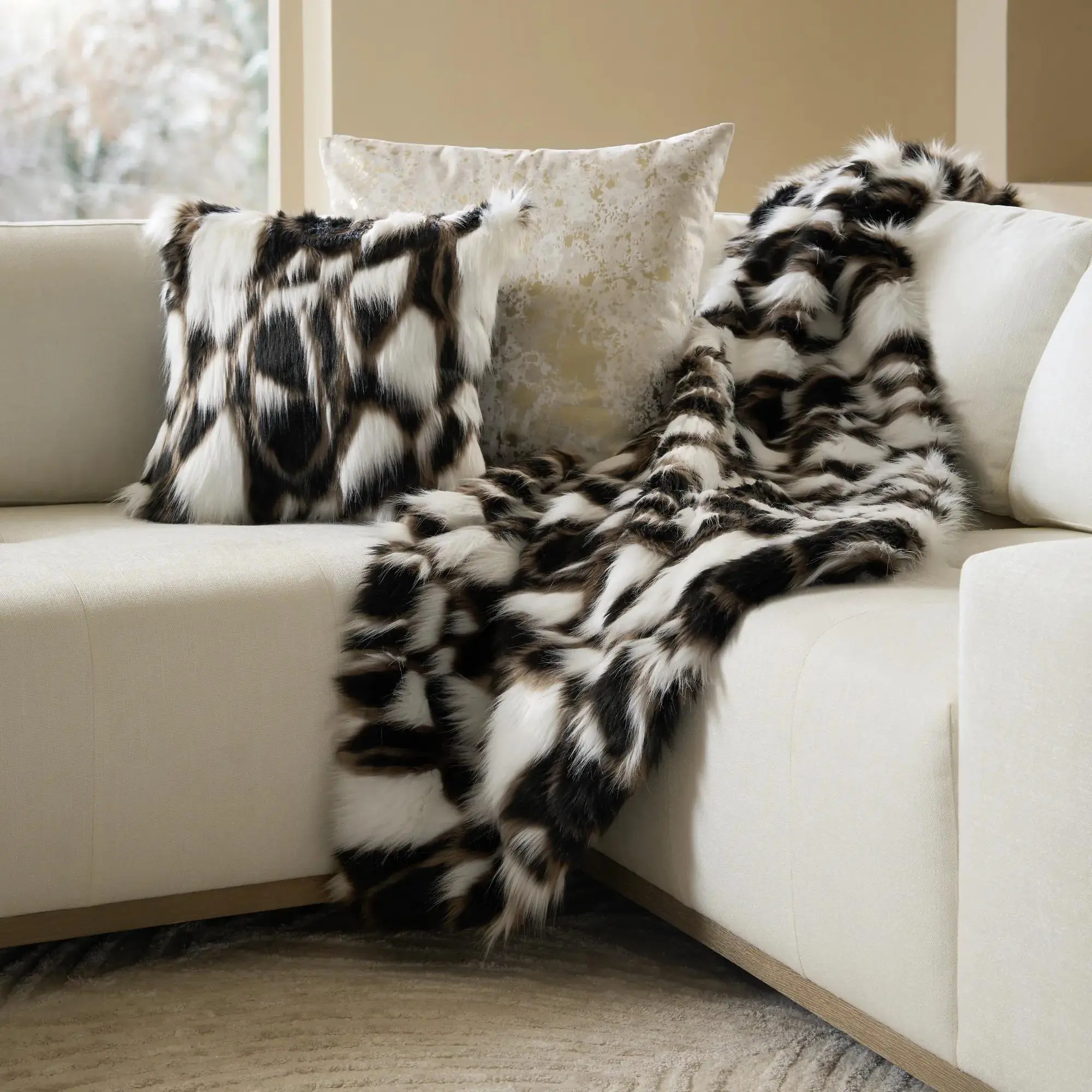 Our Neve faux fur pillow boasts an exceptionally soft feel. Featuting a spotted black, brown and white design. It beautifully captures the warmth and opulence of genuine fur, while delivering unmatched comfort and timeless elegance.