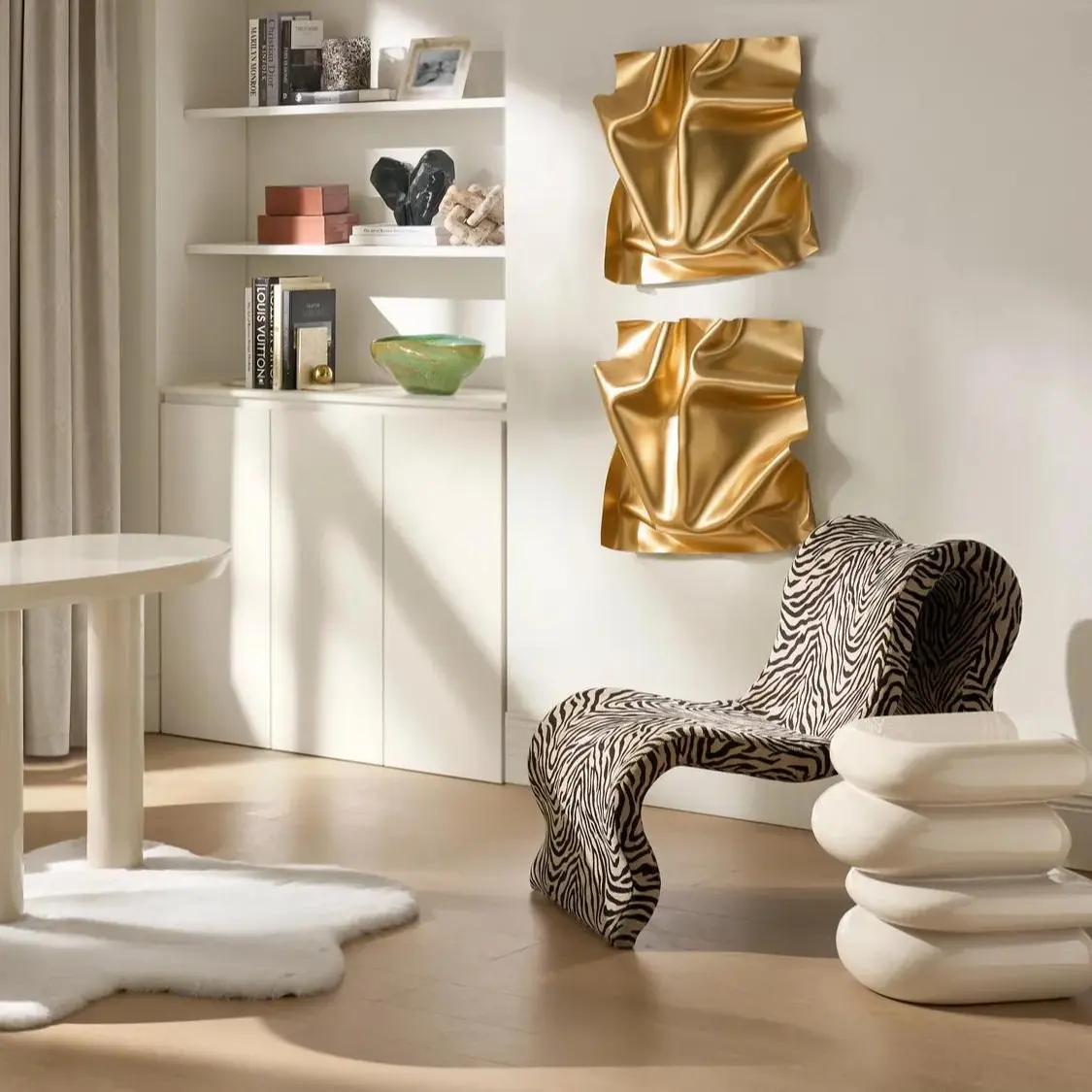 Cast in sculptural acrylic with hand-applied gold leafing, the Surface Gold Wall Art is a dimensional wall panel with a richly crumpled relief that catches and bends light. The faceted surface projects softly from the wall, creating shifting highlights and shadows that read like molten metal, turning even a narrow stretch of wall into a focal, gallery-inspired moment.