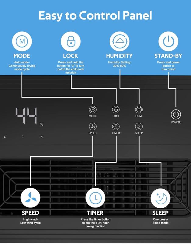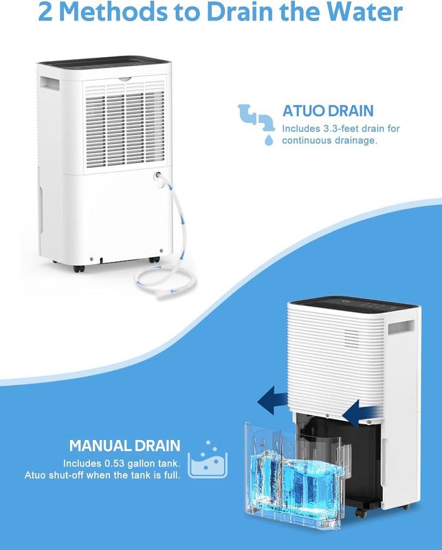 【Smart Touch Control】: This dehumidifier is equipped with an LED display that can accurately display the current humidity (RH) and a 3-color humidity display light ring. 3-color humidity display aura range: blue (, 4 Liter Water Tank: This dehumidifier is equipped with a spacious 4-liter water tank that automatically shuts off when the tank reaches full capacity to prevent overflow.