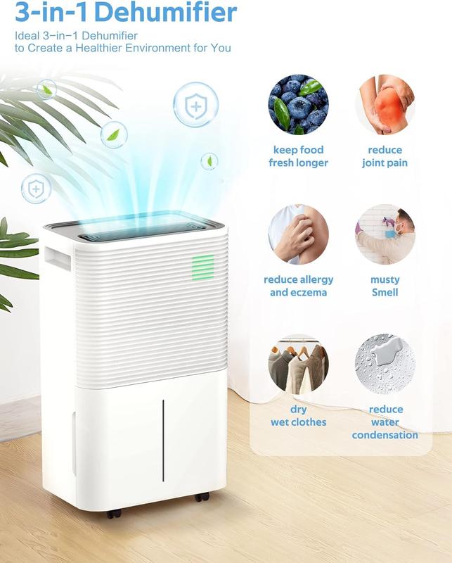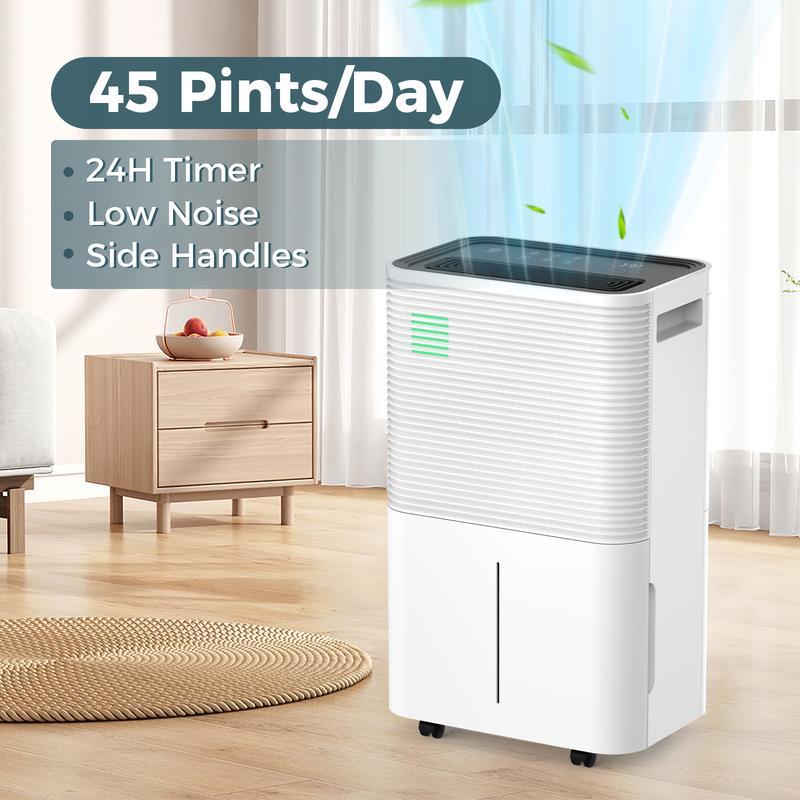 【High Performance Dehumidifier】: Our 13.78*9.25*22.83in dehumidifier removes up to 50 pints (at 95°F, 90%RH) of moisture every 24 hours, covering up to 4,500 square feet and regulating humidity from 80% to 30%. It is a powerful dehumidifier with a small size, suitable for basements, offices, bathrooms, bedrooms, kitchens, pantry, laundry rooms, etc.