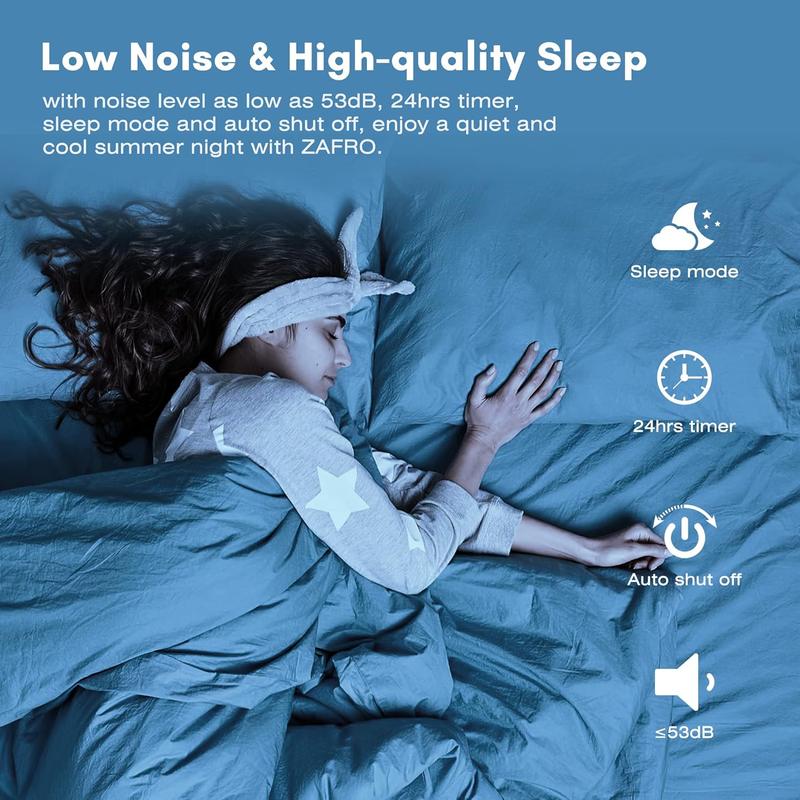 【Sleep Mode & Low Noise】ZAFRO mobile air conditioner can achieve low noise operation while efficiently cooling. The sleep mode that heats up by 2℉ per hour, combined with a brand compressor, can achieve low noise levels (≤ 52dB), bringing you cool and sweet dream on hot summer nights.