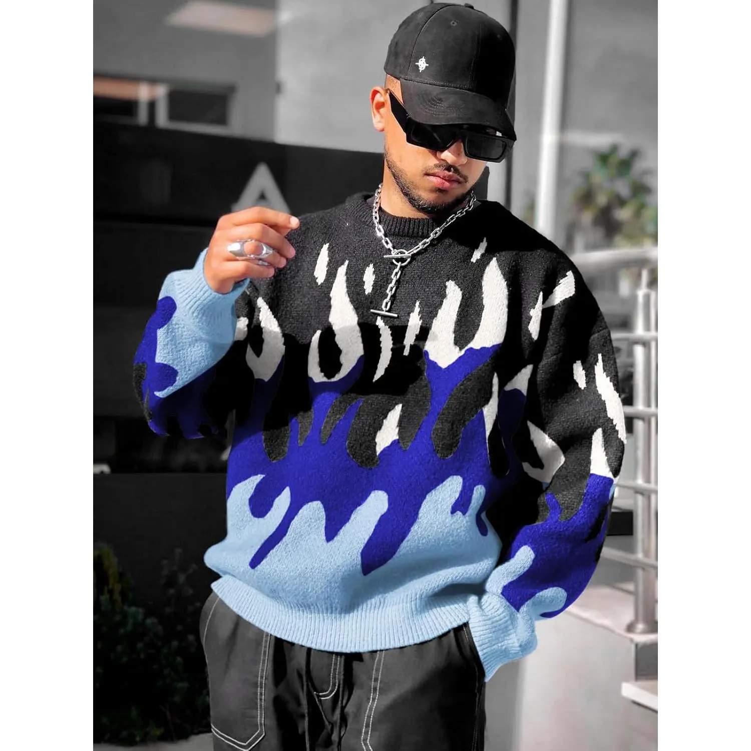 ·Features: Pullover sweaters for men with unique flame graphic, oversized knit sweaters, color block patchwork, long sleeve street wear.Vintage clothes makes you charming and cool.