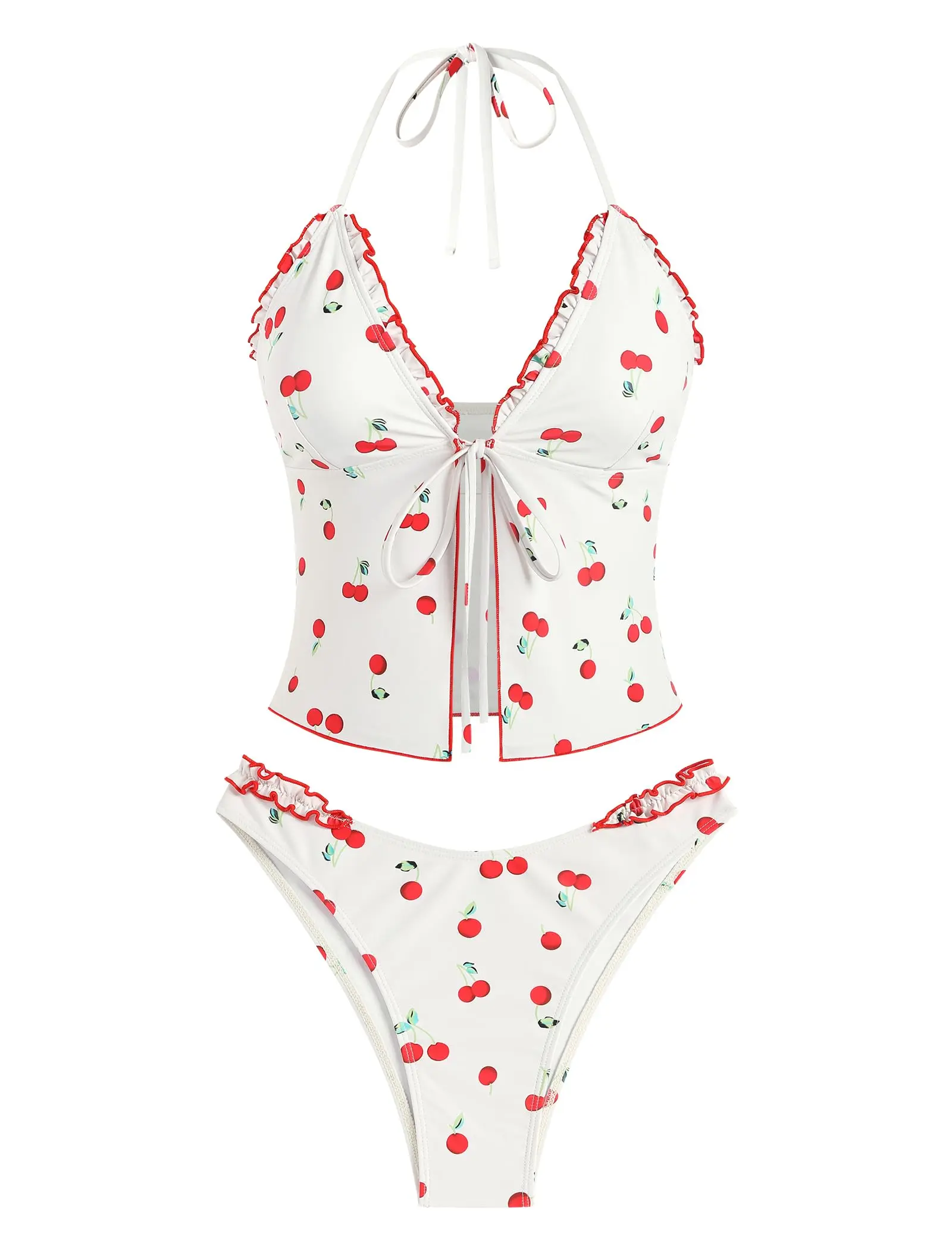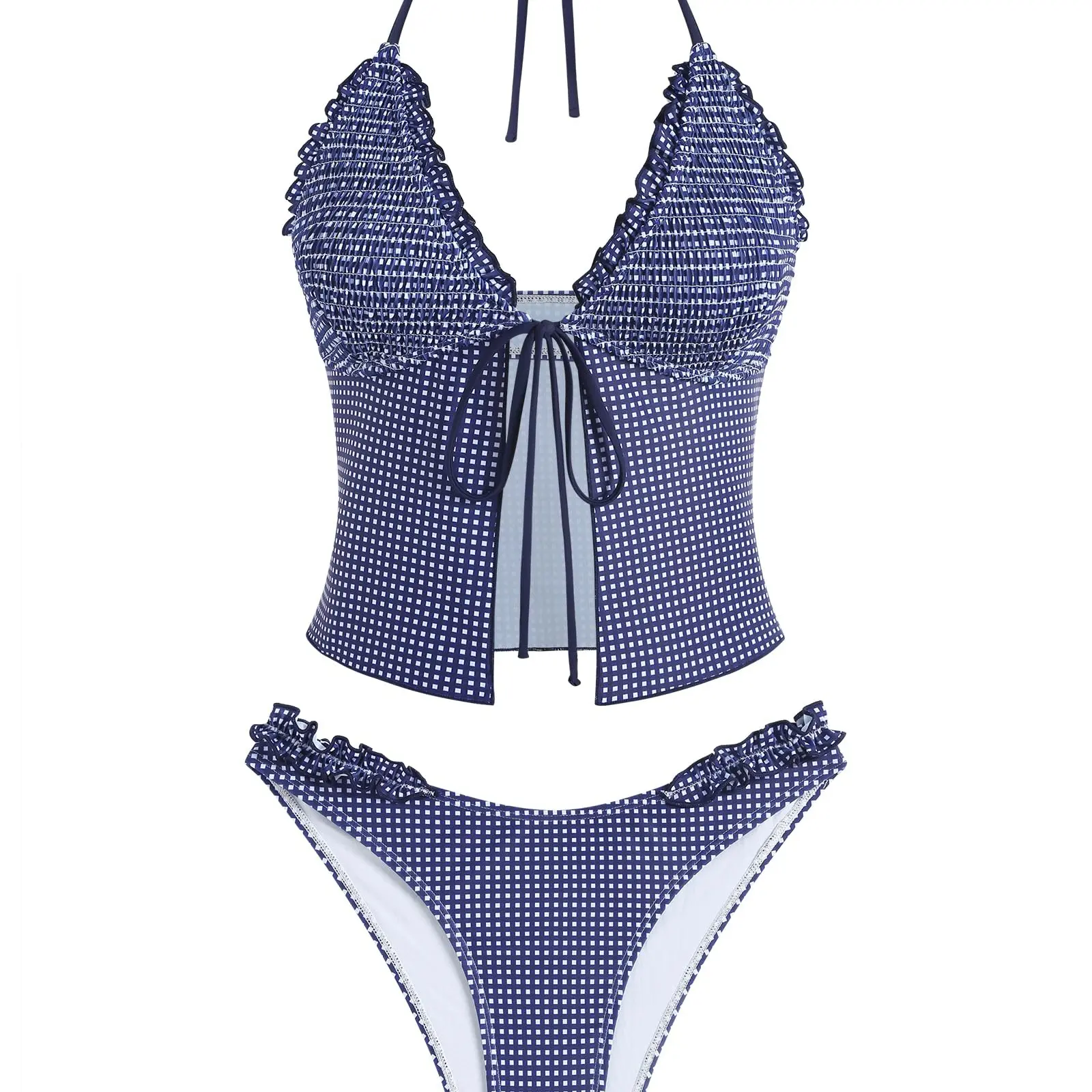ZAFUL Tankini Swimsuits for Women Smocked Ruffles Tie Front Bowknot Textured High Cut Tanga Tankini Set