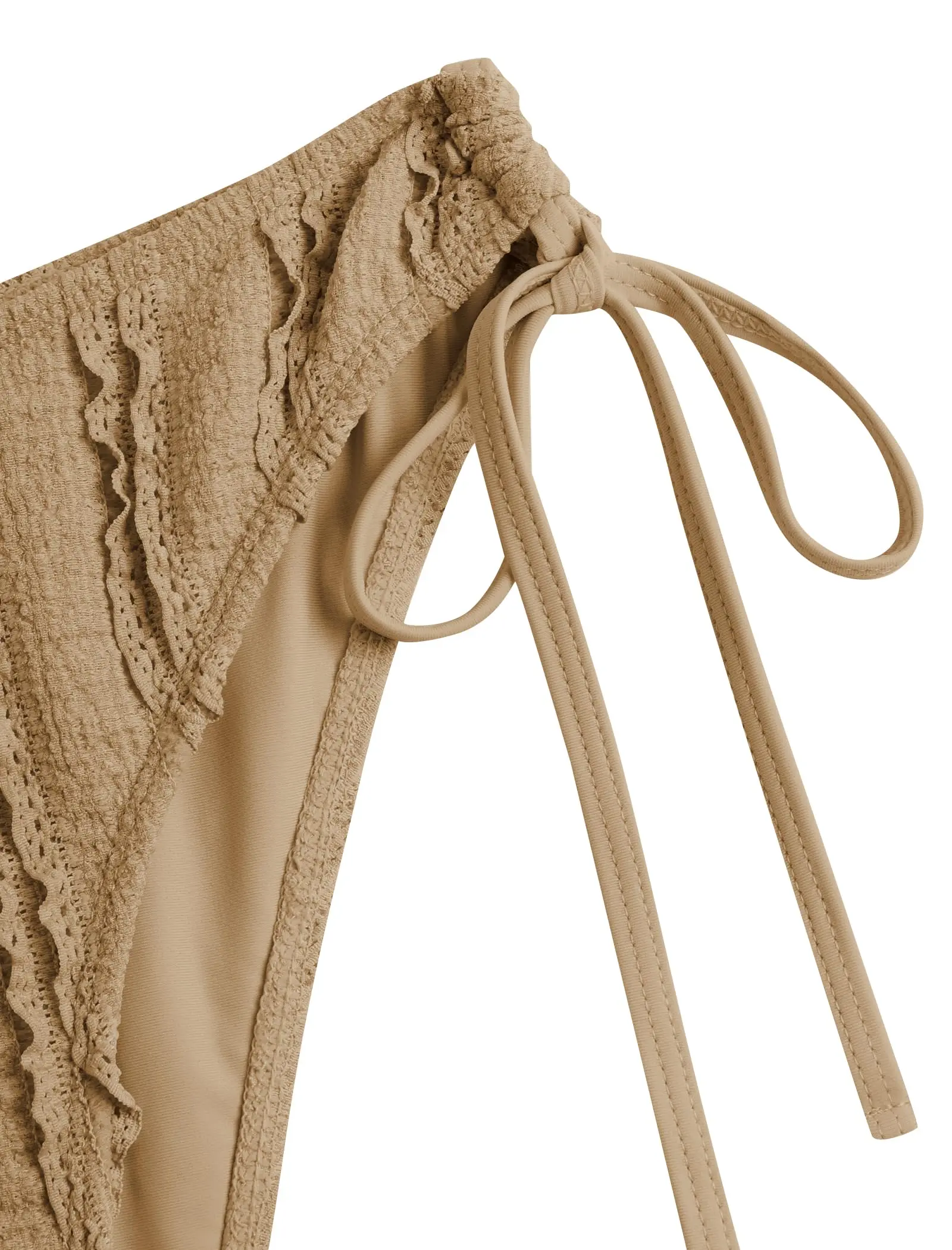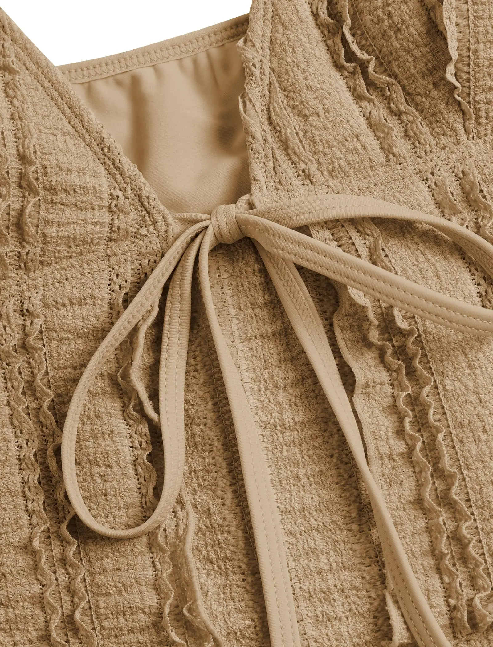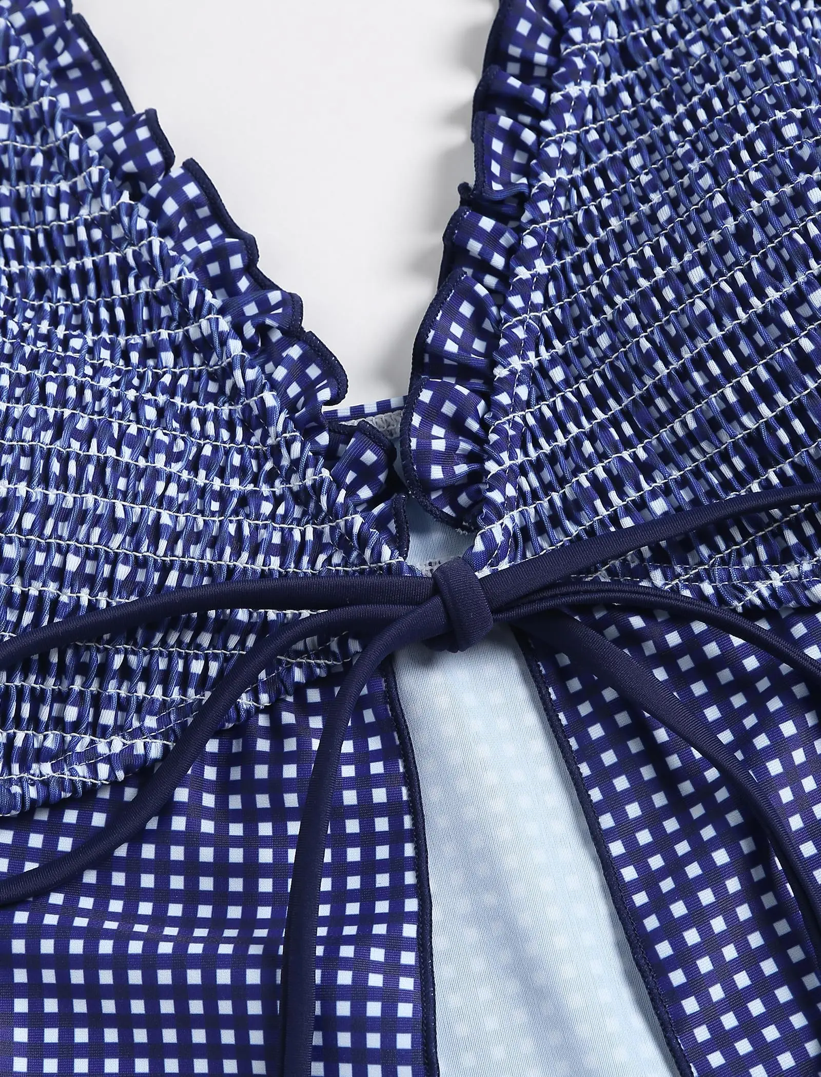 Smocked Ruffles Tie Front Bowknot Textured High Cut Tanga Tankini Set