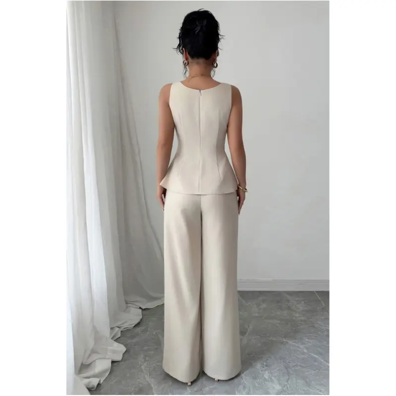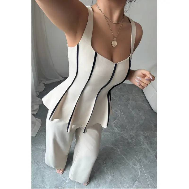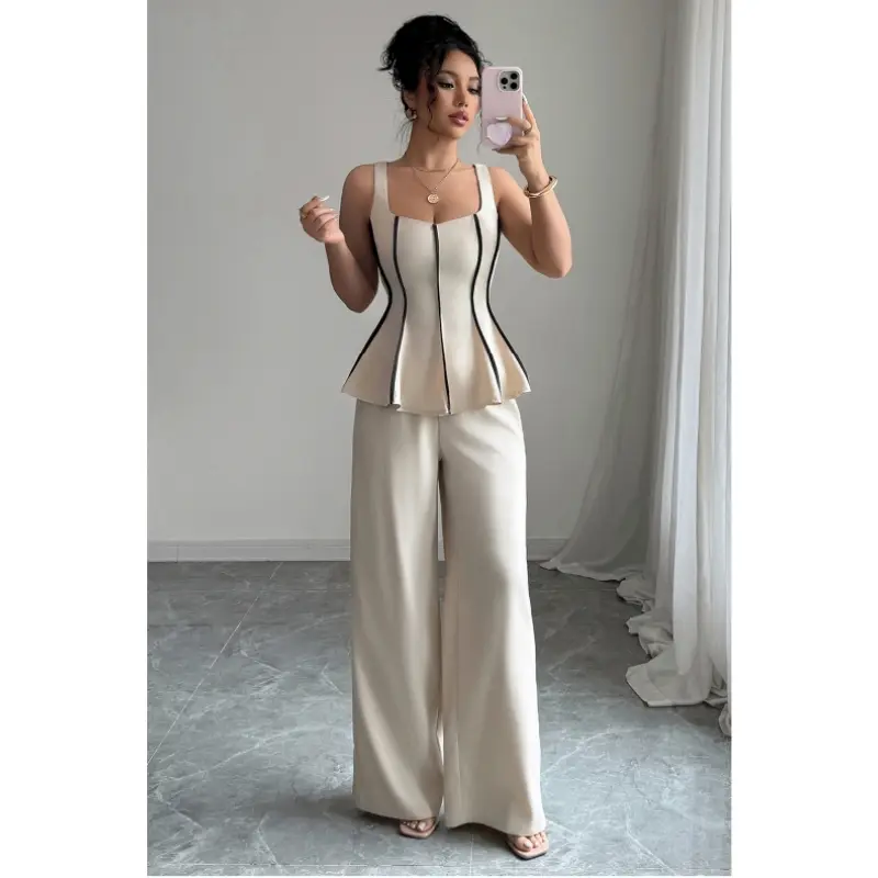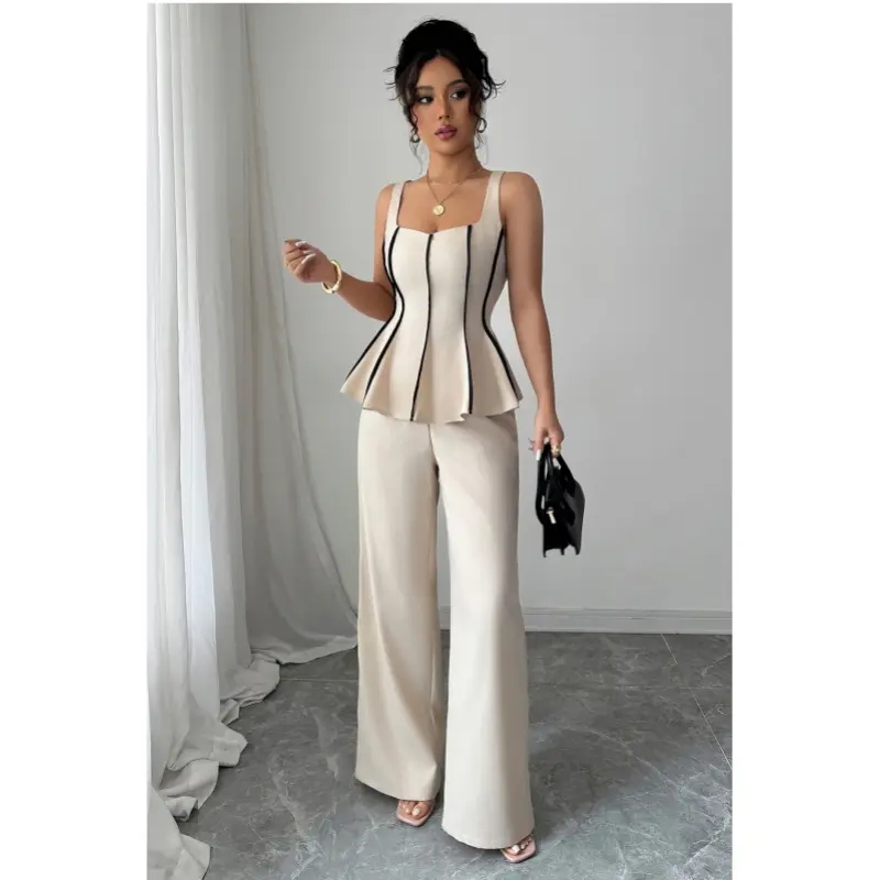 Features: 2 piece outfit for women, includes sleeveless peplum tank top and high waist wide leg pants. Figure-flattering waistline, contrast piping, crew neckline, and elegant drape design — ideal for chic and polished looks.