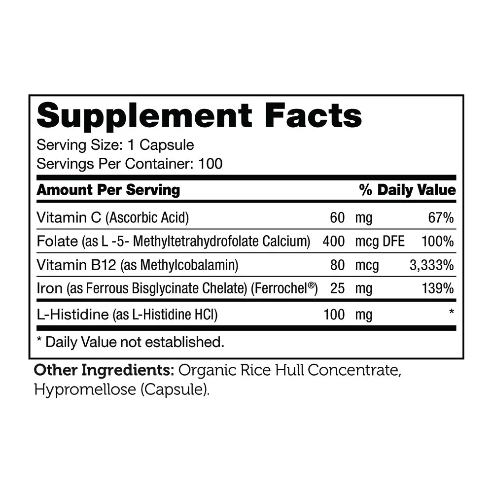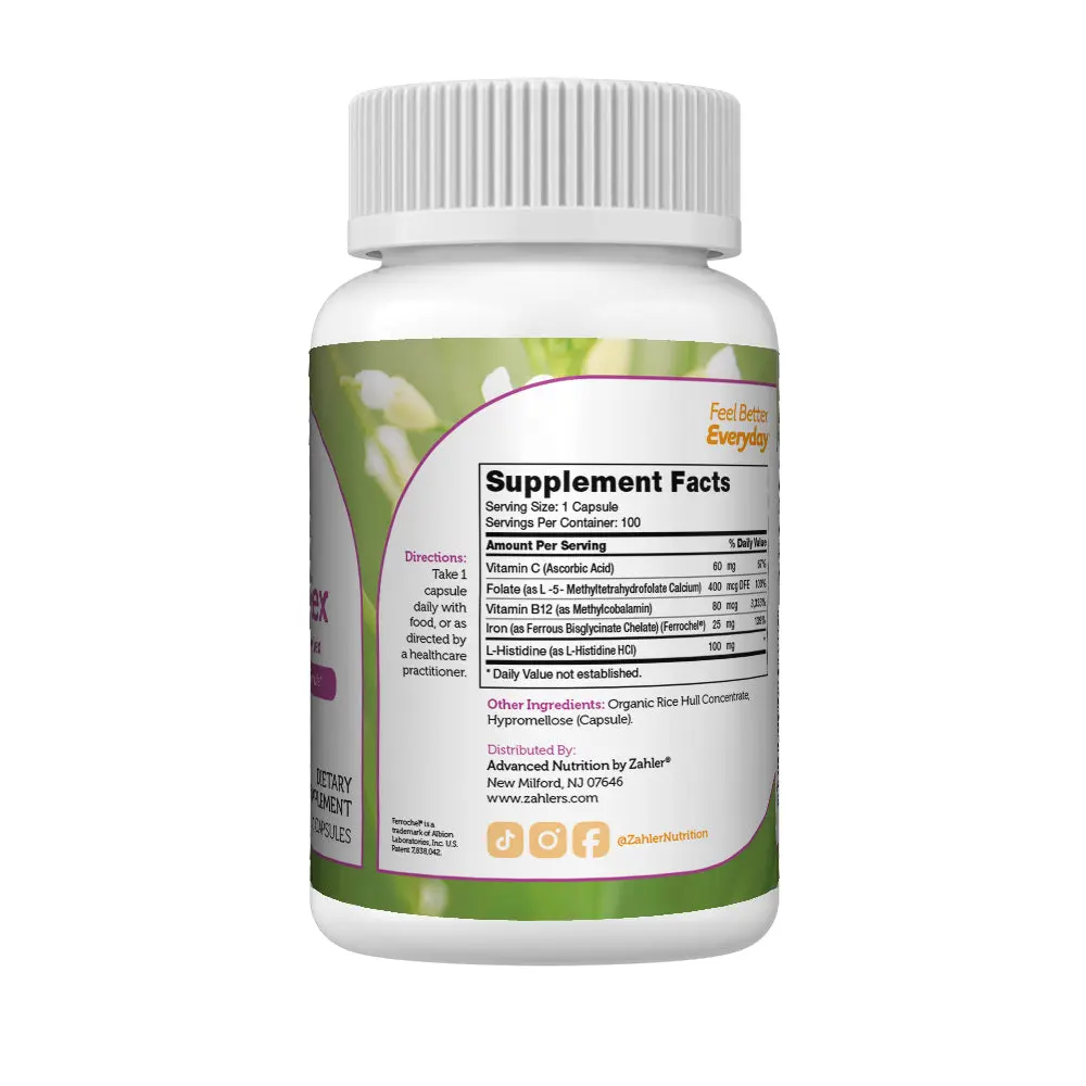 Each serving of Zahler's Iron Complex includes 25mg of Iron Ferrochel plus Vitamin C, B12, Folate, and L-Histidine. This blend ensures optimal absorption for both women and men. The formula supports your daily iron levels effectively.