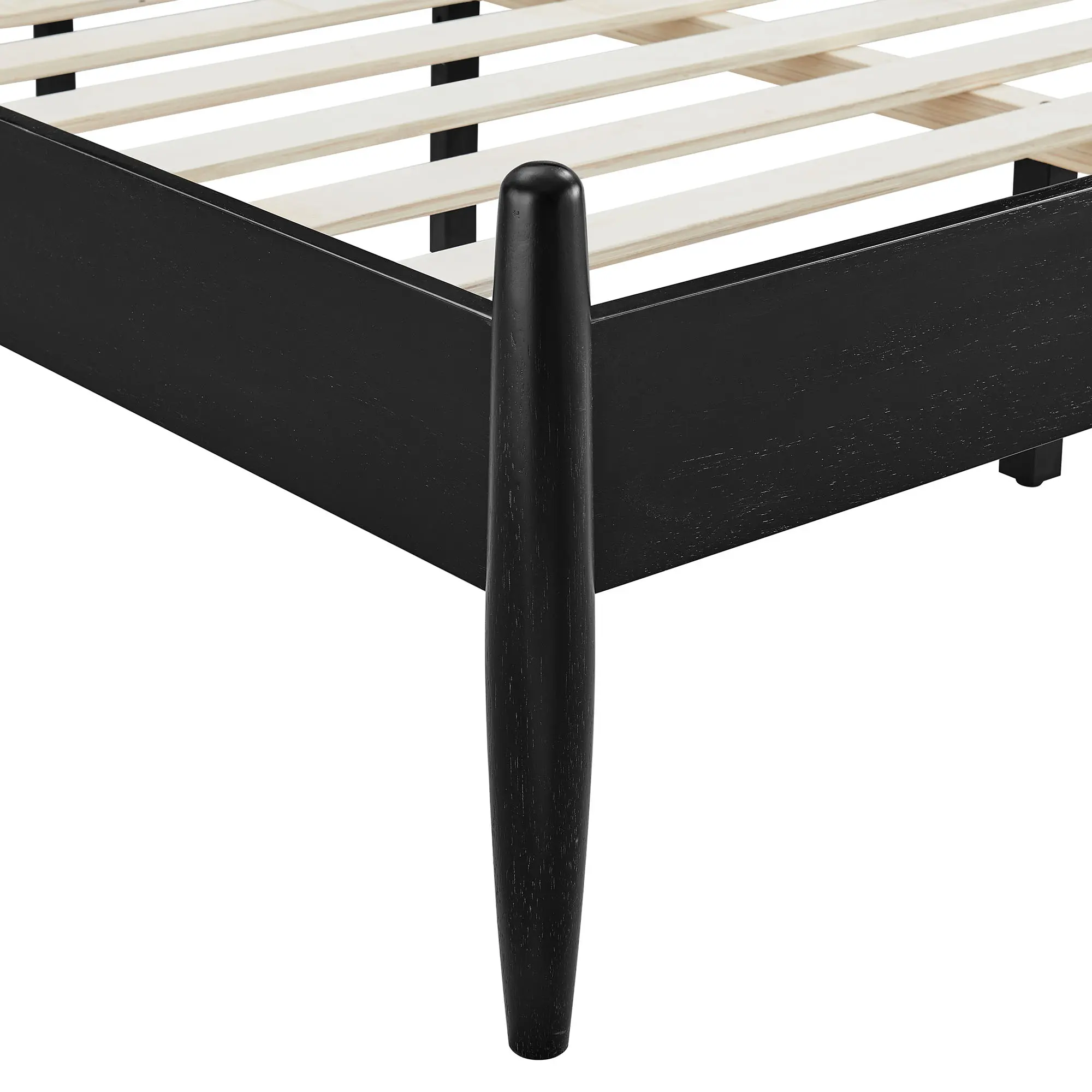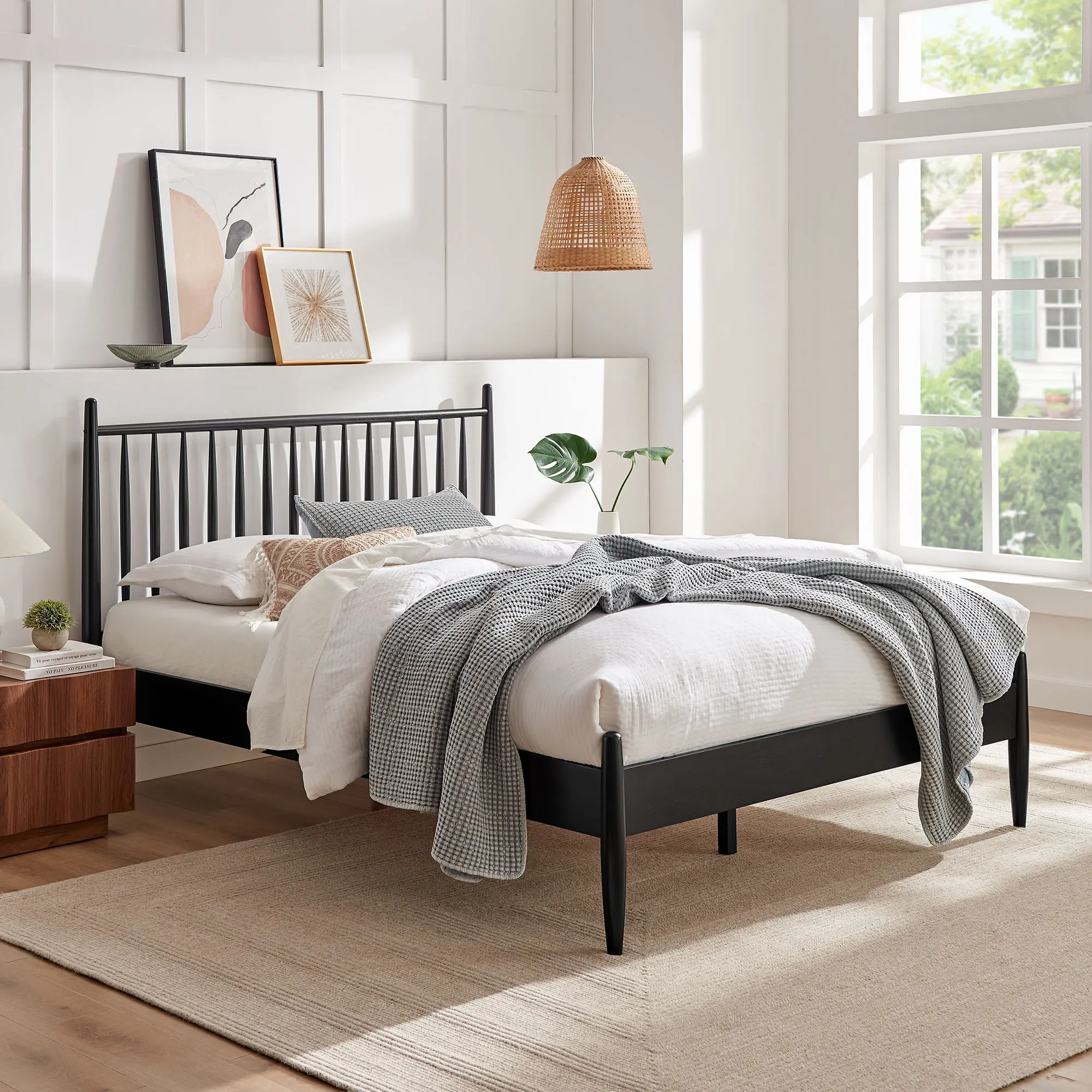 With classic lines and a modern, easygoing feel, the Zane Queen Size Spindle Bed brings a calm, tailored look to any bedroom. Crafted from durable rubberwood, this queen bed features a tall spindle headboard supported by smooth, rounded posts that taper gracefully toward the base for a clean, sculpted profile. Vertical rods keep the silhouette light, while the queen footprint makes it a comfortable fit for primary or guest rooms. Thoughtfully built for everyday living, the Zane queen platform bed frame includes sturdy wood slats that provide reliable mattress support—no box spring needed—bringing the timeless appeal of a midcentury modern platform bed to modern interiors. Weight Capacity: 800lbs.