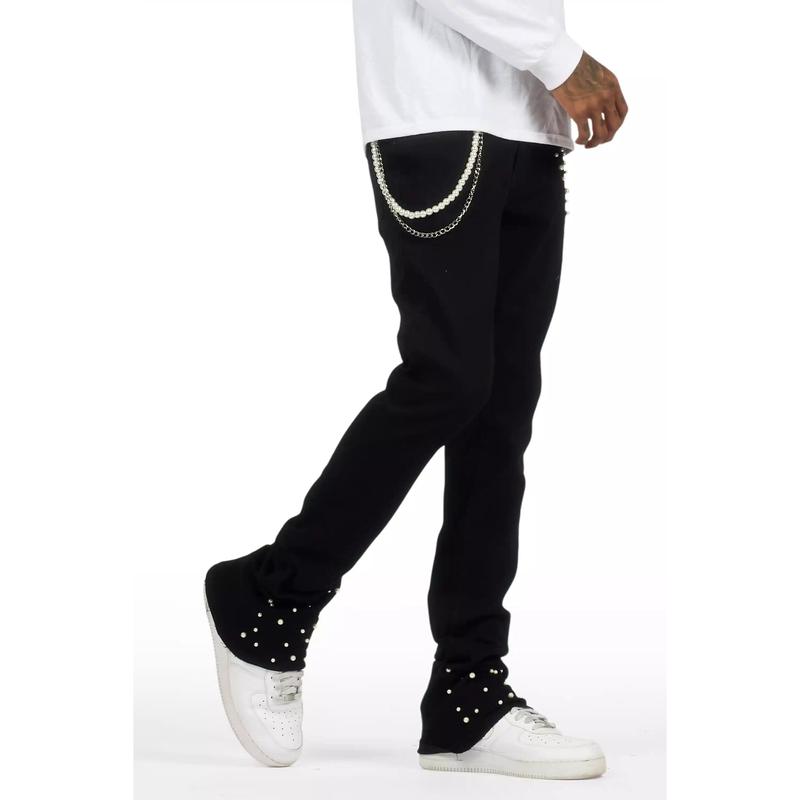 An  urban stacked denim jean for men in black. Designed with organic cotton and a modern bootcut flare fit for a must-cop staple piece.