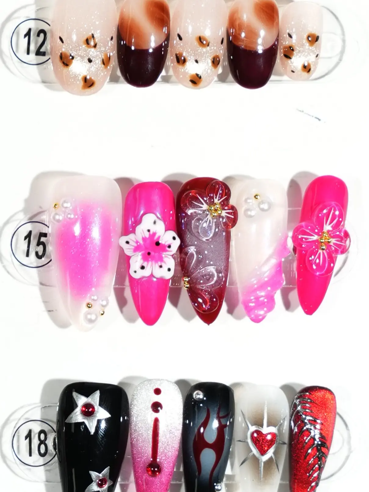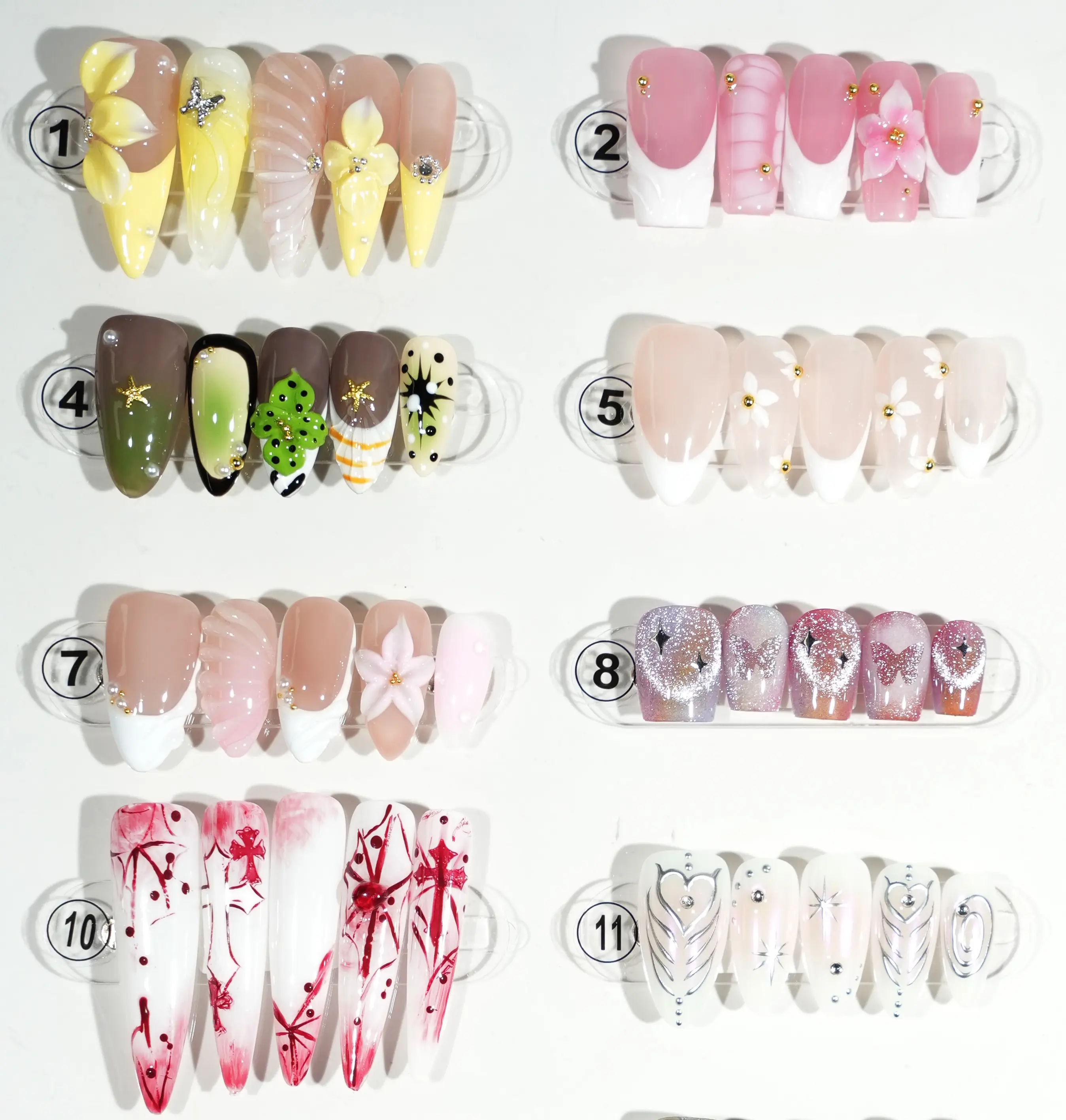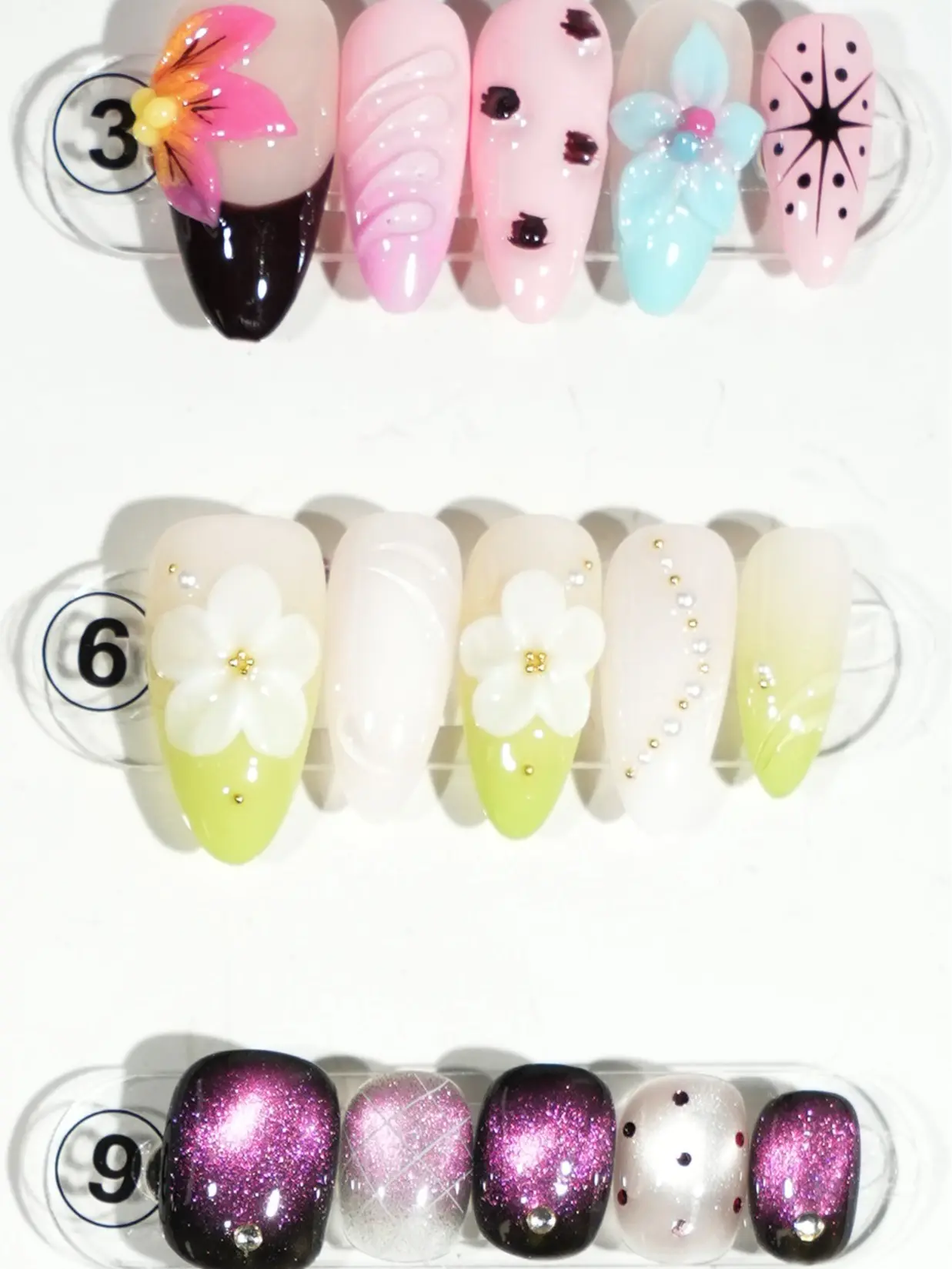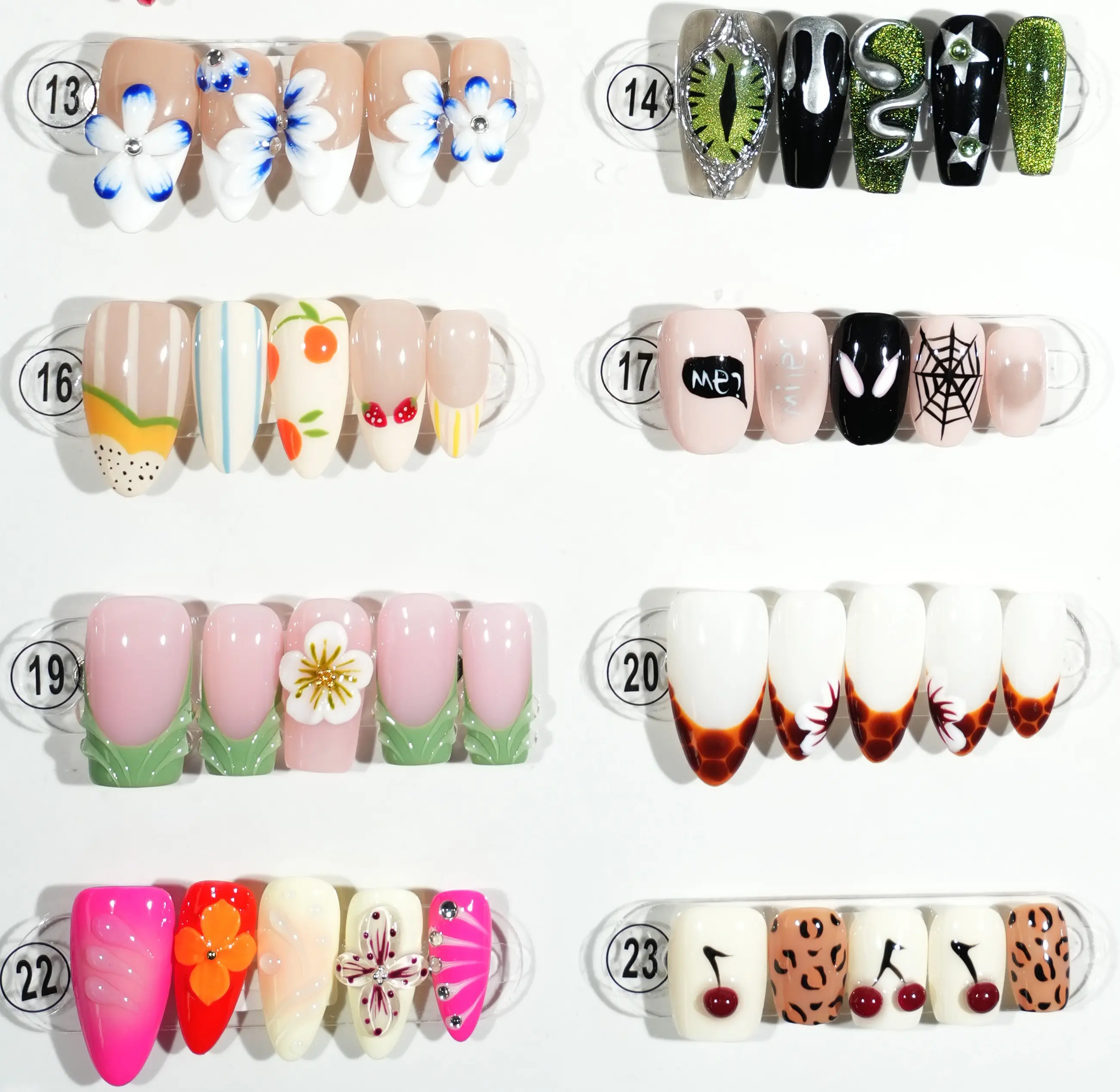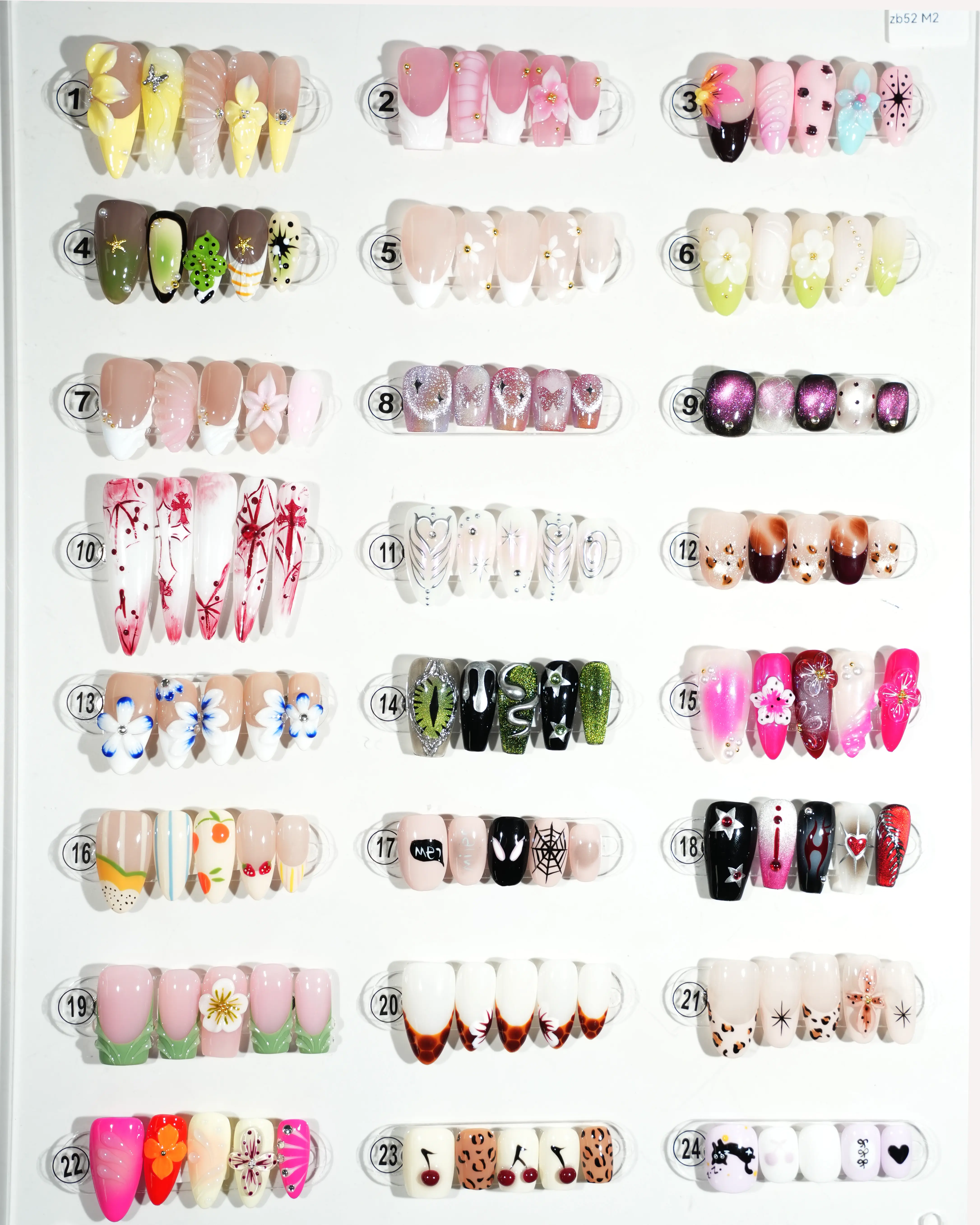 The exhibition board showcases 24 nail art designs in diverse styles, each radiating unique artistic flair and contemporary charm. Featuring innovative designs and vibrant colors, these nail art pieces range from classic patterns to modern abstract art, offering customers a variety of aesthetic experiences for their fingertips. Whether you prefer minimalist aesthetics or intricate designs, you'll find your perfect match here.The complimentary four-piece set contains jelly glue for DIY projects.