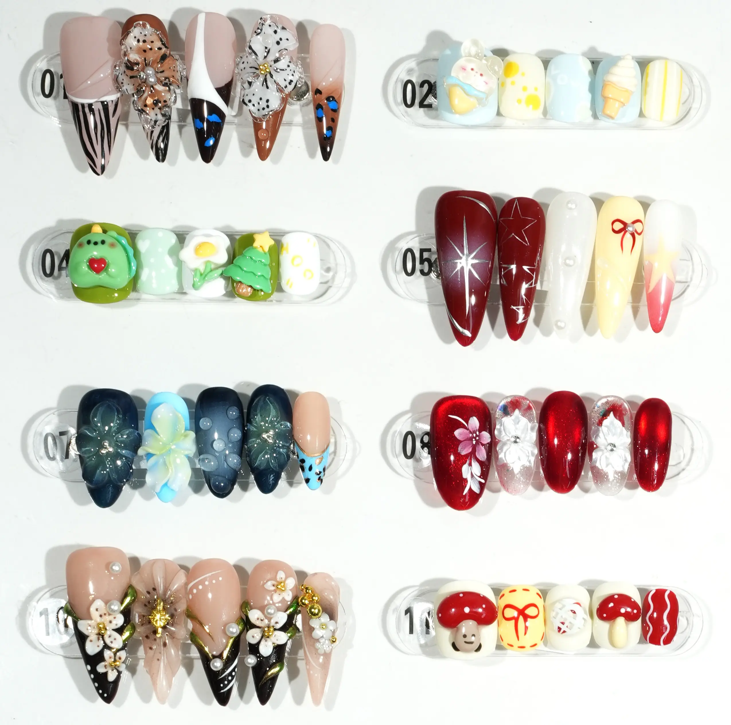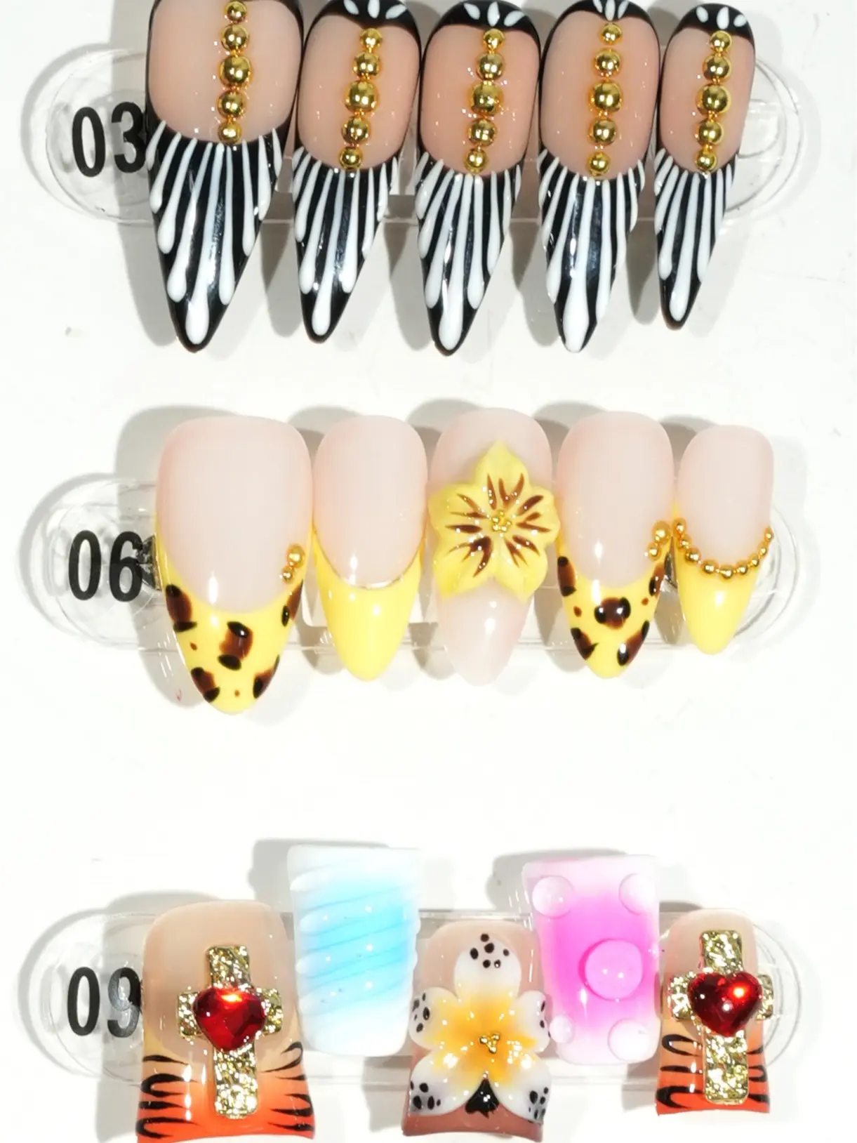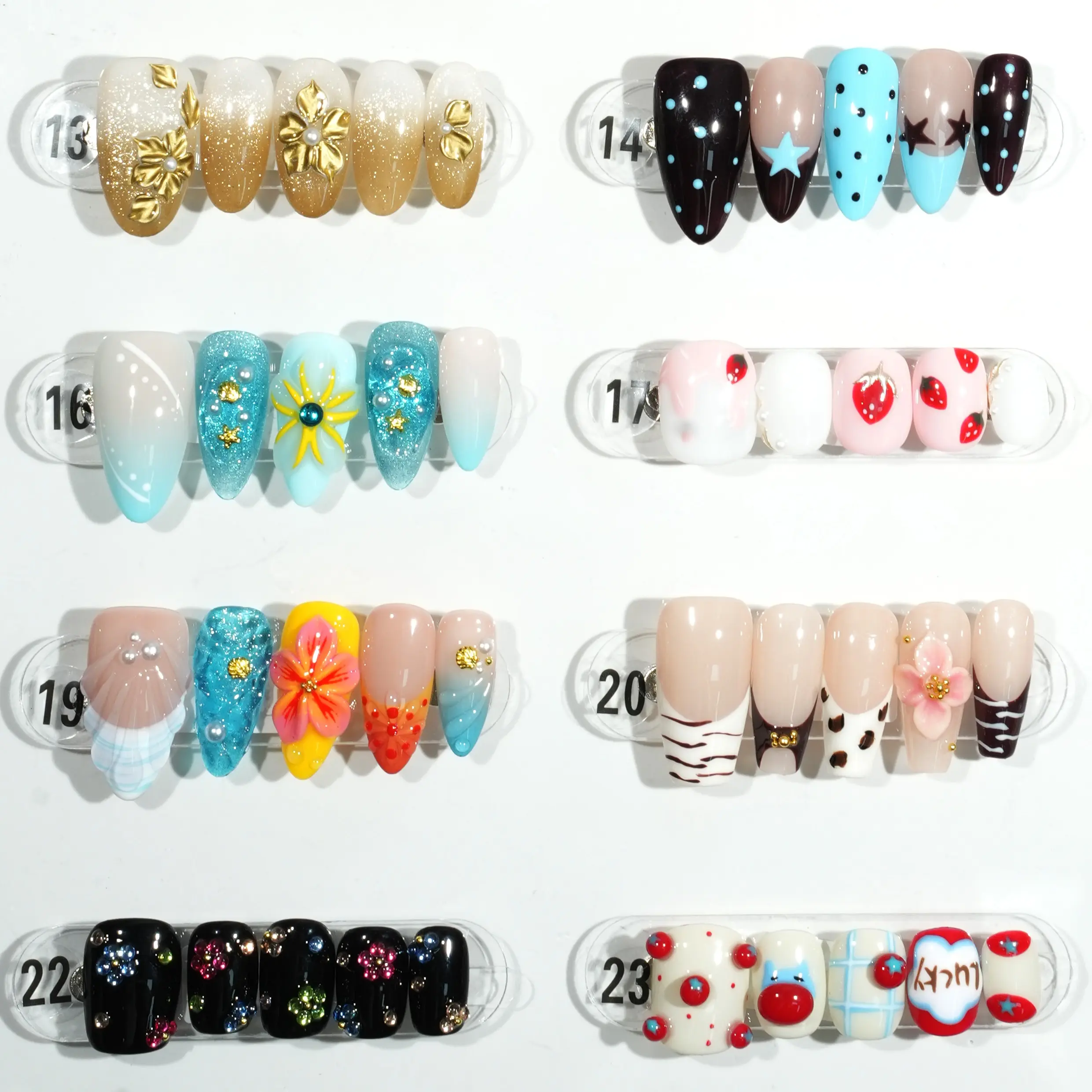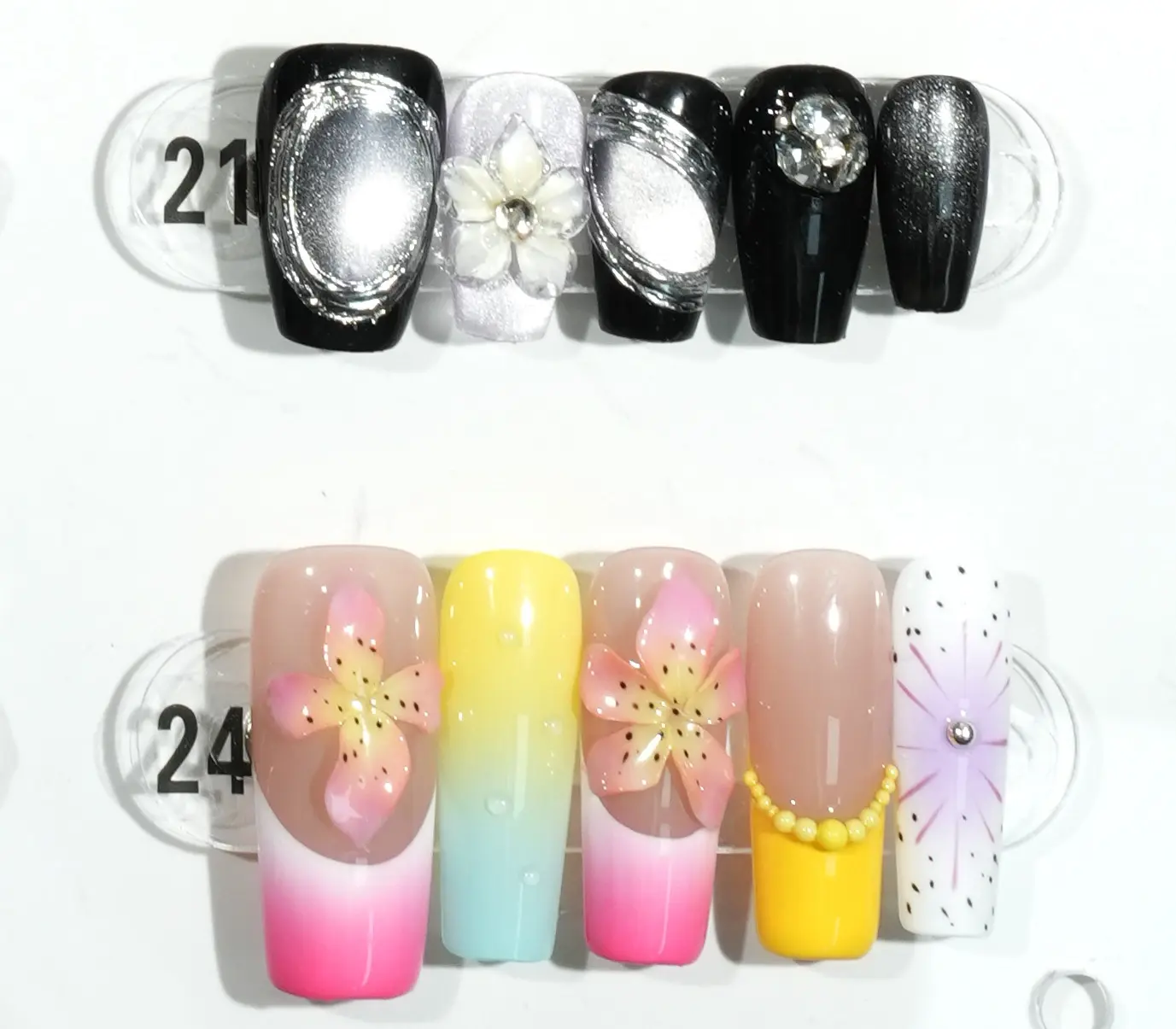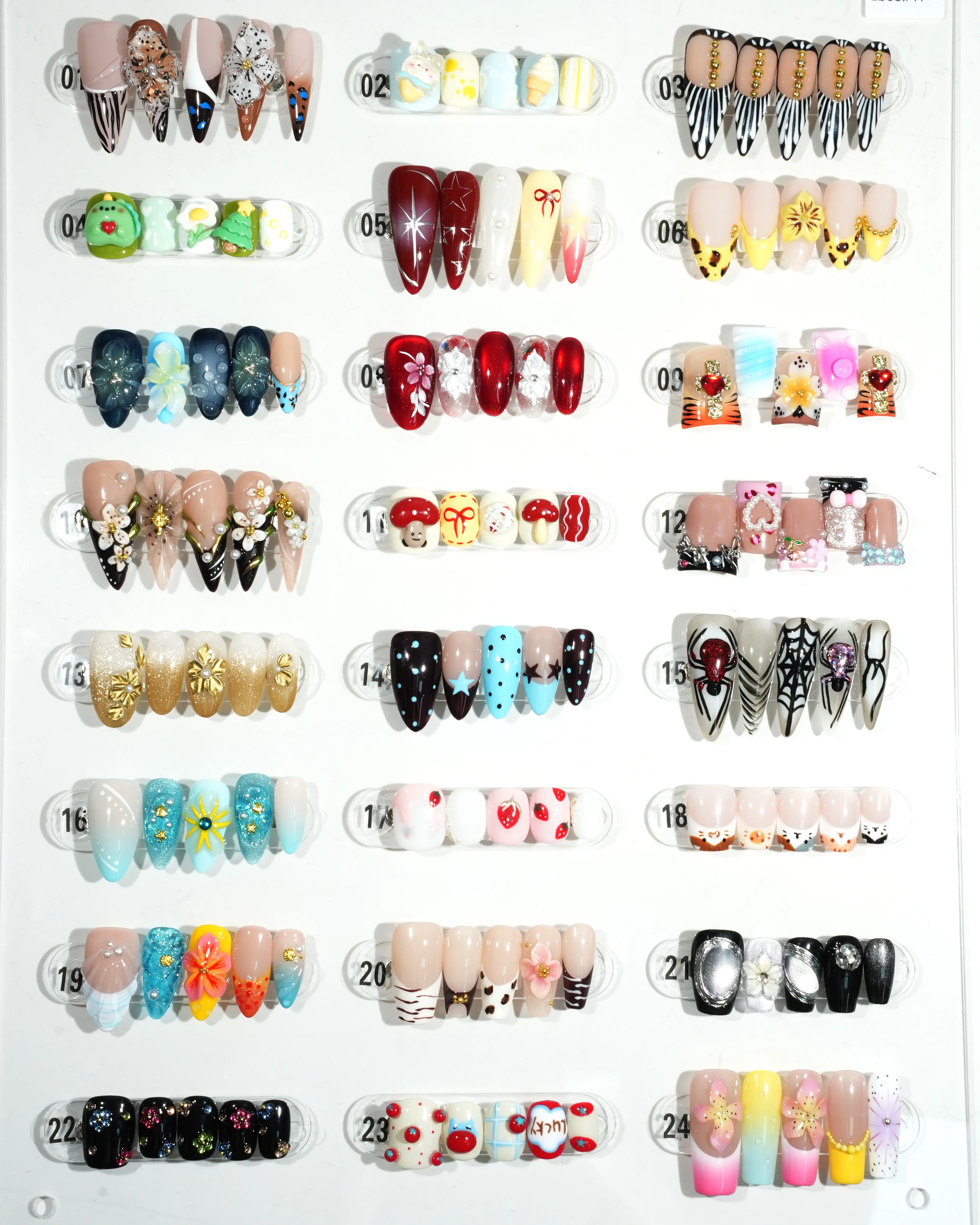 The display board showcases 24 nail art pieces in diverse styles. Each design incorporates unique elements like glittering sequins, hand-drawn cartoon characters, and geometric patterns, creating a vibrant aesthetic. These creations feature rich color palettes and meticulous details, making them perfect for various personalities and occasions.The complimentary four-piece set contains jelly glue for DIY projects.