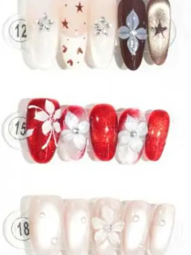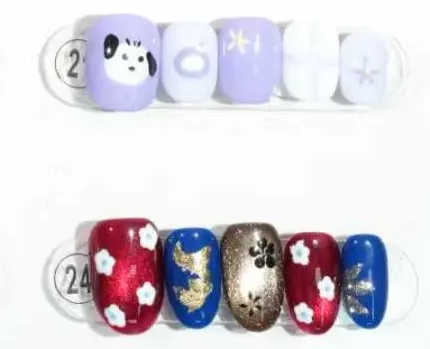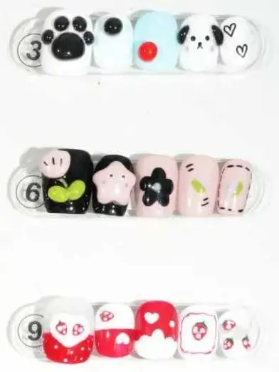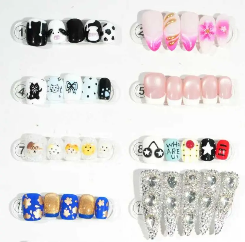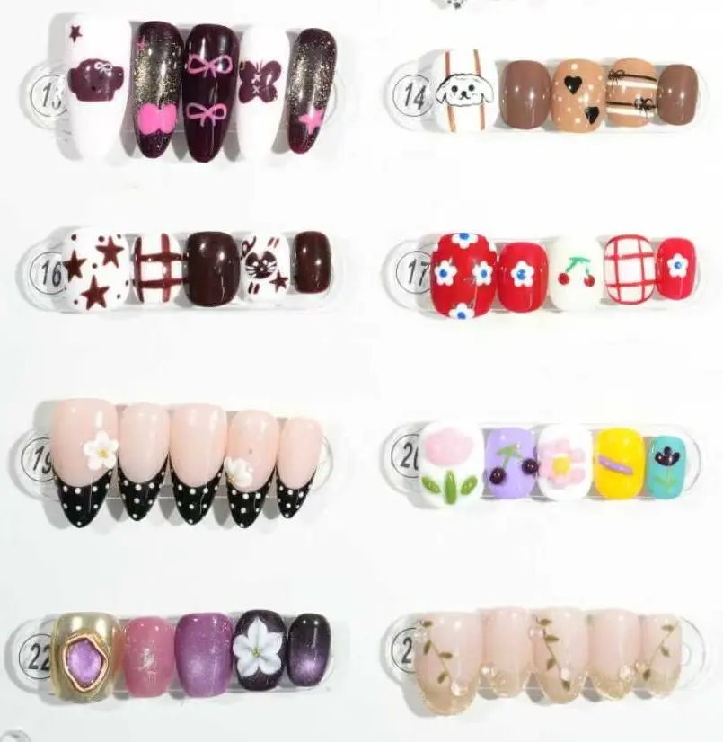 This display panel showcases 24 nail designs with diverse styles, each boasting unique features. The 11th design features a translucent nude base adorned with exquisite sparkling diamonds, exuding a minimalist elegance that dazzles with its rich texture. The remaining designs are vibrant and intricate, blending whimsical cartoon elements with delicate patterns. Their full color gradations create sophisticated yet timeless looks, perfectly suited for everyday wear and various occasions.The complimentary four-piece set contains jelly glue for DIY projects.