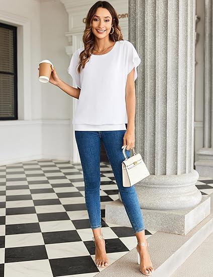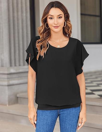 ·[Blouses Features]: This dress shirts for women features crew neck, chiffon material, short ruffle sleeves, batwing dolman sleeves, mesh layers, regular fit, flowy loose, solid color, casual and business style, providing you with an elegant and charming look.