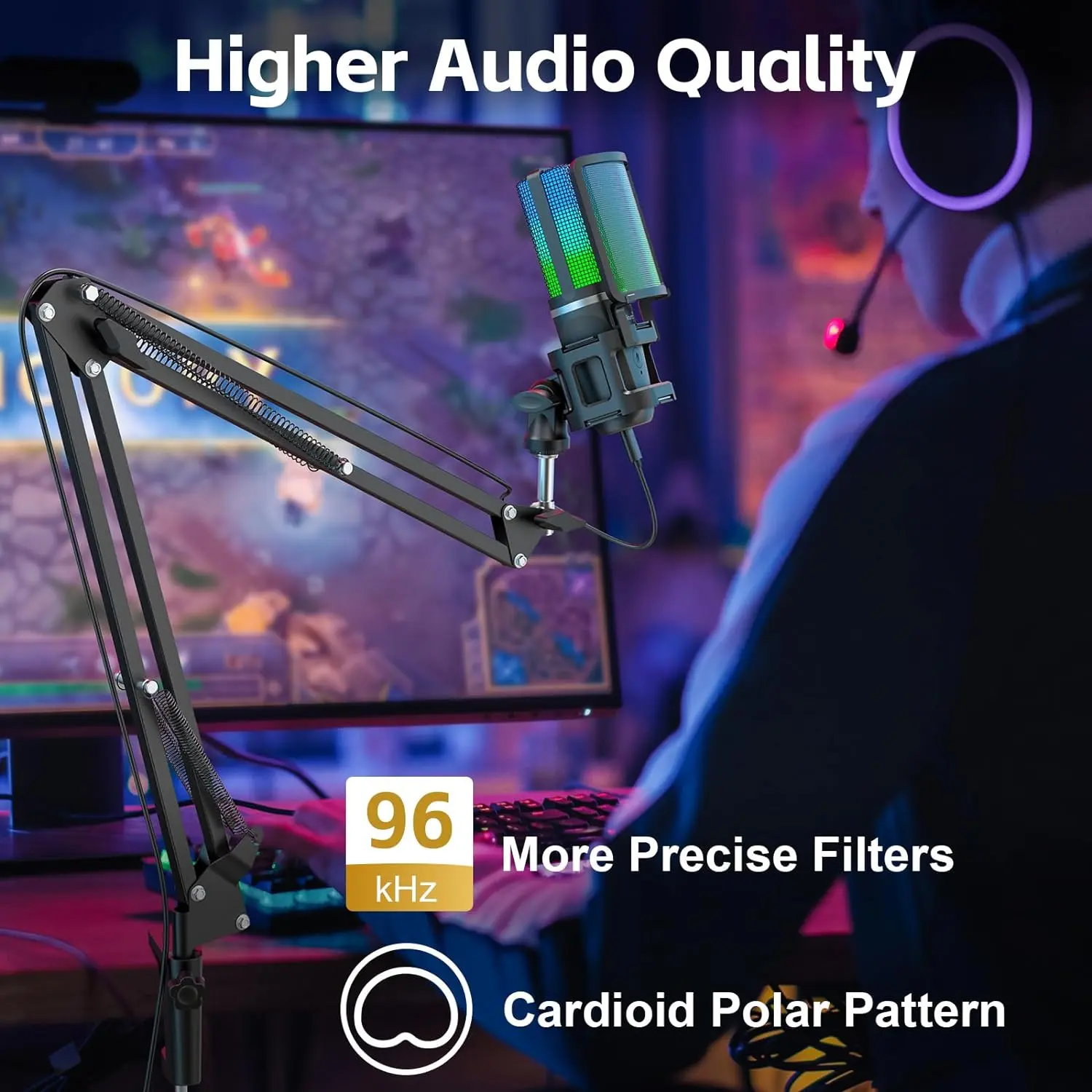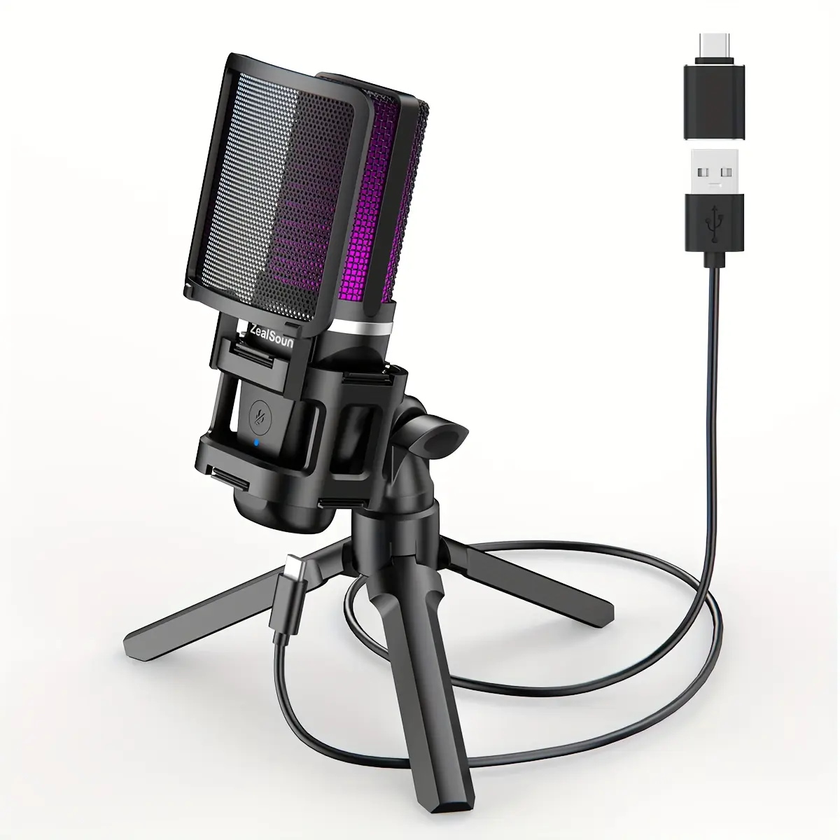 【High-Fidelity Capture】Unleashing the Power of the 96kHz Microphone. This 96kHz RGB USB microphone for phone captures every nuance of your voice, ensuring superior sound quality. Its Cardioid pickup pattern adeptly eliminates background noise. The addition of a shock mount and detachable pop filter enhances your recording sessions, elevating them to sonic excellence. The collapsible mic tripod stand is now extended and enlarged, offering increased stability on your gaming desk, minimizing vibrations for an enhanced recording experience.